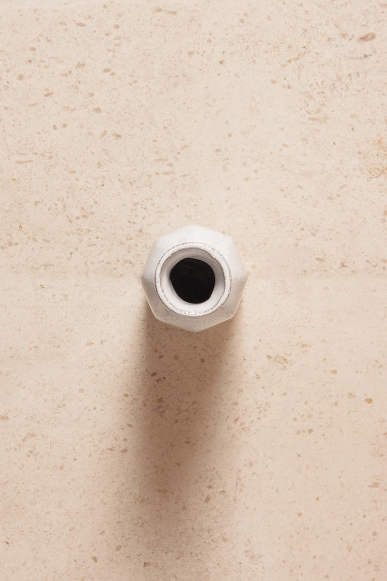 Petite milk bottle style ceramic vase by Astier de Villatte. A delicate little vessel for housing a single bloom.