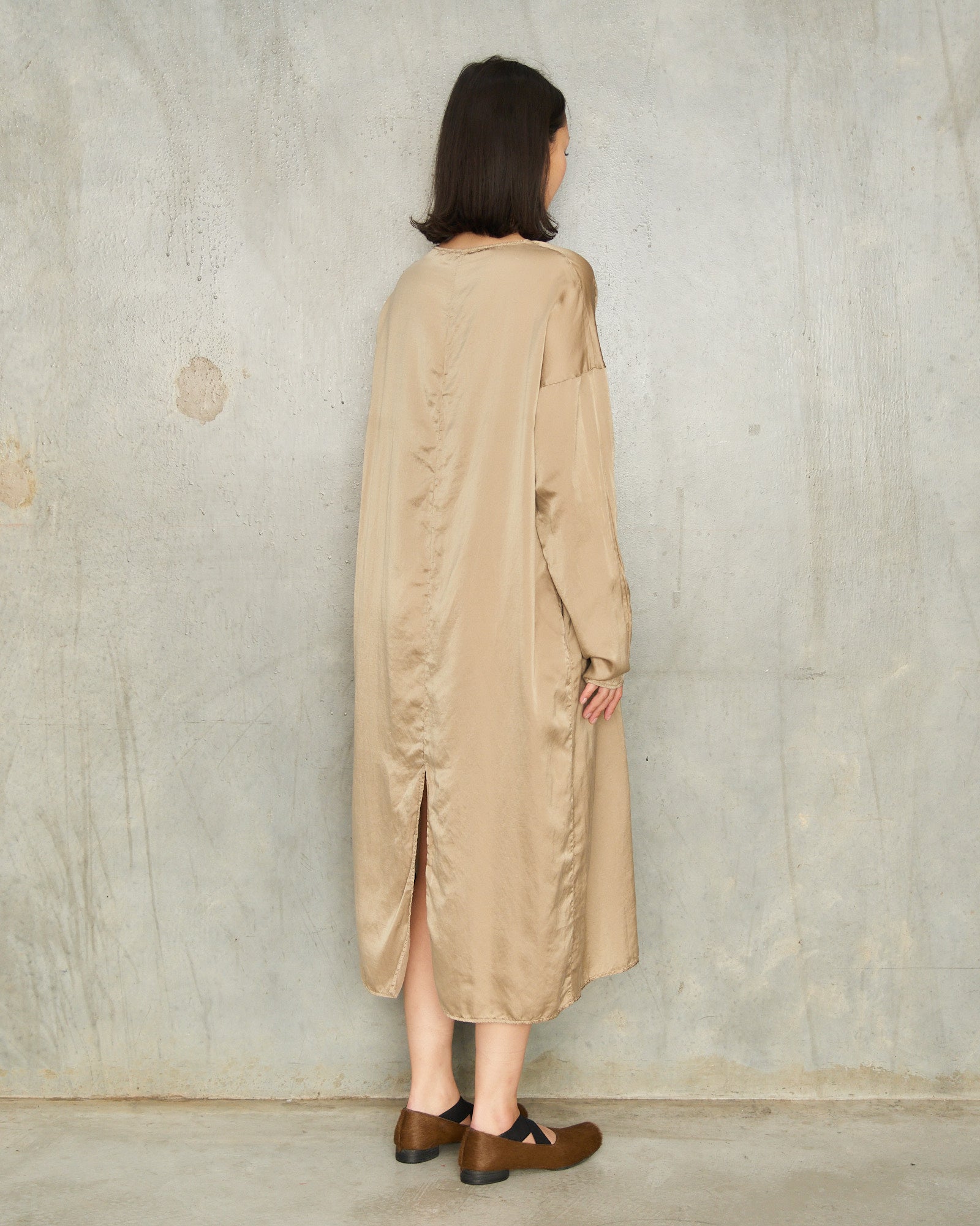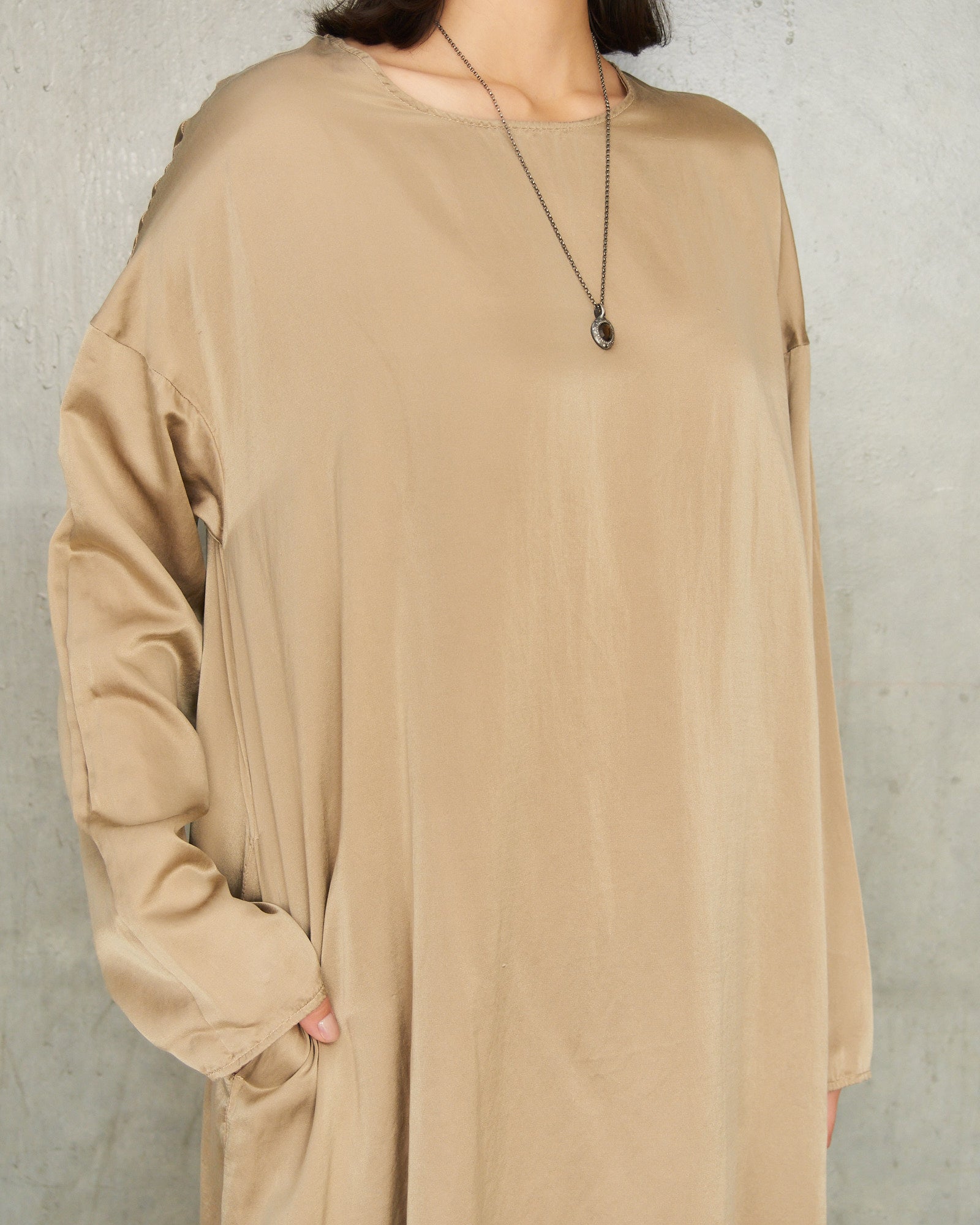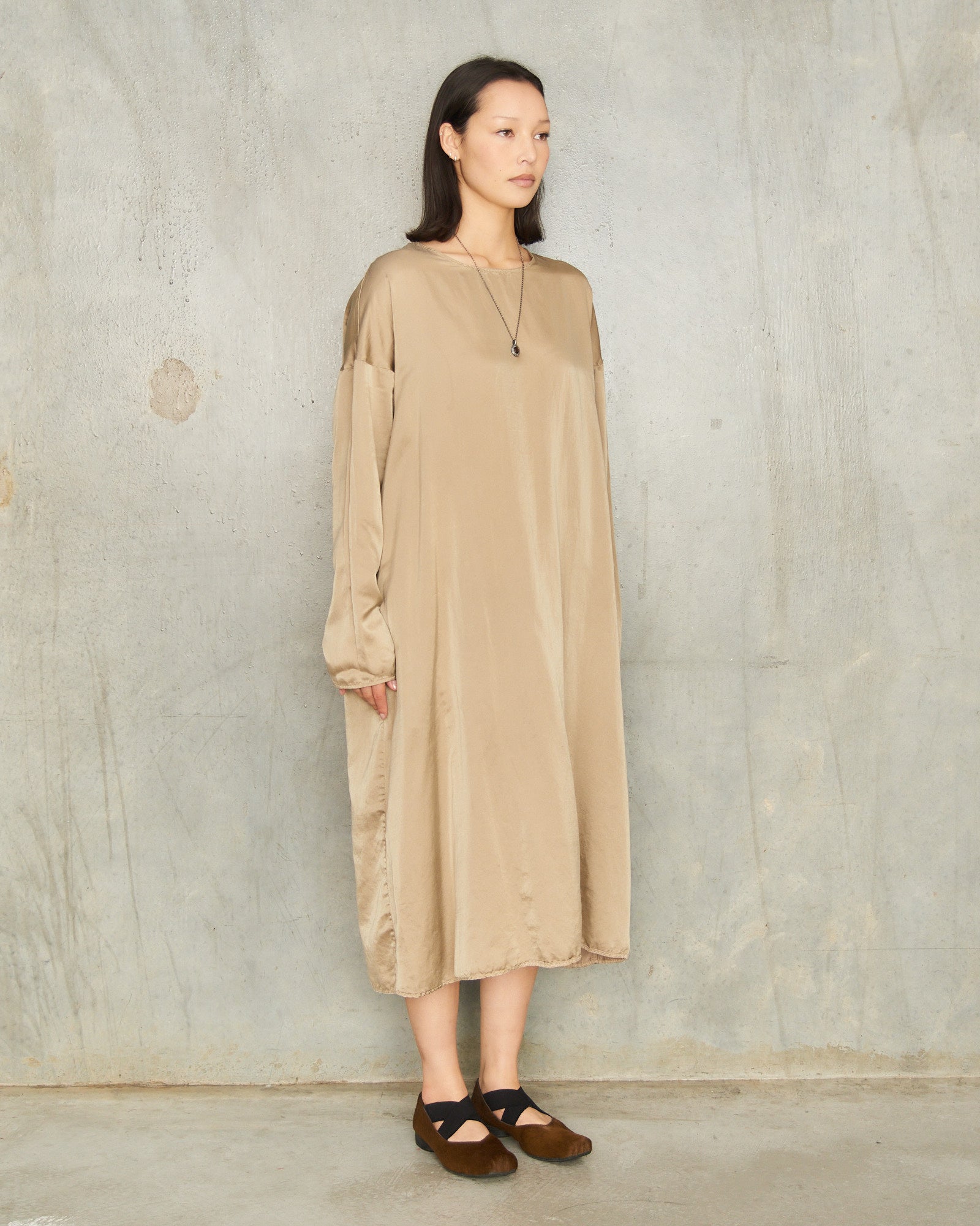 Silk T-dress by Album di Famiglia in marron glace. Effortless dress in a silk cotton blend, cut in a T-construction that drapes fluidly from dropped shoulders into long sleeves.
