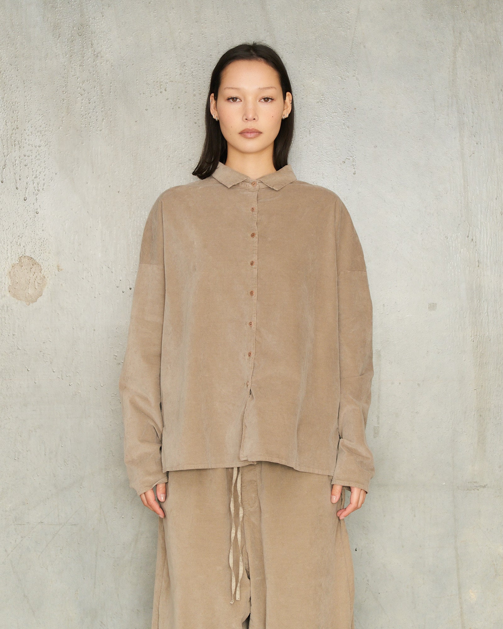 Velvet shirt by Album di Famiglia in marron glace. Soft velvet shirt with a spread collar and gentle button closure. Relaxed fit with slouchy sleeves exudes an understated elegance.