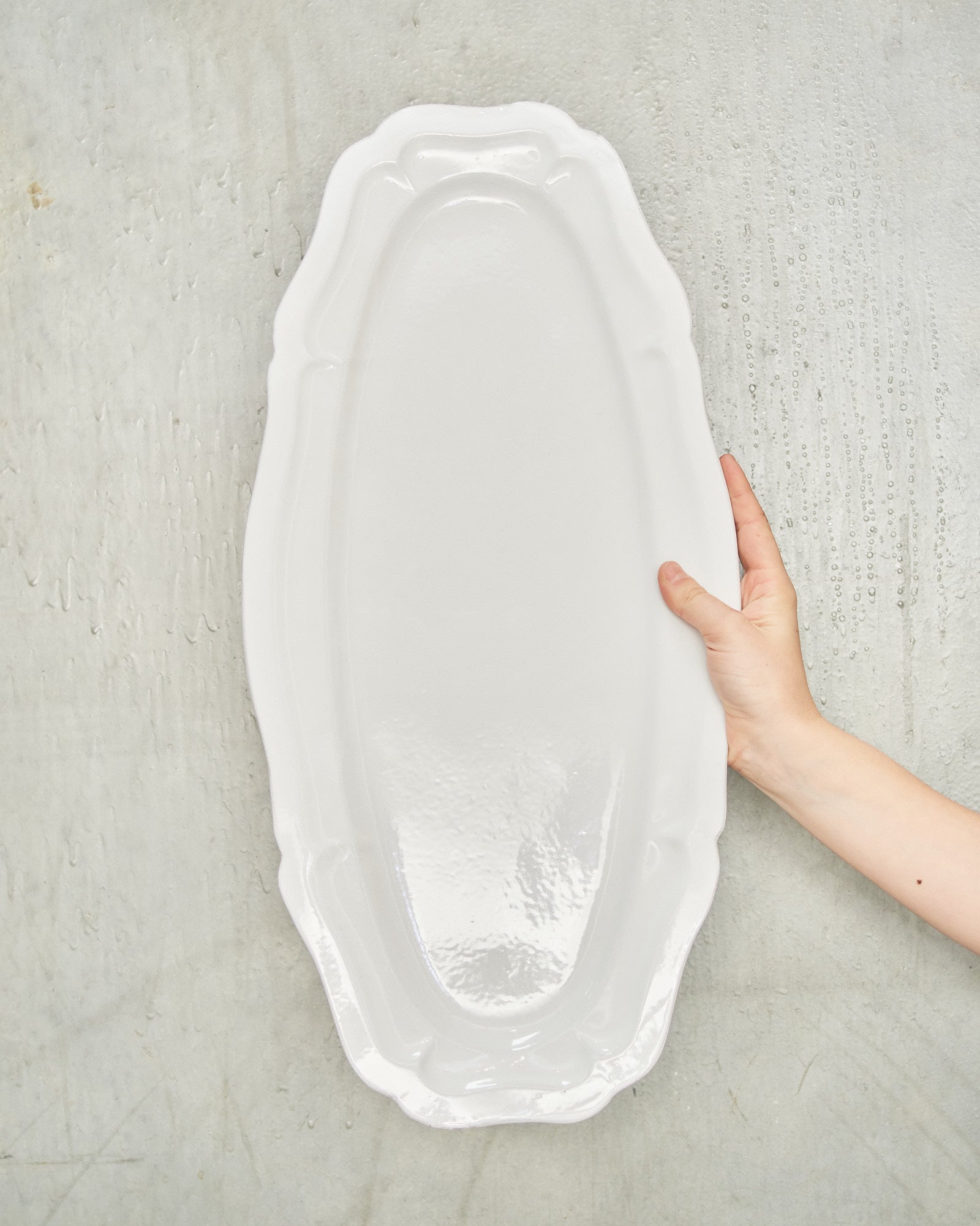 Bazar large platter by Astier de Villatte. Long oval platter with signature ornate rim finishing.
