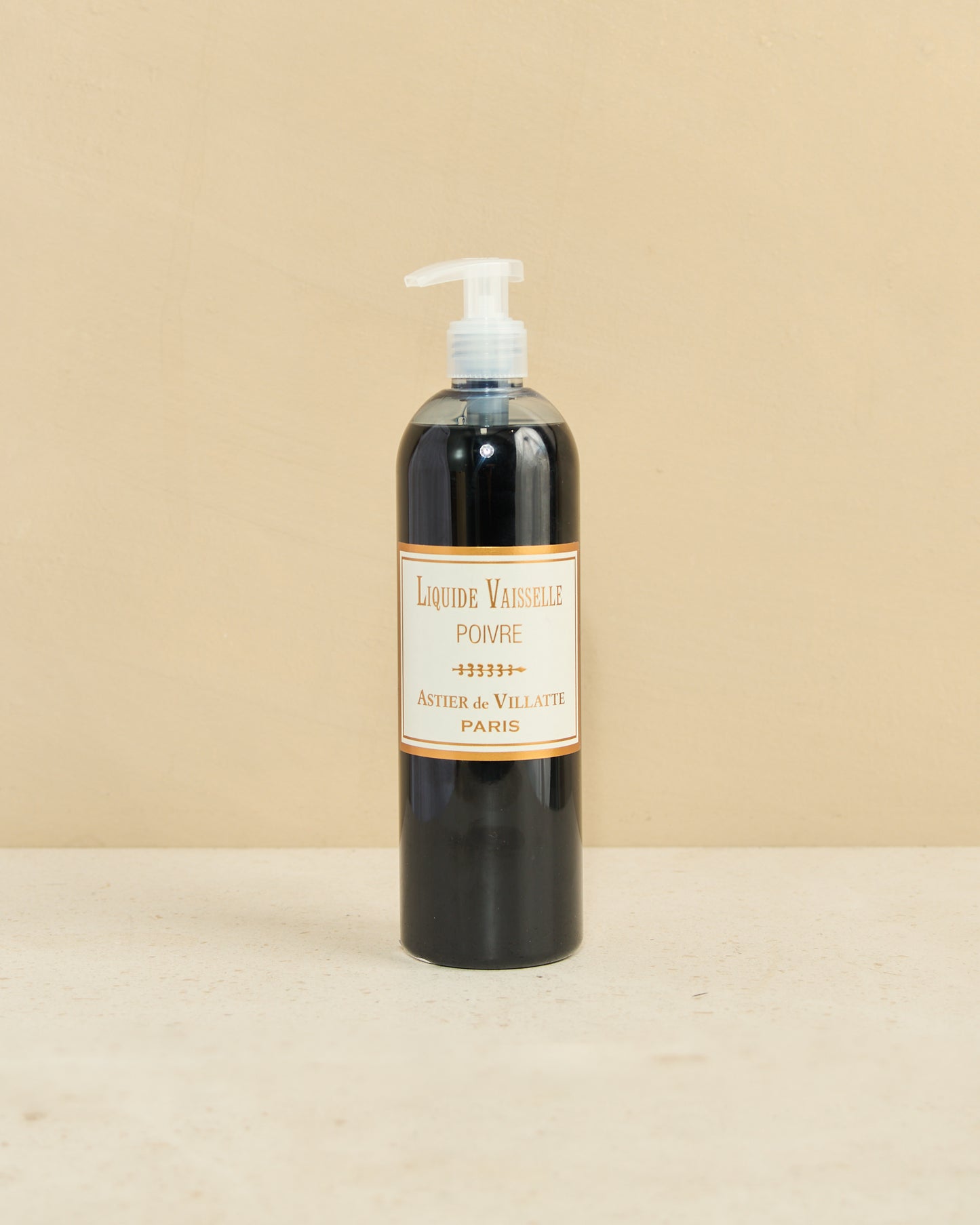 A beautiful pepper scented organic dishwashing liquid by Astier de Villatte. This premium formulation is gentle on tablewares, objects and hands. Can also be used as an enlivening body wash.