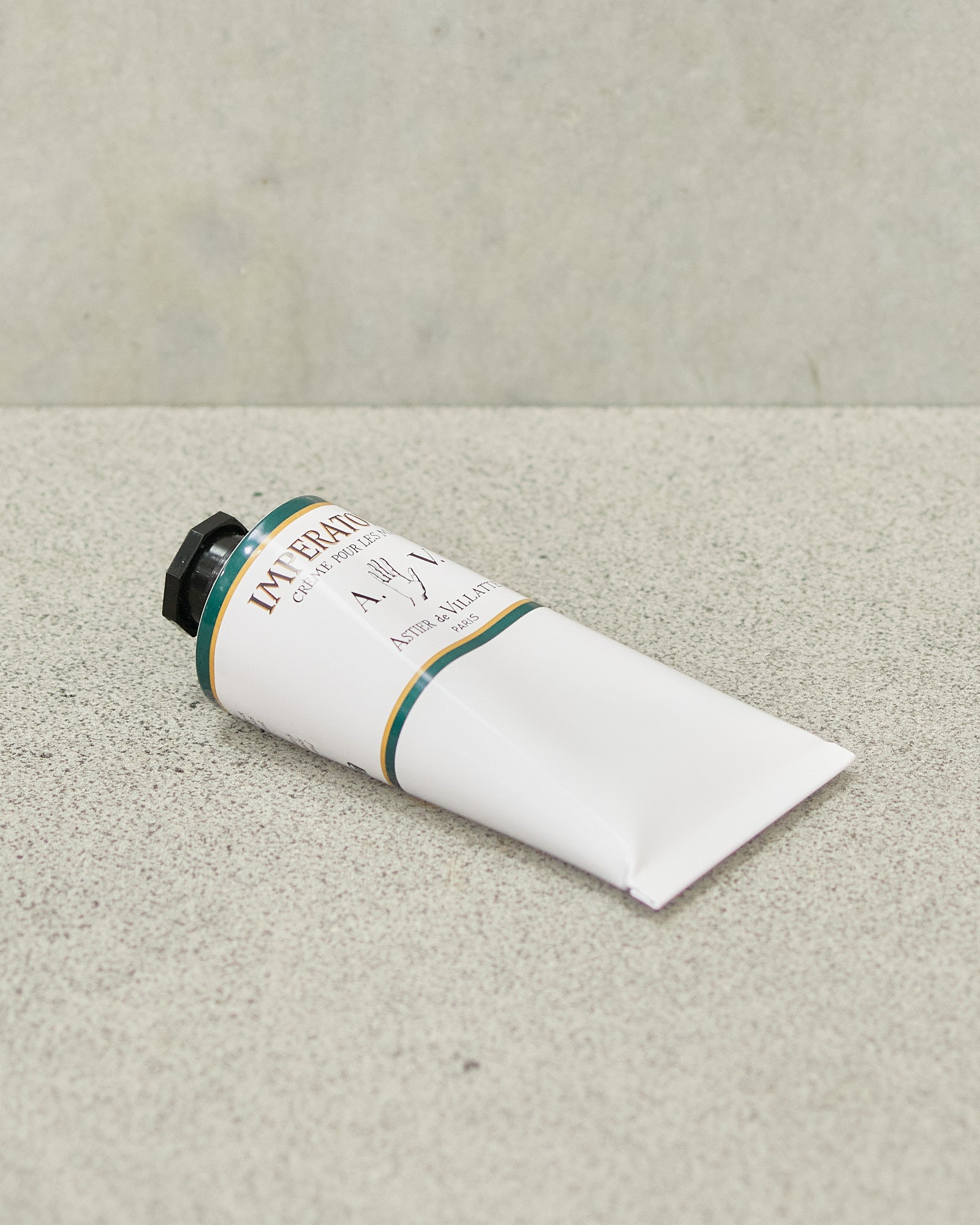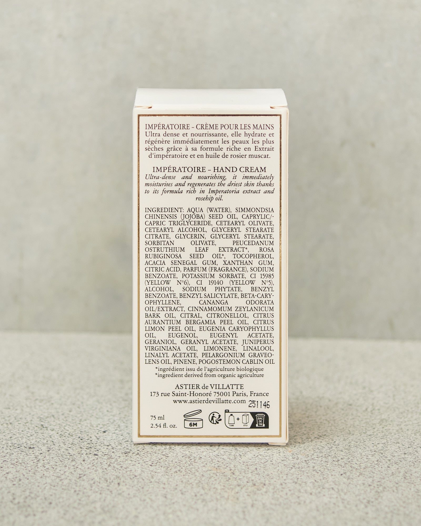 Crème Impératoire Tube by Astier de Villatte. A nourishing yet lightweight hand cream designed to moisturise, soften, and protect dry skin. Formulated with Imperatoria extract and rosehip oil, it supports the skin’s natural balance, while jojoba oil, glycerin, and olive-derived emollients deliver lasting hydration without residue. Botanical extracts of beetroot and olive leaf provide antioxidant care, and a plant-based emulsifying system ensures a smooth, fast-absorbing texture. Lightly scented with citrus oils and subtle aromatic notes, it leaves hands comfortable, refined, and delicately fragranced for everyday use.