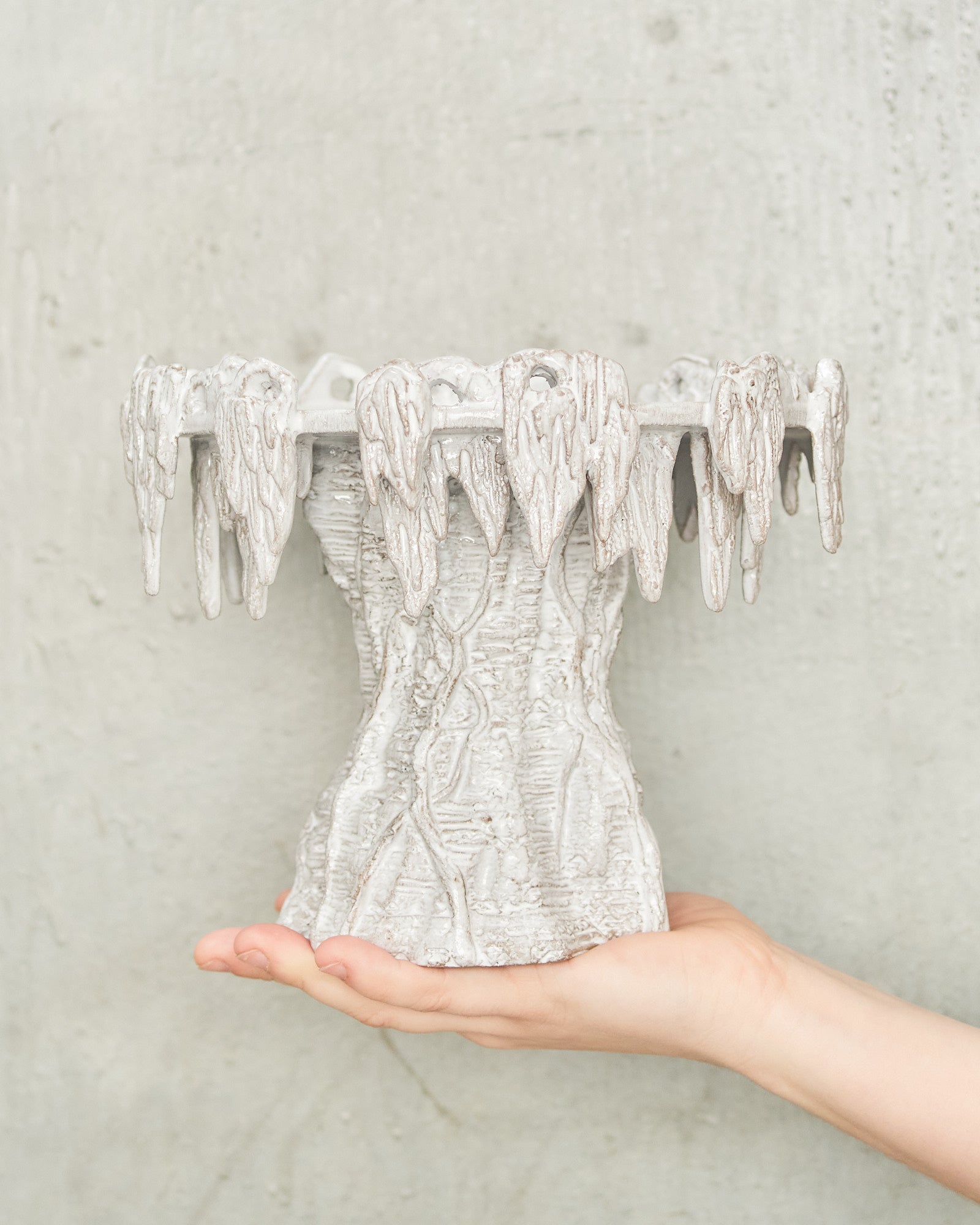 Eva medium stand by Astier de Villatte. Ceramic cake stand resting on an organic sculpted base, with delicately modelled foliage trailing from the rim.