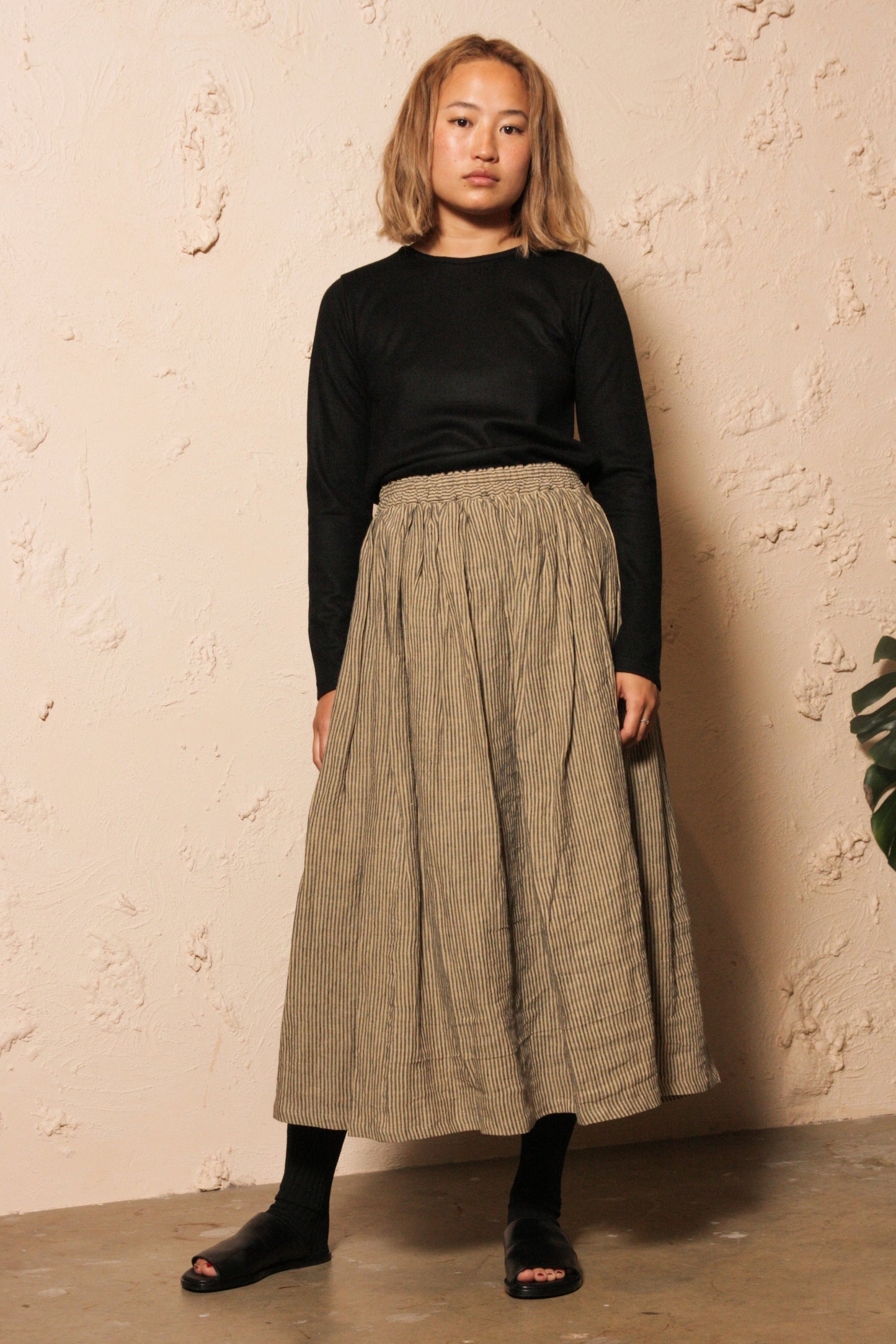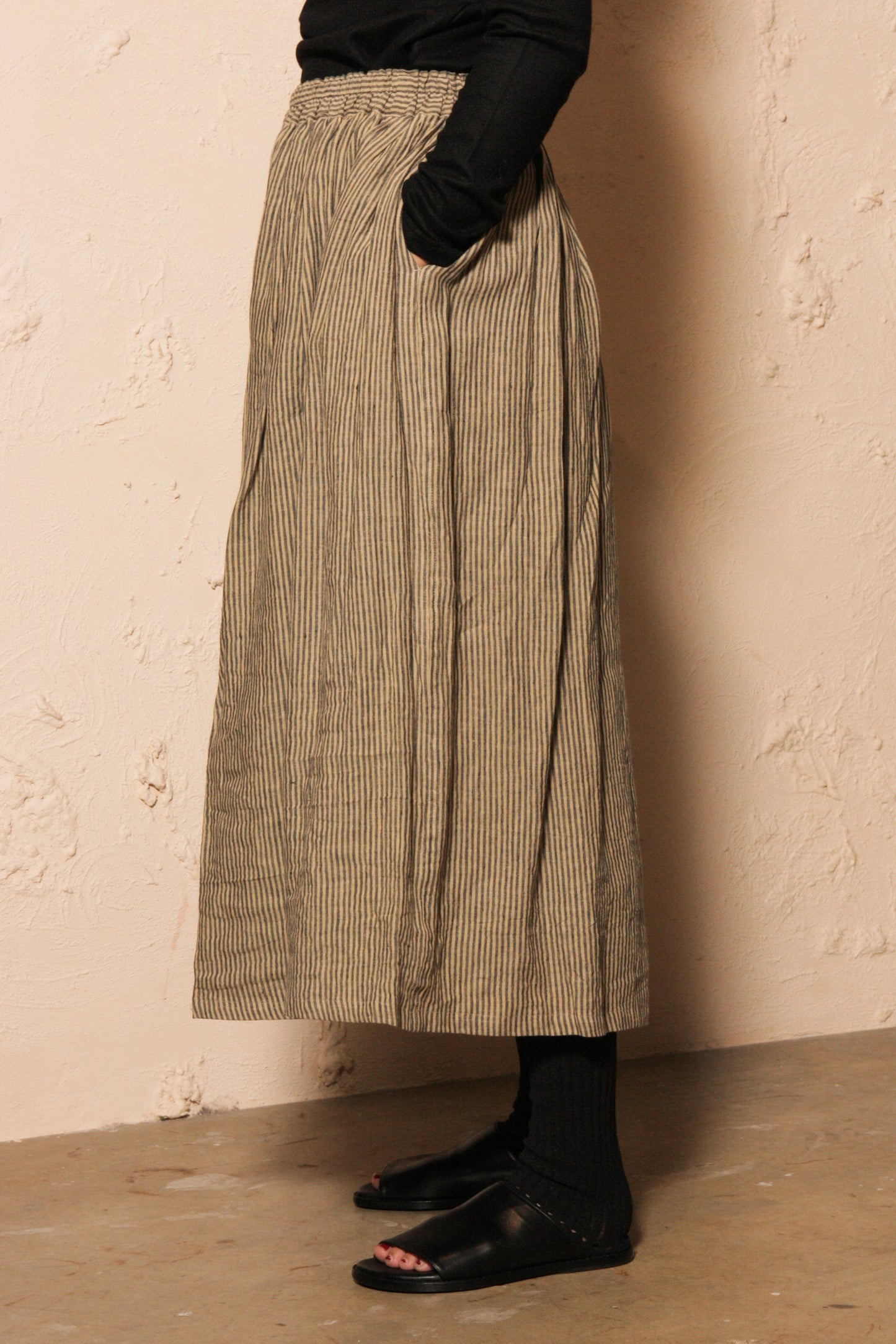 Long skirt by Japanese brand Ichi Antiquites in beige striped linen fabric. Features drawstring waist band and in-seam pockets.