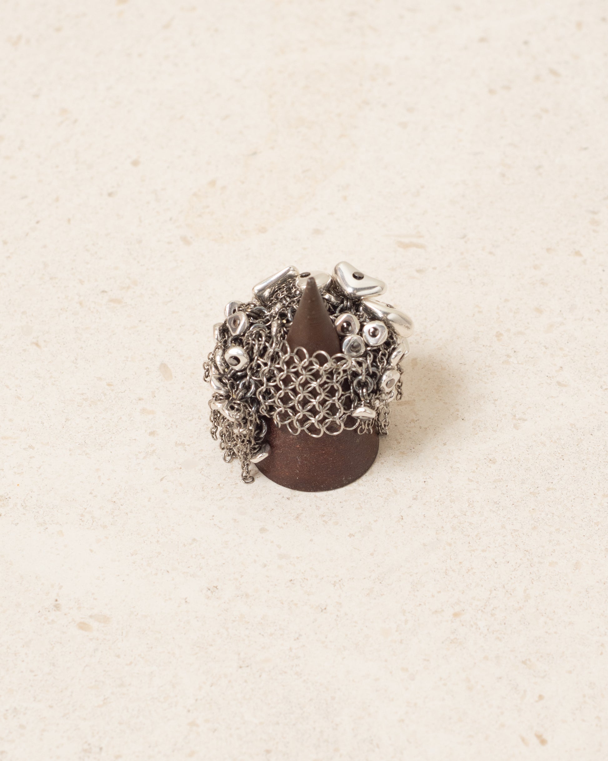 Chain ring by Jean-François Mimilla with steel beads. Arresting and textural ring comprising of interlinked chains encircling the finger. Dazzling beads of steel in shapely organic forms decorate the exterior with finer chainlinks fringed throughout.