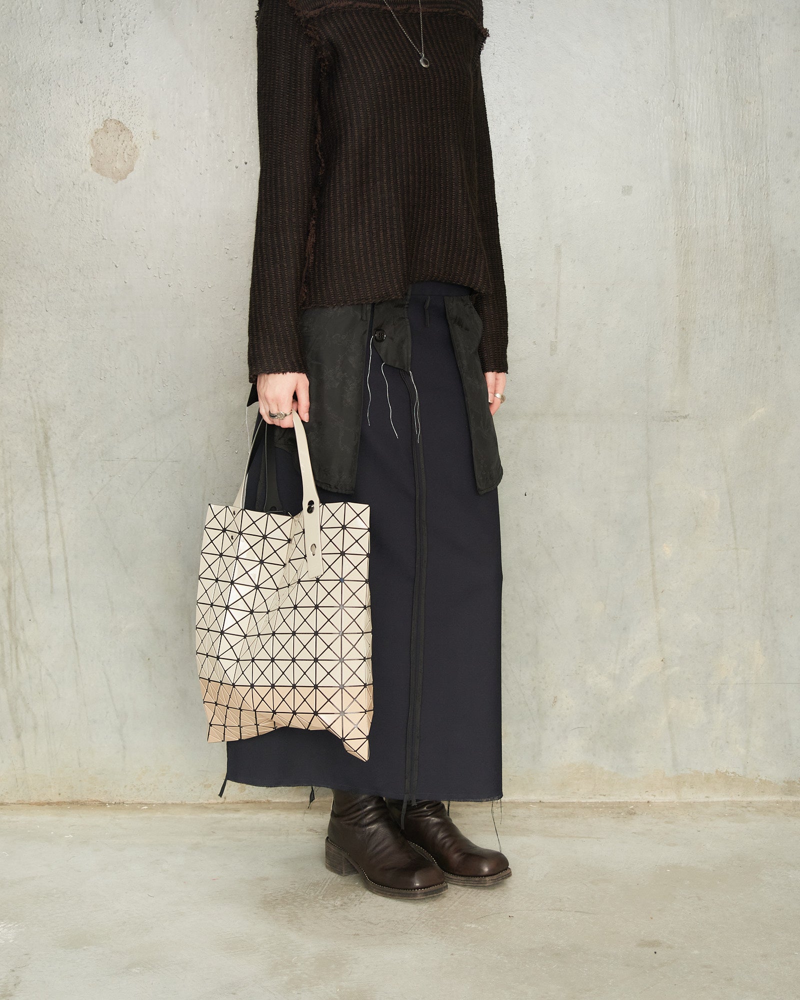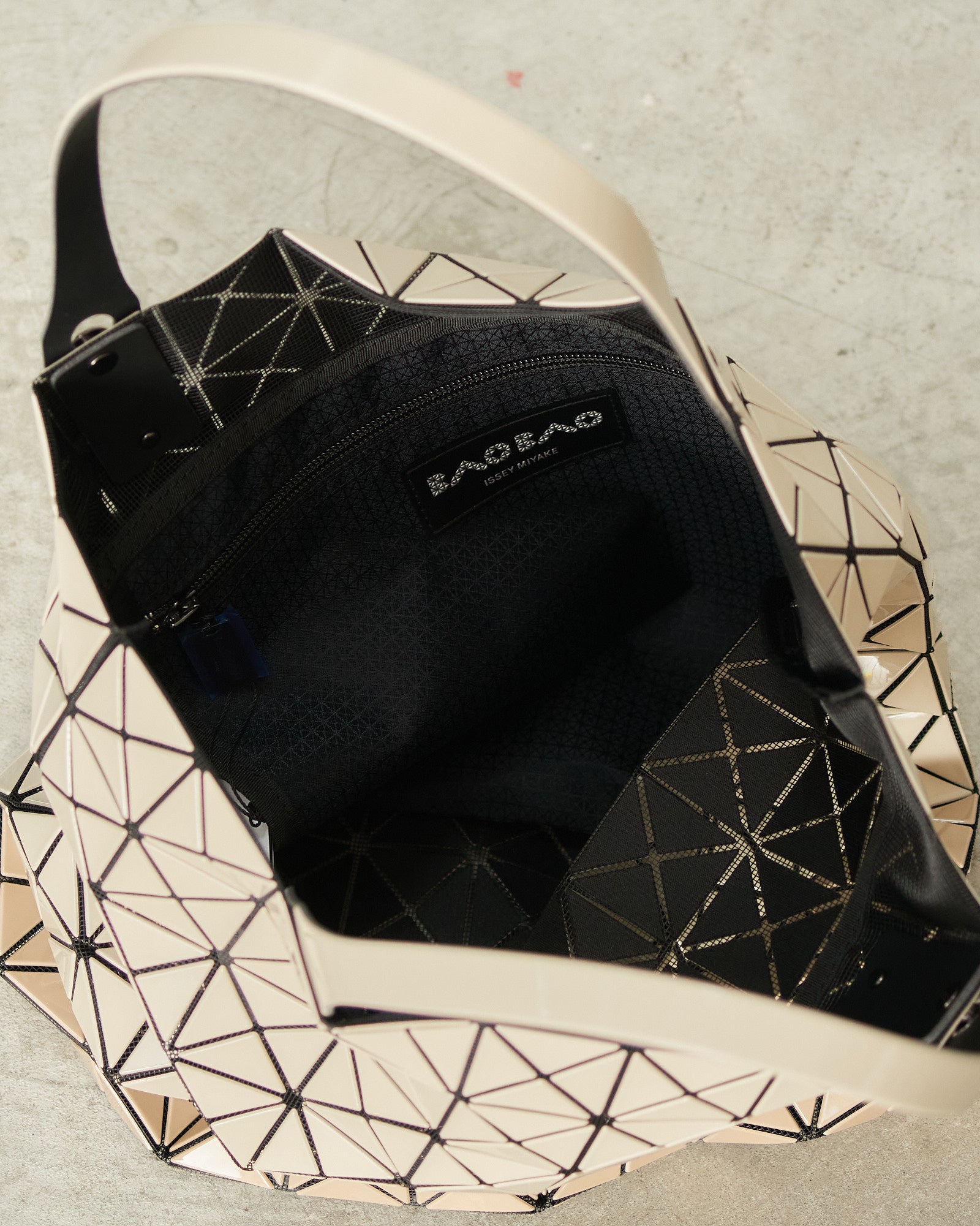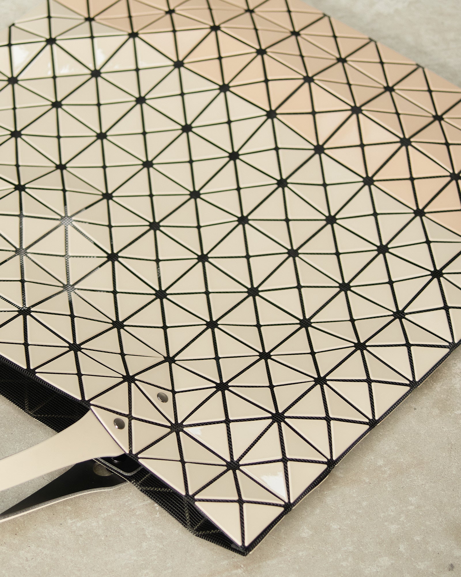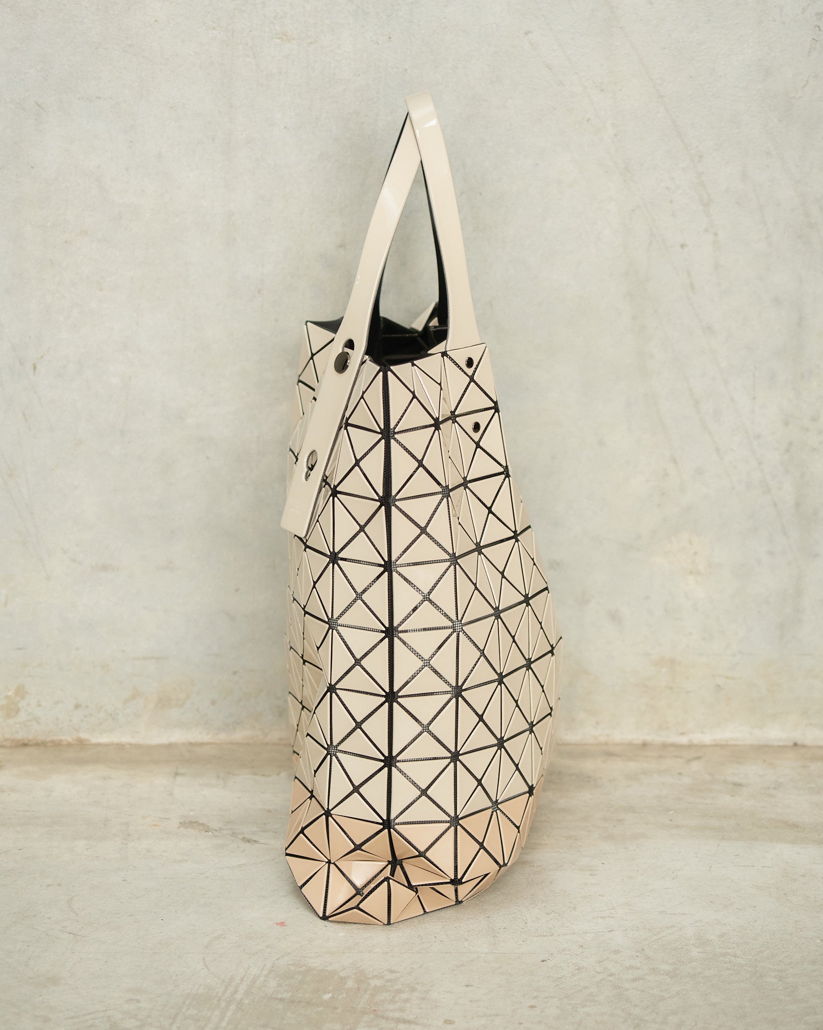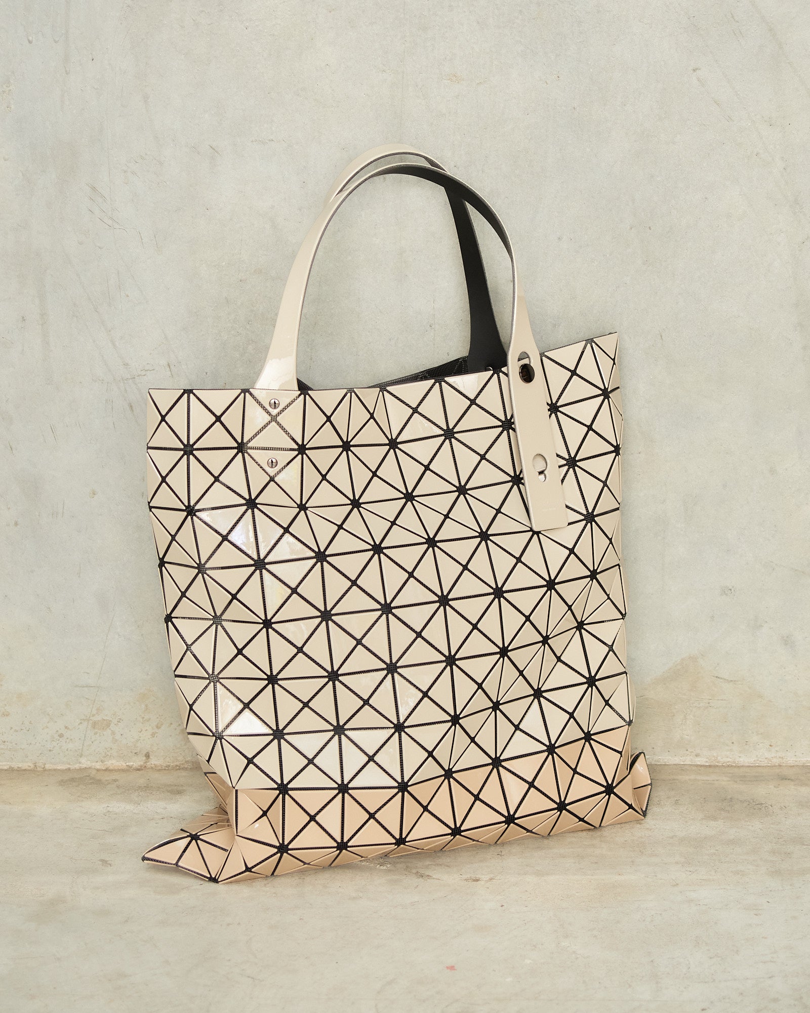 Two-tone prism tote by Bao Bao Issey Miyake in beige. Glossy beige triangular tiles adhere to a nylon mesh netting to give this tote its geometric form and dynamic structure. Adjustable handles and internal zipped pocket.