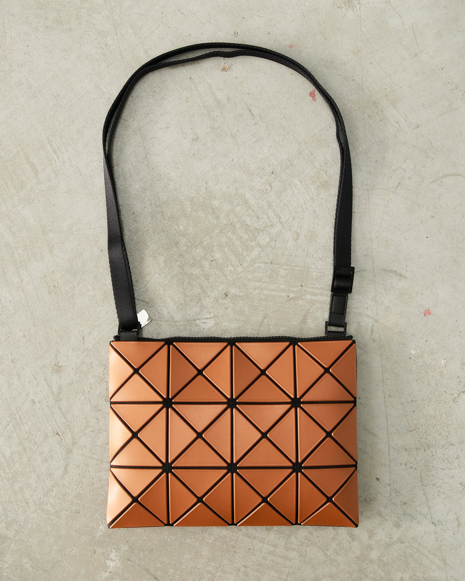 Lucent Metallic Shoulder bag by Bao Bao Issey Miyake in brick. Crafted from triangular tiles finished with a polarised metallic enamel, this handy size wears effortlessly as a modest day or evening bag. Lies flat when empty or takes on a sculptural form with items inside. Mesh underlayer allows for shapely malleability and convenient visibility within the bag.