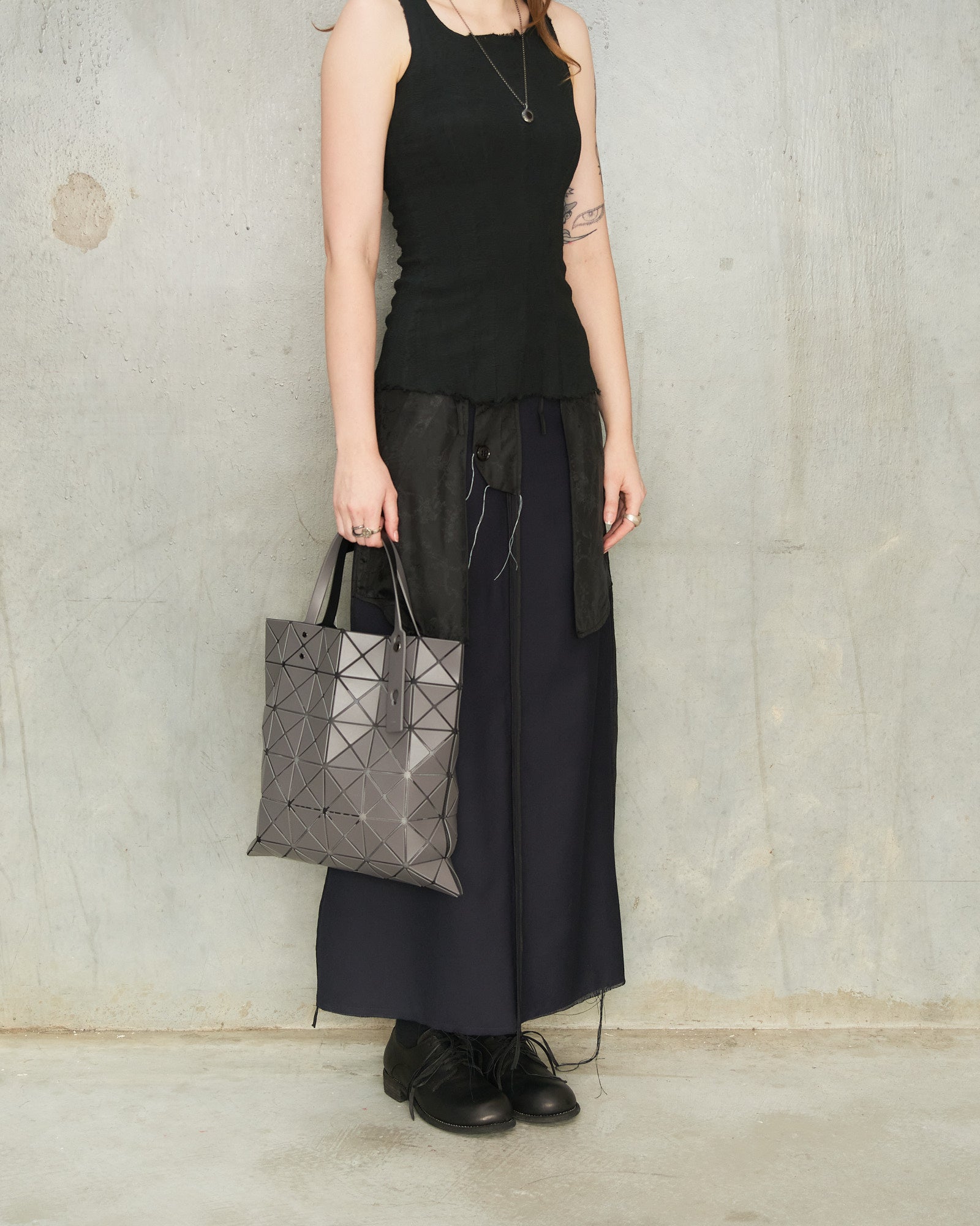 Pictured with Navy Reversed Skirt by Tom Westlake, GR02 Leather Derby by Guidi and Noir Stretch Tank by Marc Le Bihan.