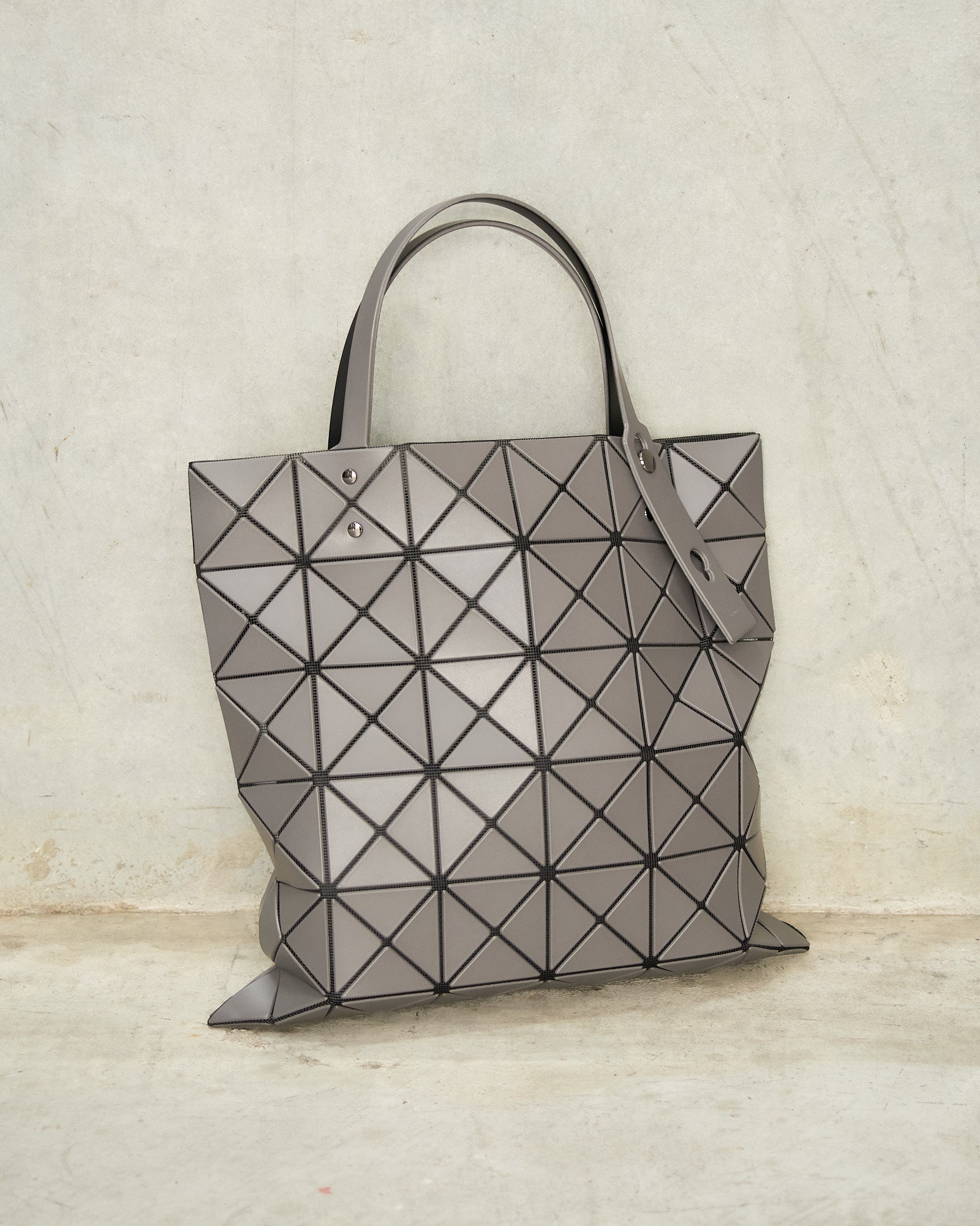 Lucent tote bag by Bao Bao Issey Miyake in charcoal grey. Signature triangular panels form this iconic geometric tote, shifting and folding with motion to create ever-changing dimension. Lightweight yet durable, with shoulder-length straps for effortless everyday carry.