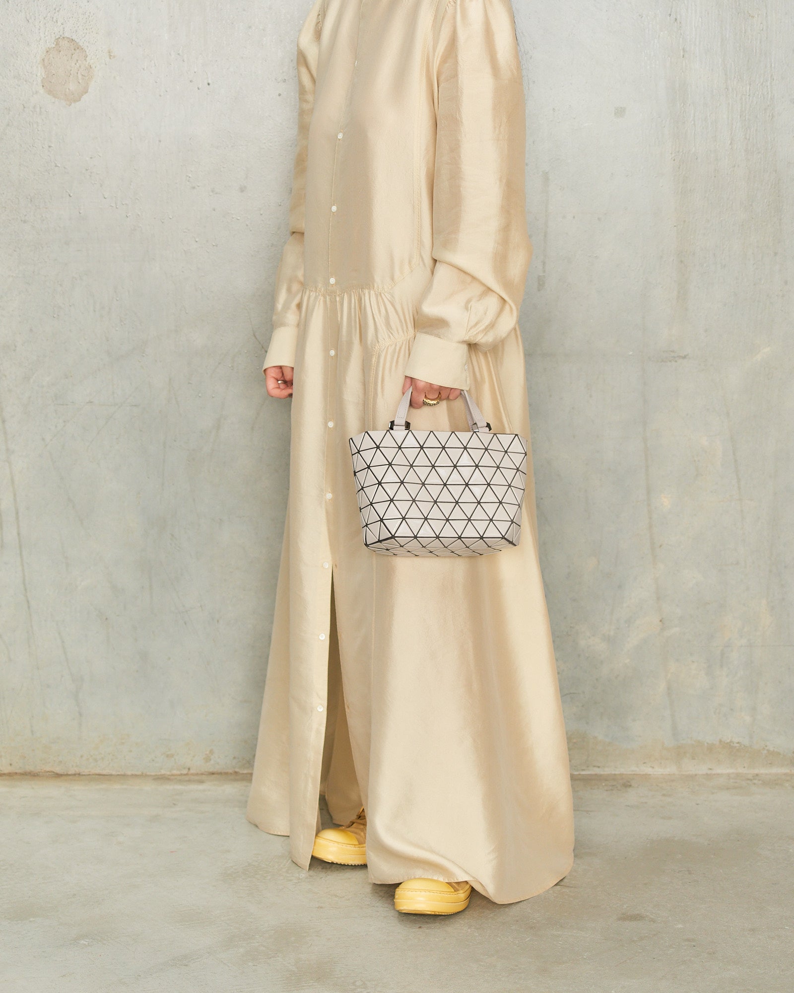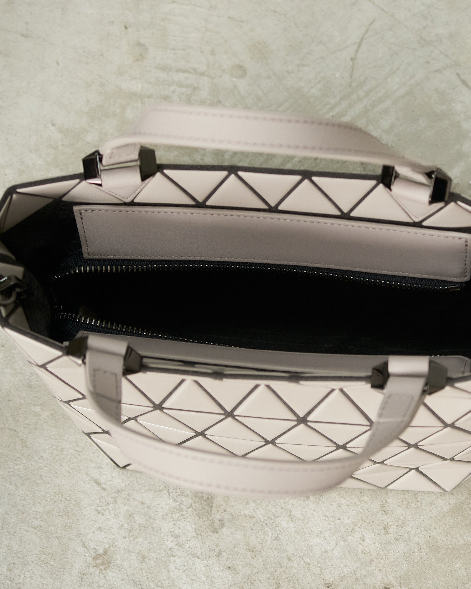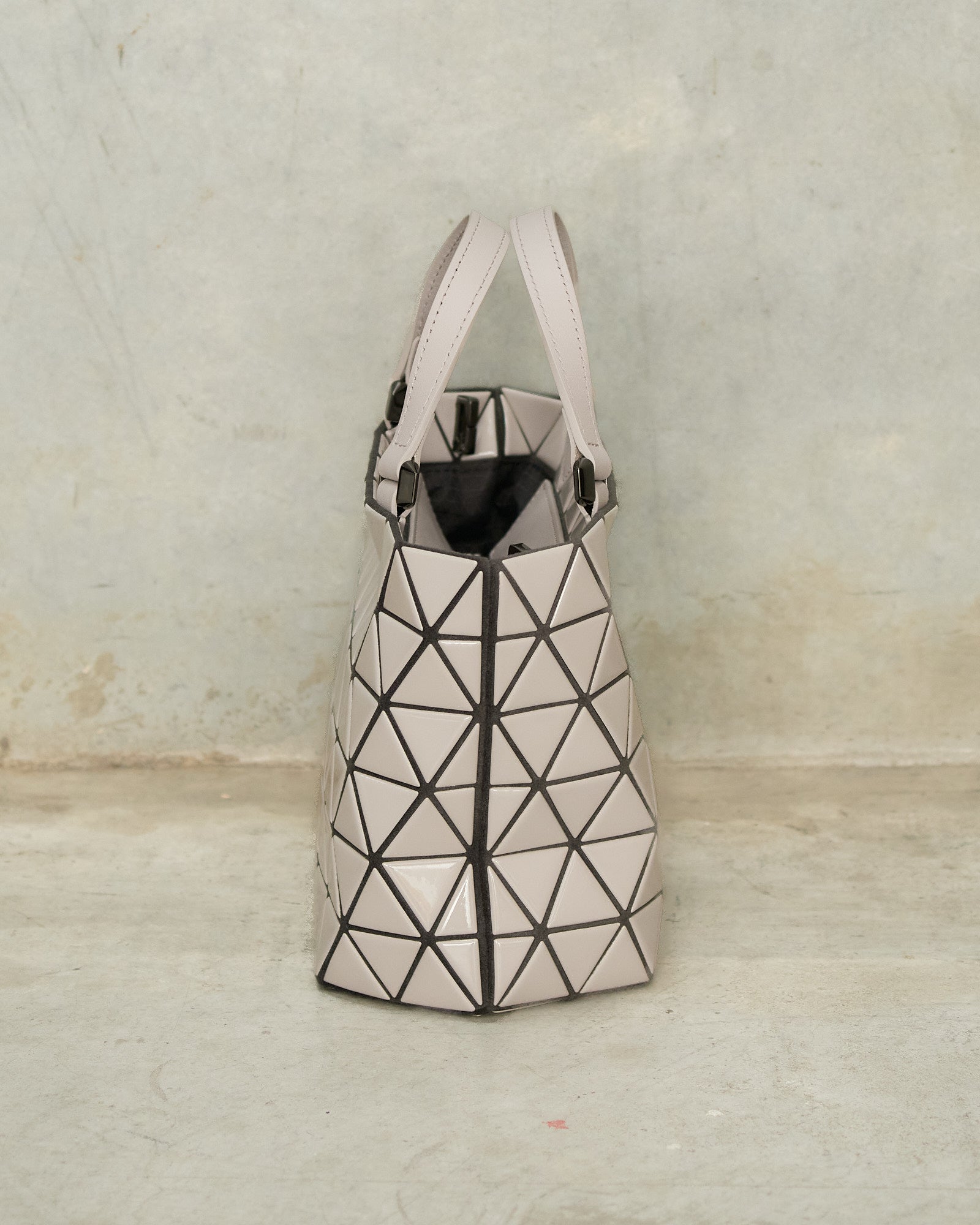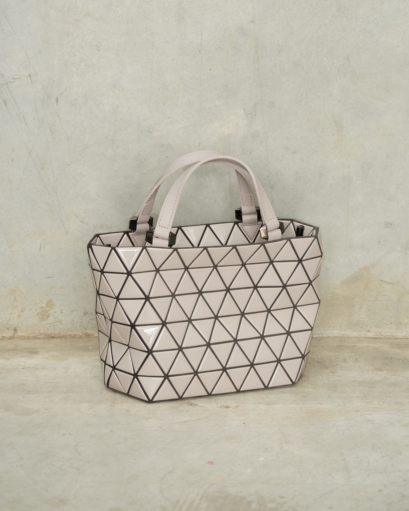 Crystal Gloss Handbag by Bao Bao Issey Miyake in greige. This small structured handbag features a faceted surface of high shine triangular panels, contrasted with supple leather handles and a removable strap. The interior is fitted with discreet pockets for everyday essentials, offering a balance of sculptural design and practical function.