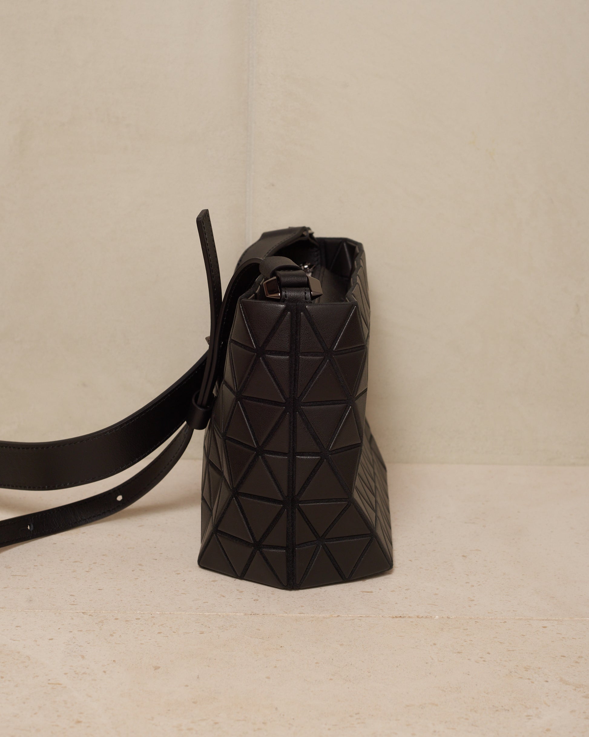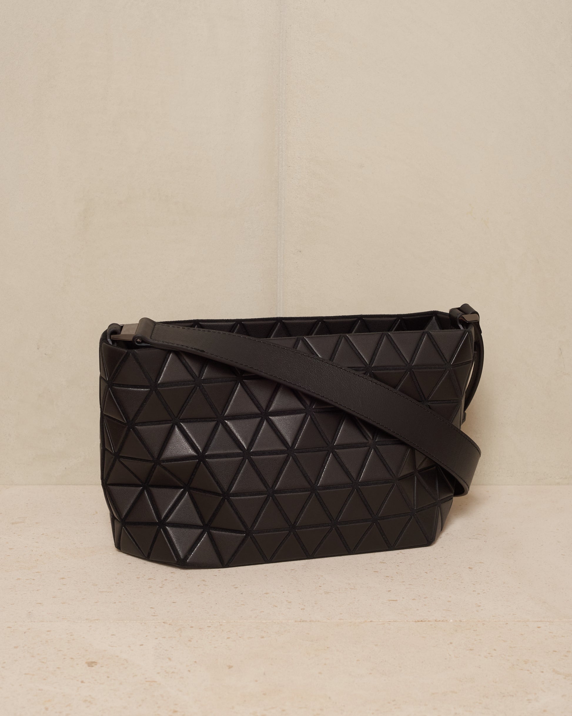 Medium shoulder bag by Bao Bao Issey Miyake in black. Geometric shoulder bag with triangular tiling in a leather-like matte material. Adjustable strap with cowhide leather and metal hardware give a chic impression. Zipped closure with nylon lining and two internal pockets.