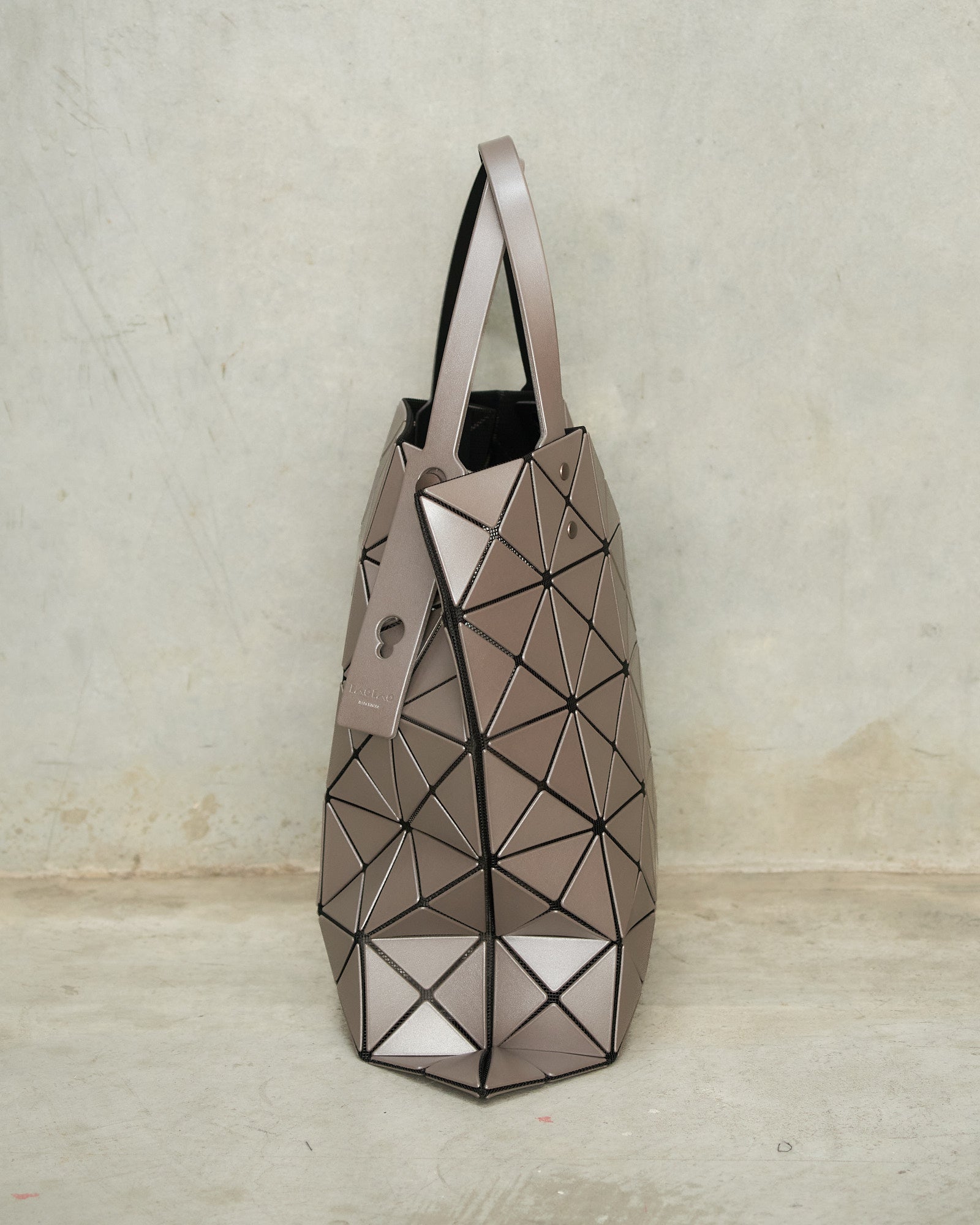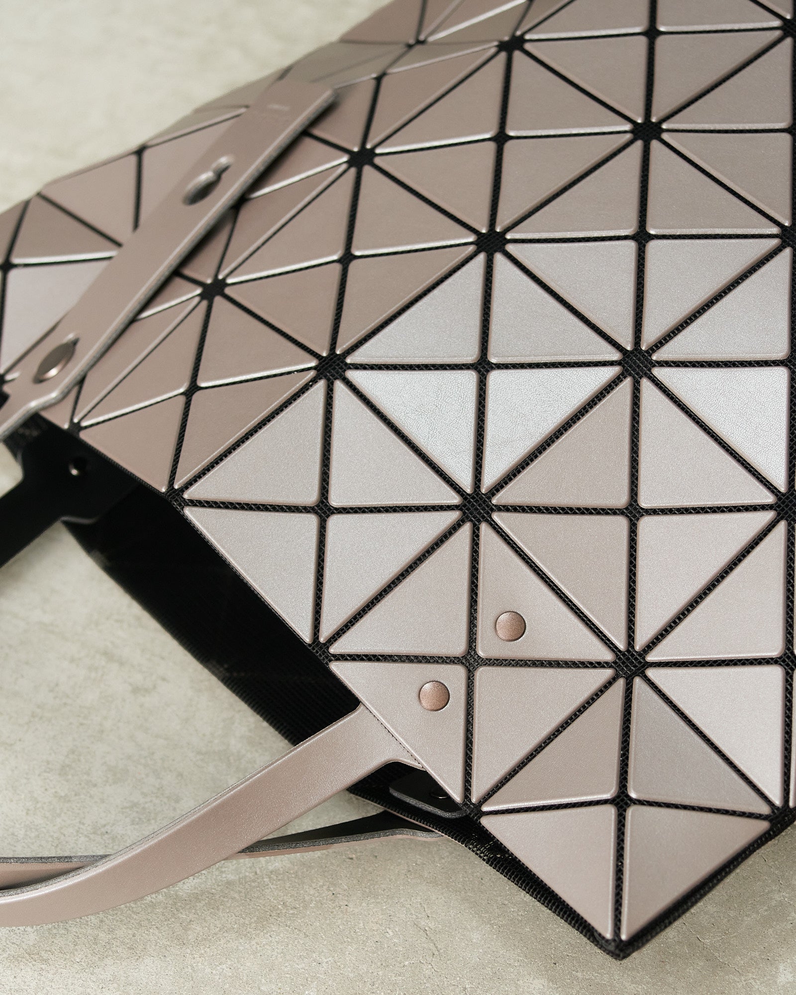Lucent Metallic tote by Bao Bao Issey Miyake in Stone. Signature triangular panels form this iconic geometric tote, shifting and folding with motion to create ever-changing dimension. Lightweight yet durable, with shoulder-length straps for effortless everyday carry.