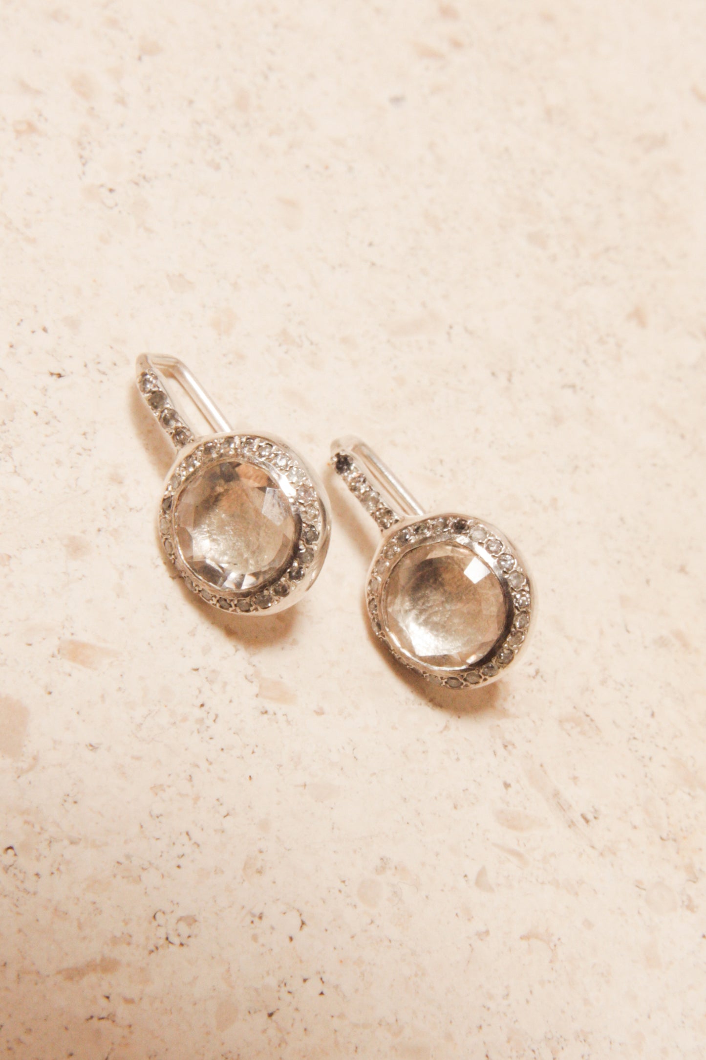 Beenu silver drop earrings by Rosa Maria with topaz surrounded by icy grey diamonds.