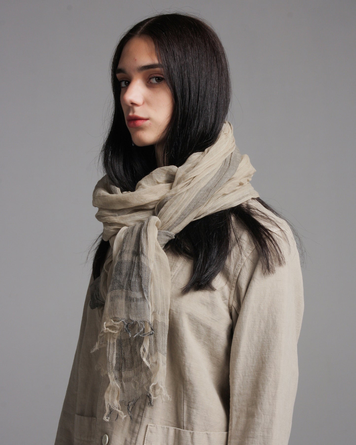 Bengara dye stole by Pas de Calais in beige. Delicate gauze-like stole in an authentic linen and cashmere blend. Organic dye is sourced from soil to give a softly rich colour that imbues the essence of the earth and Japanese life. Subtle striped border and gossamer-fine laddering.