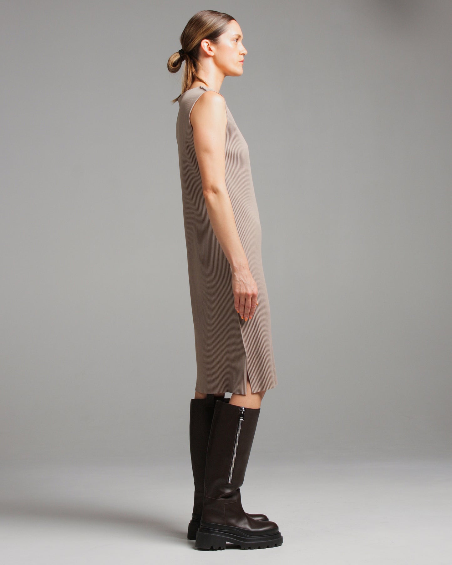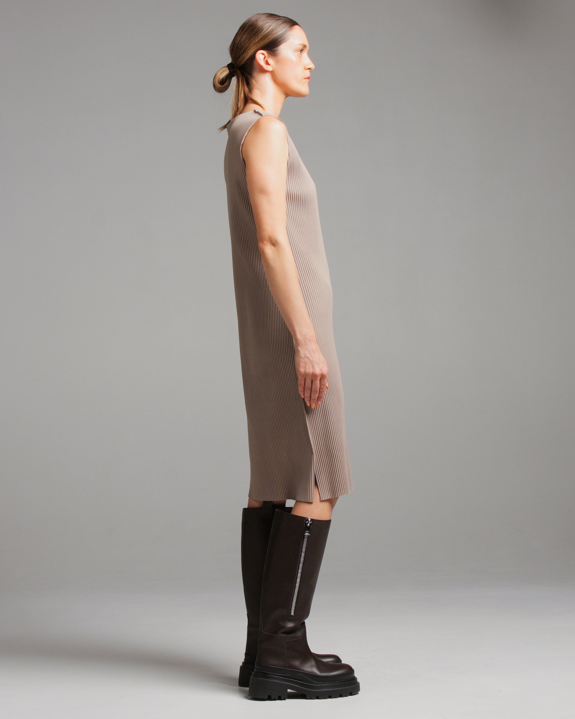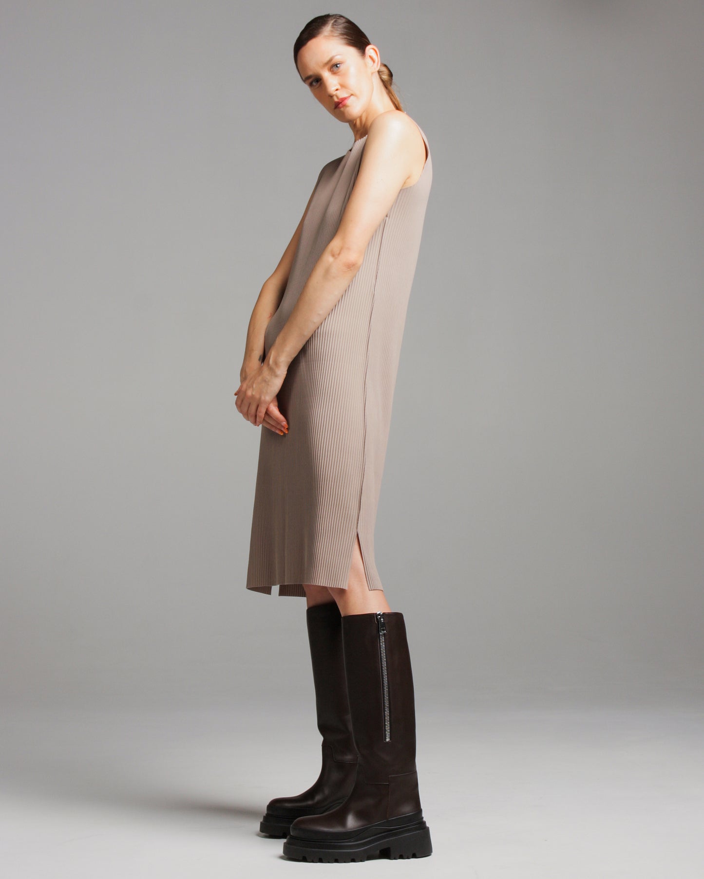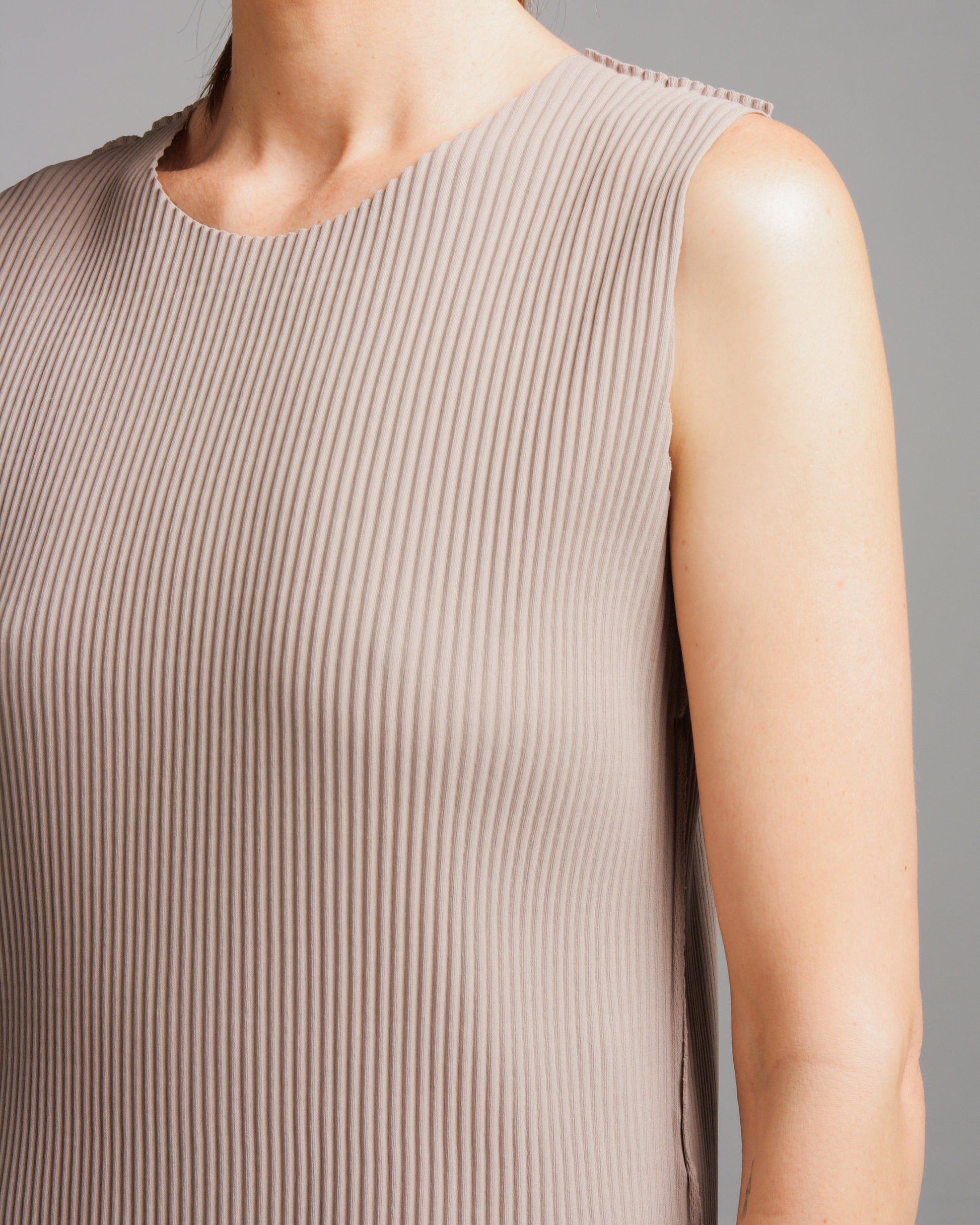 Fine knit pleated tank dress by Issey Miyake ME in beige. Classic mid-length tank dress in soft ribbed texture. Perfect, regular pleating and crisp seams make for a refined and clean impression. Comfortable, easy to wash and style.