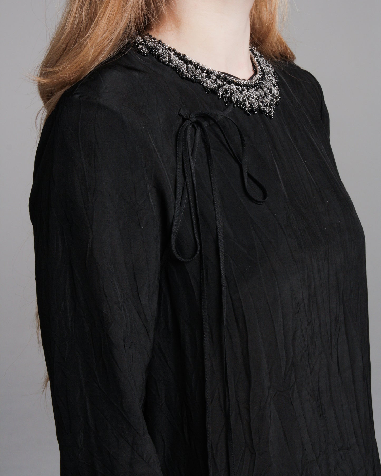 Agina dress by Uma Wang in black. Mid-sleeve dress with traditionally inspired neckline, fastened by a single press stud and long ribbon tie. Pure viscose fabrication with a subtle crinkled finish and slight sheen. Two deep pockets and a high vent at the left seam. Darkly romantic and deeply enigmatic.
