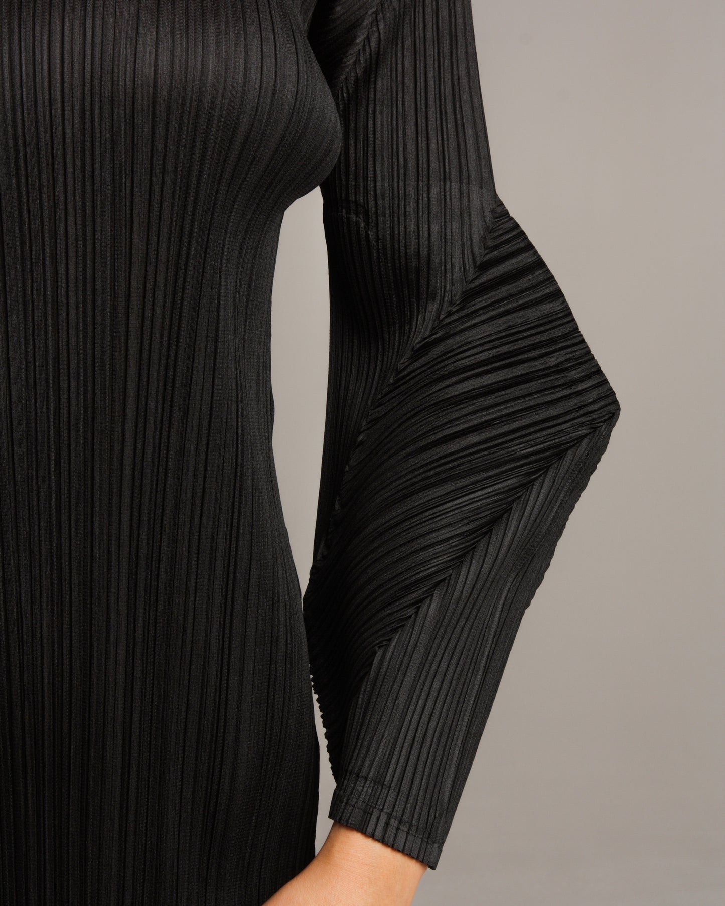 Blast dress by Pleats Please Issey Miyake in black. Mid-length dress in classic pleating with round neck and expressive sleeving. Two forty-five degree folds in the sleeves create dimensional extensions at the elbows. A strikingly modern and robust silhouette.