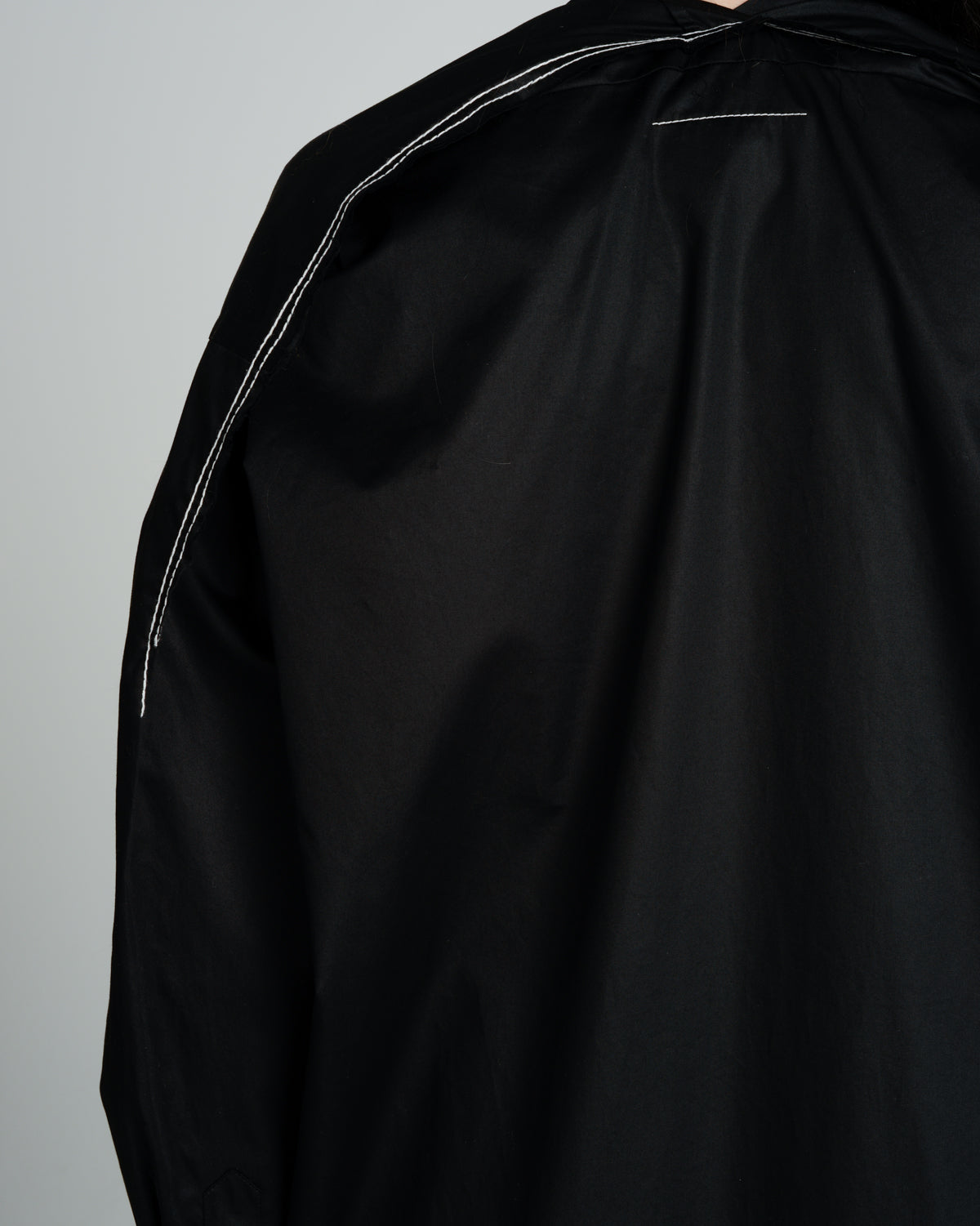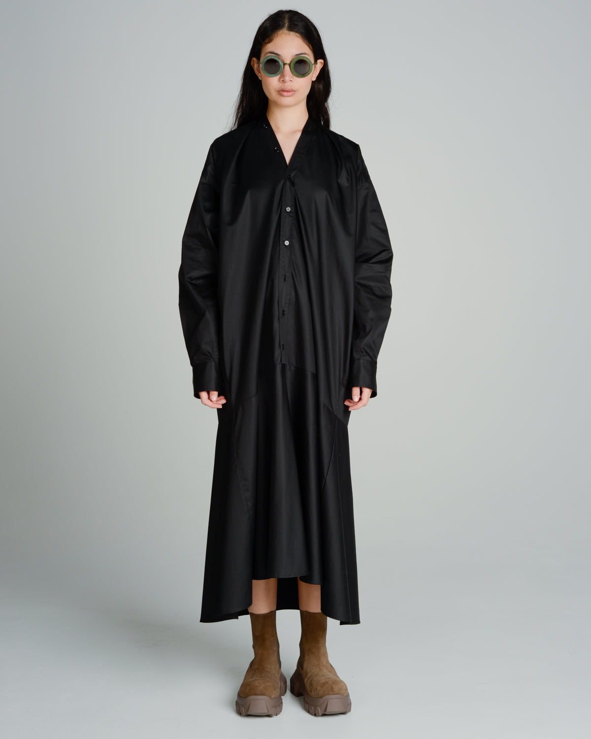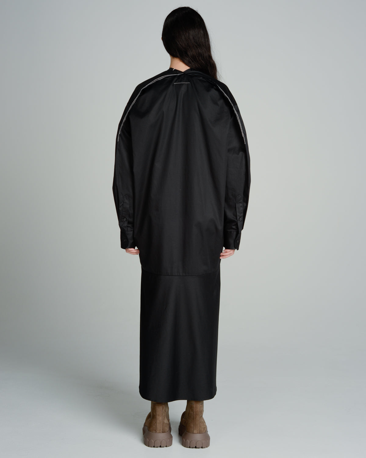 Collarless shirt dress by MM6 Maison Margiela. Substantial cotton poplin fabrication with a luxe sheen. Button placket extends over the shoulders to form a plunging V-neckline. Raw edge seam arches across the back with contrast white stitching. A shapely silhouette formed by gathering at the front and a dropped waist at the rear.