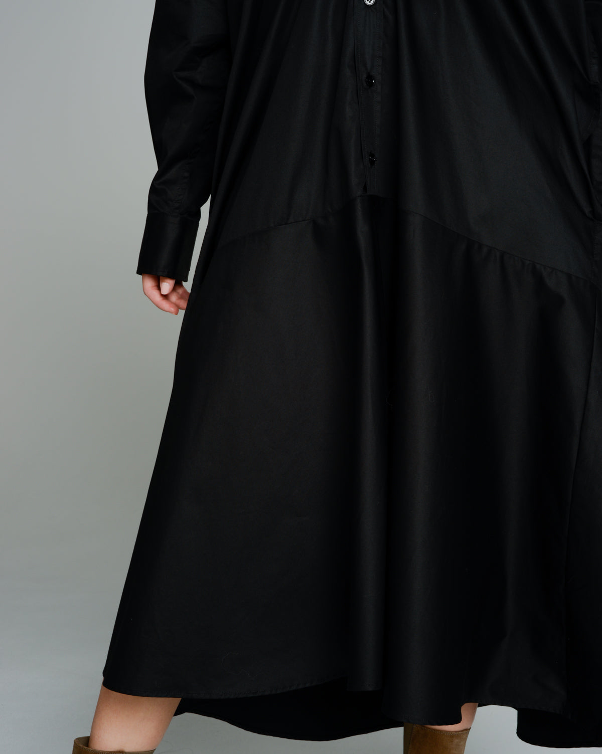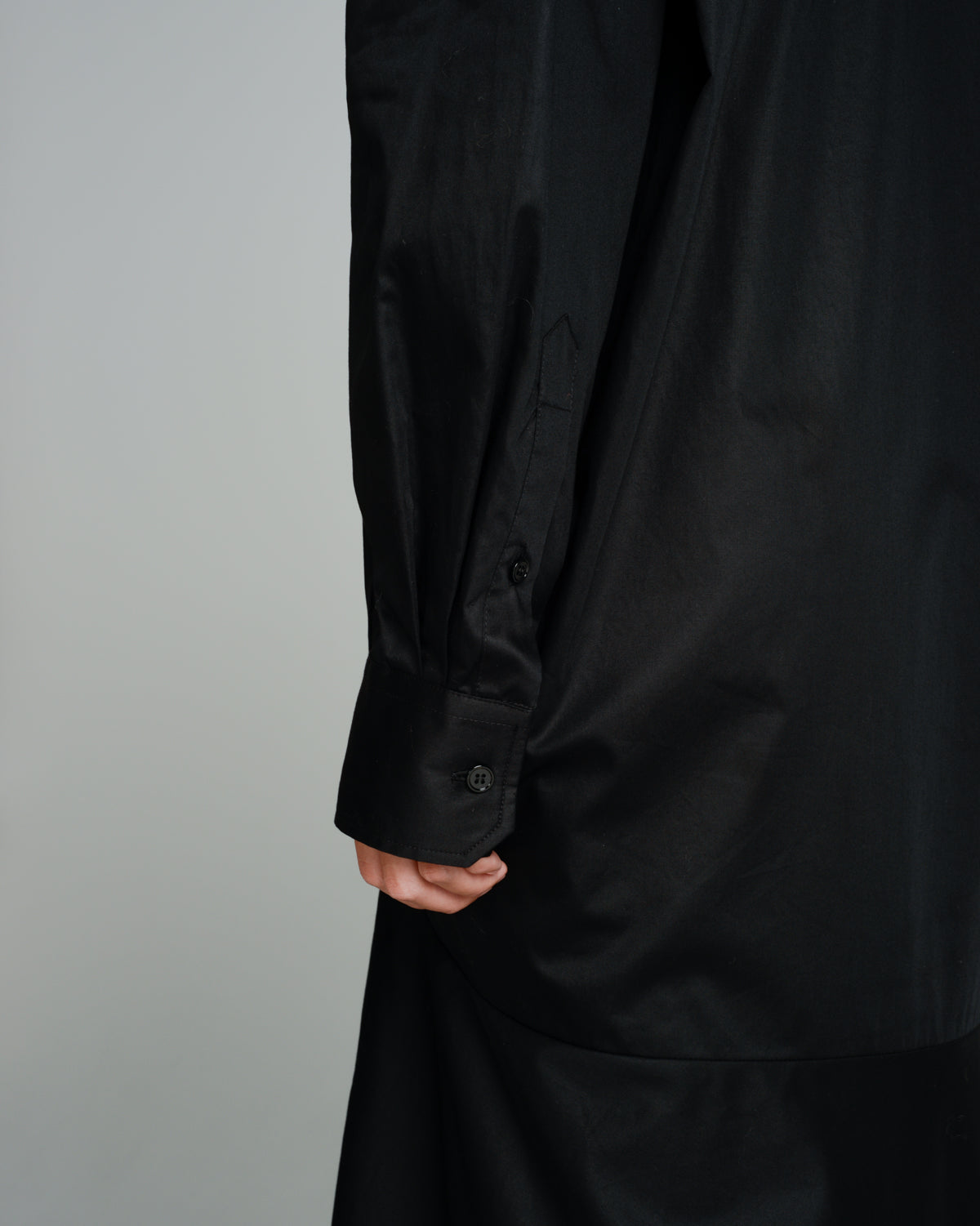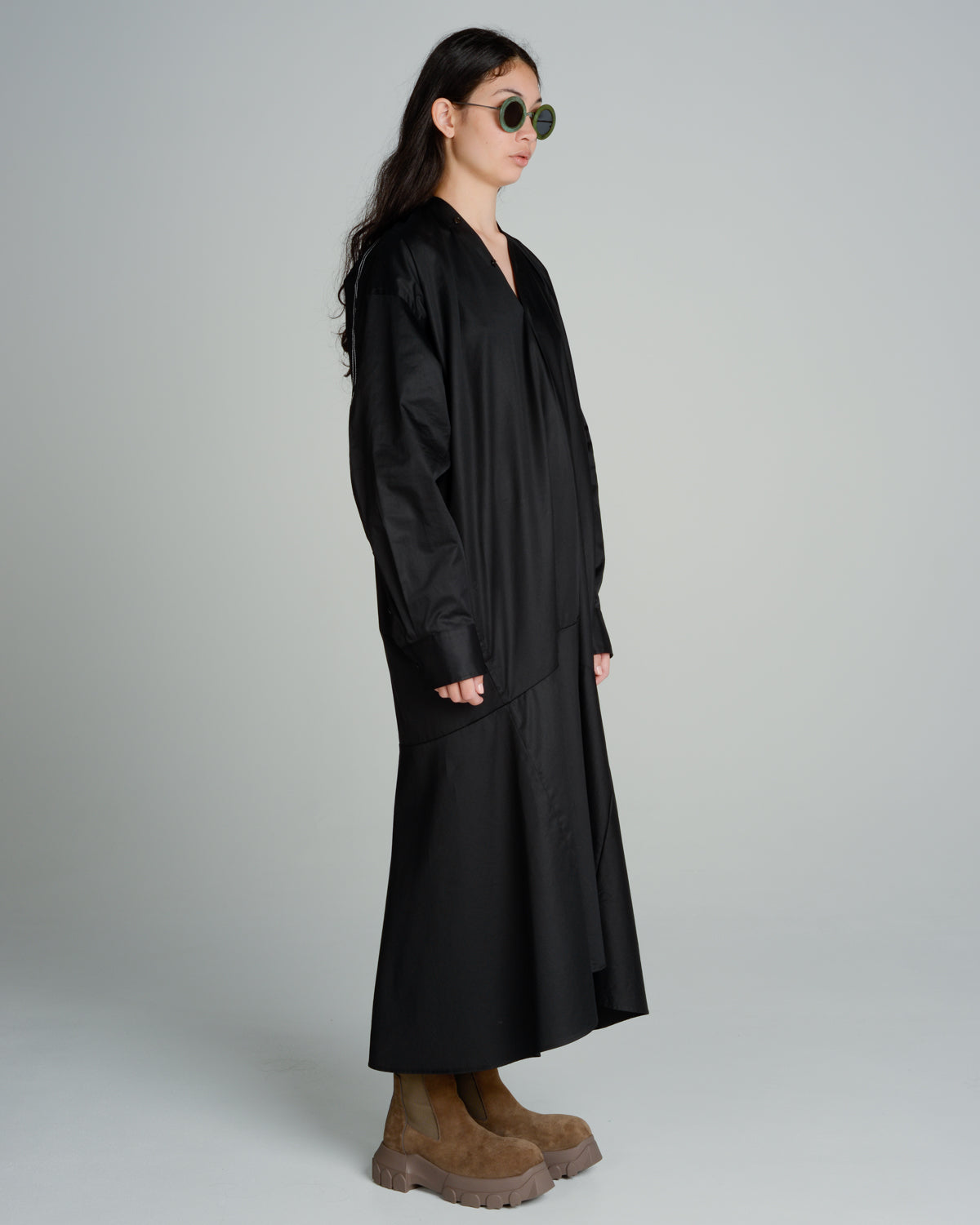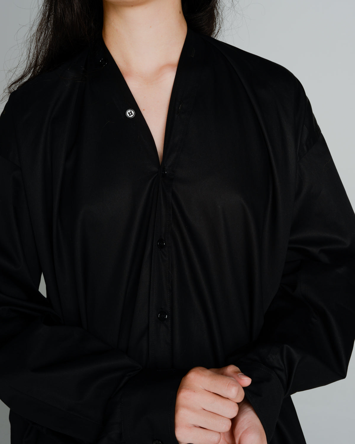 Collarless shirt dress by MM6 Maison Margiela. Substantial cotton poplin fabrication with a luxe sheen. Button placket extends over the shoulders to form a plunging V-neckline. Raw edge seam arches across the back with contrast white stitching. A shapely silhouette formed by gathering at the front and a dropped waist at the rear.