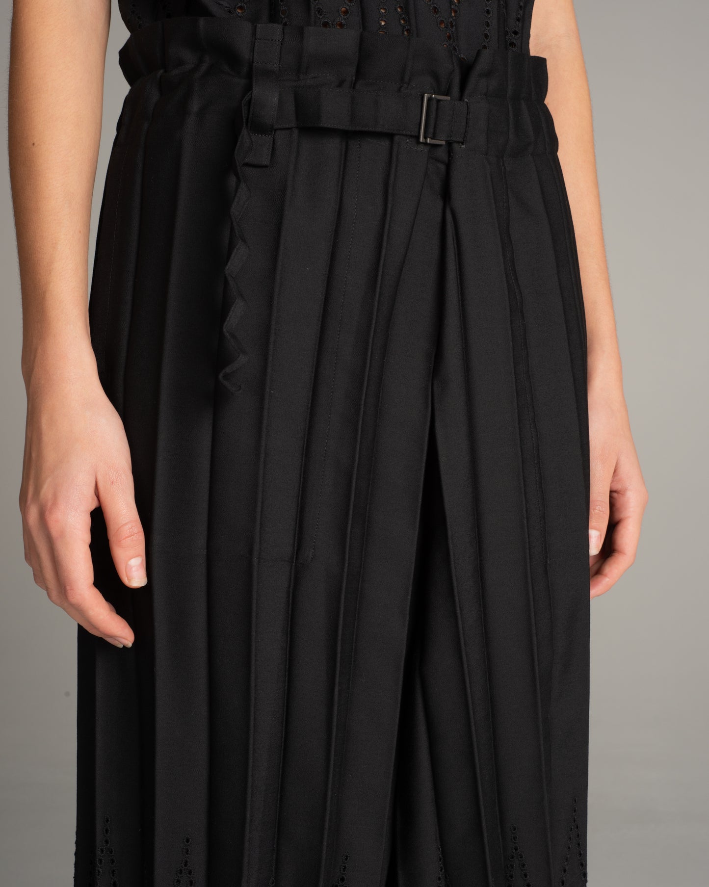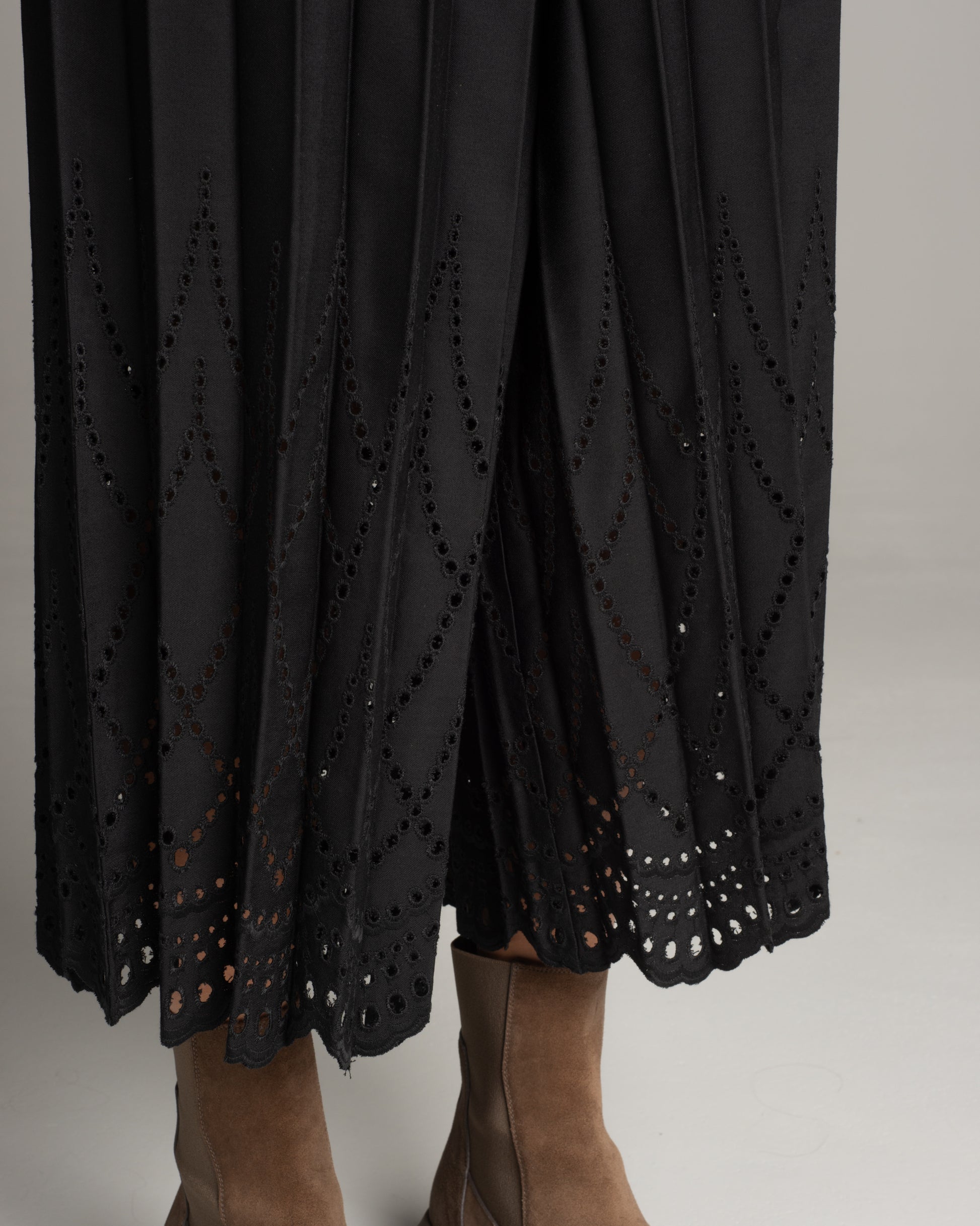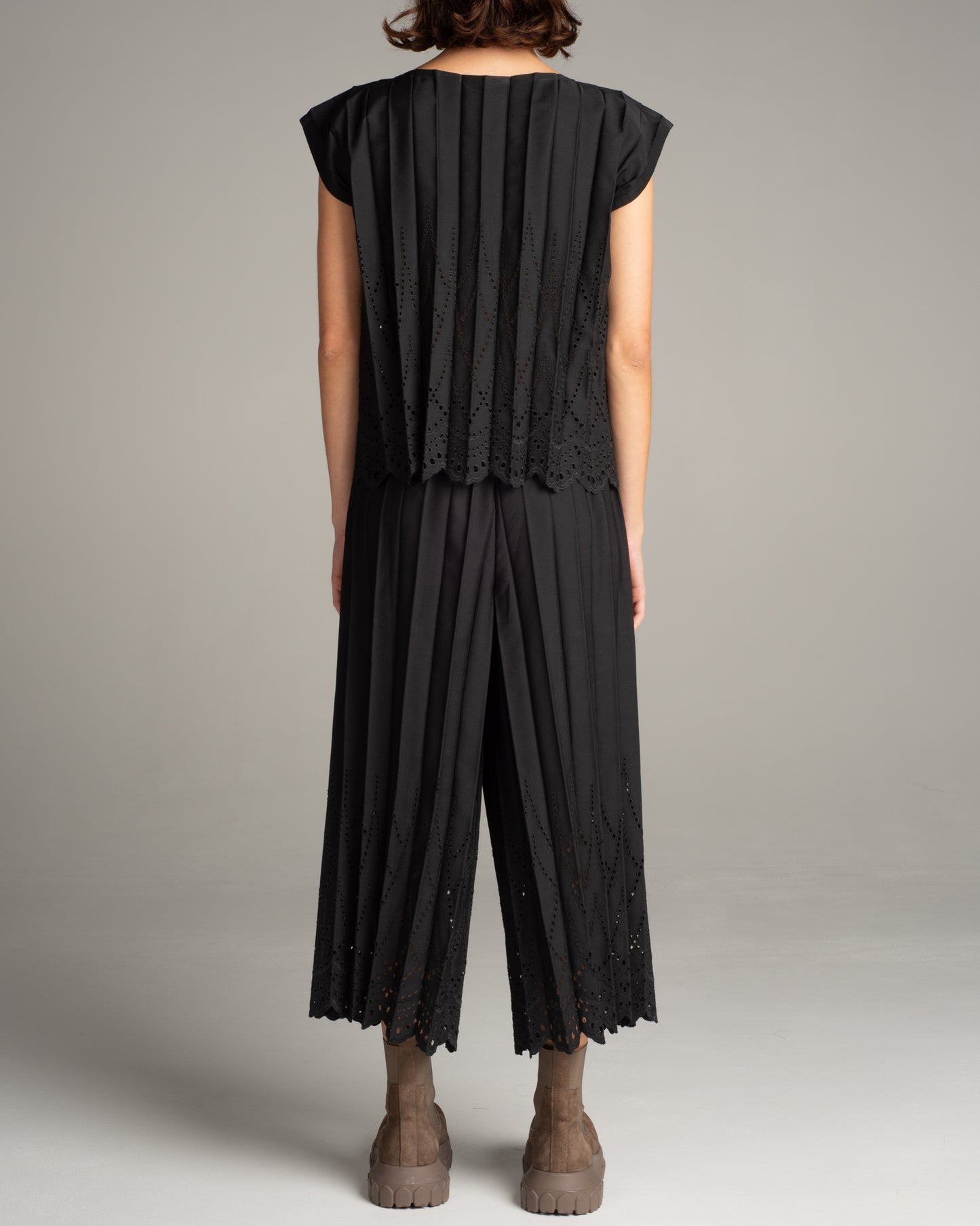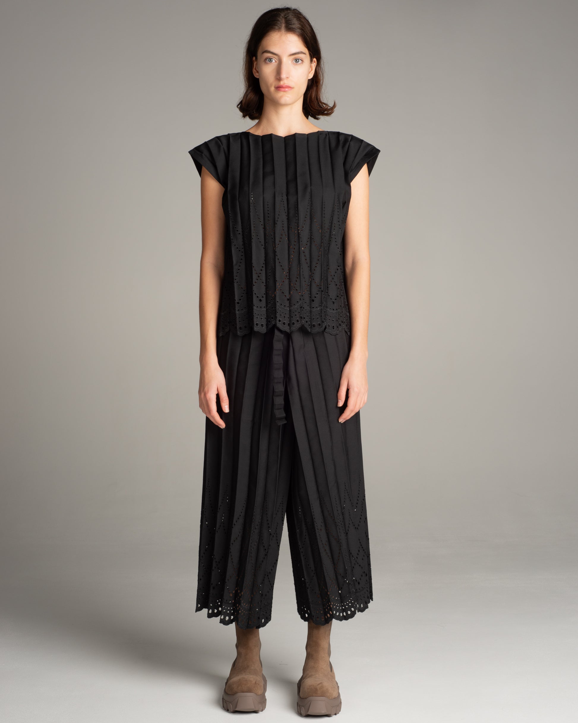 Lace pleats pants by Issey Miyake ME in black. Wide legged pants expressef with wide accordion pleating. Delicately embelished with lace like embroidery throughout. Fastened at the waist with self-adjusting pleated belt.