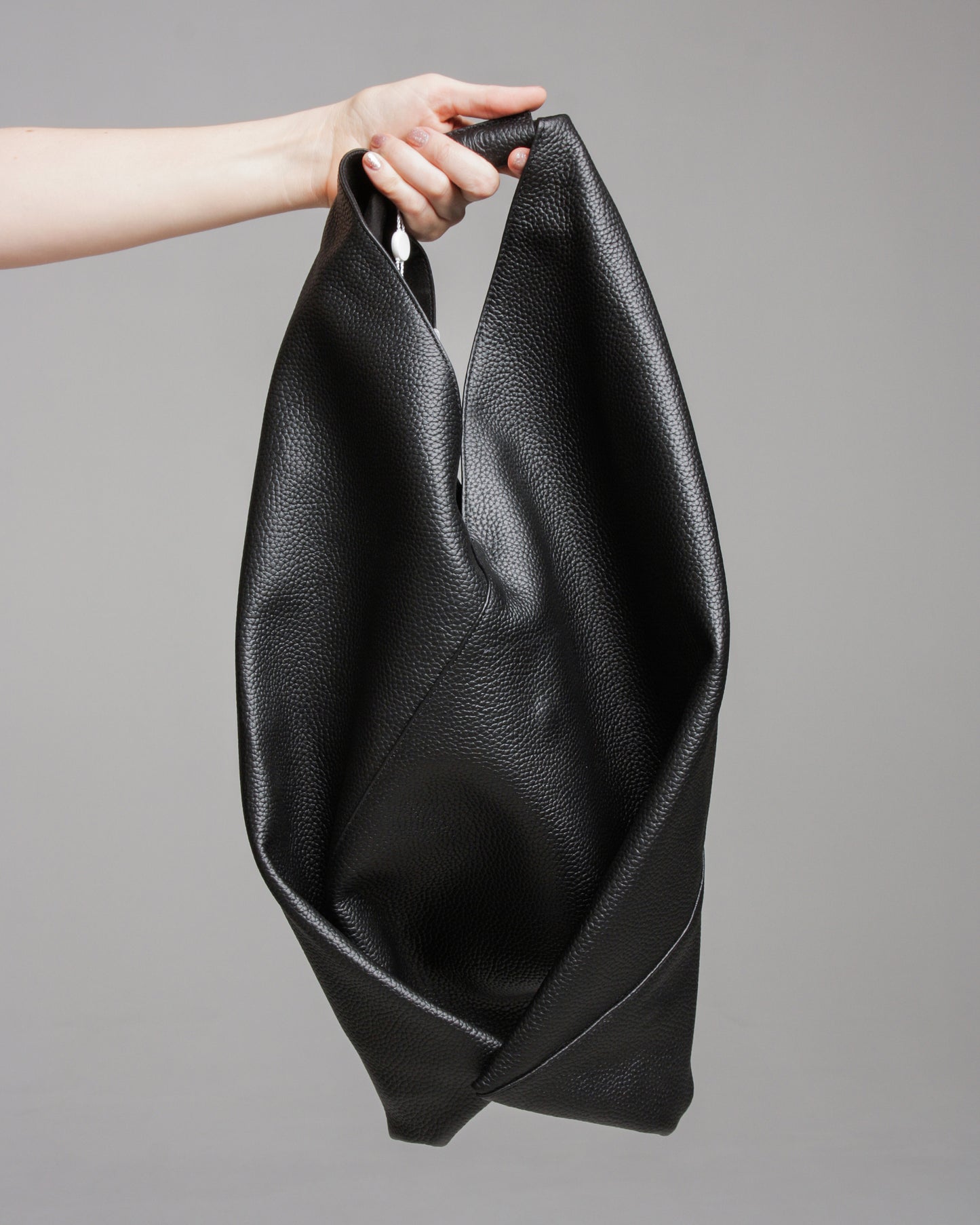 Leather Japanese bag by MM6 Maison Margiela in black leather. Inspired by traditional origami, the bag follows a triangular shape and is topped with a brand-embossed leather handle. Snap buttons at edges allow for changes in shape. Generously sized to carry essentials in the Maison's signature off-beat sense of style.