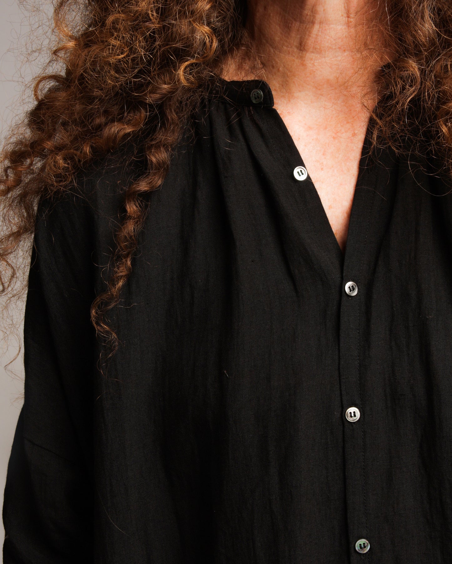 Linen dress by Ichi Antiquités in black. Relaxed fitting dress with slight gathering at a modest band collar and fully buttoned front. Dropped shoulders flow into mid length sleeves, finished with two side pockets and a wide silhouette. Simple and universally wearable.