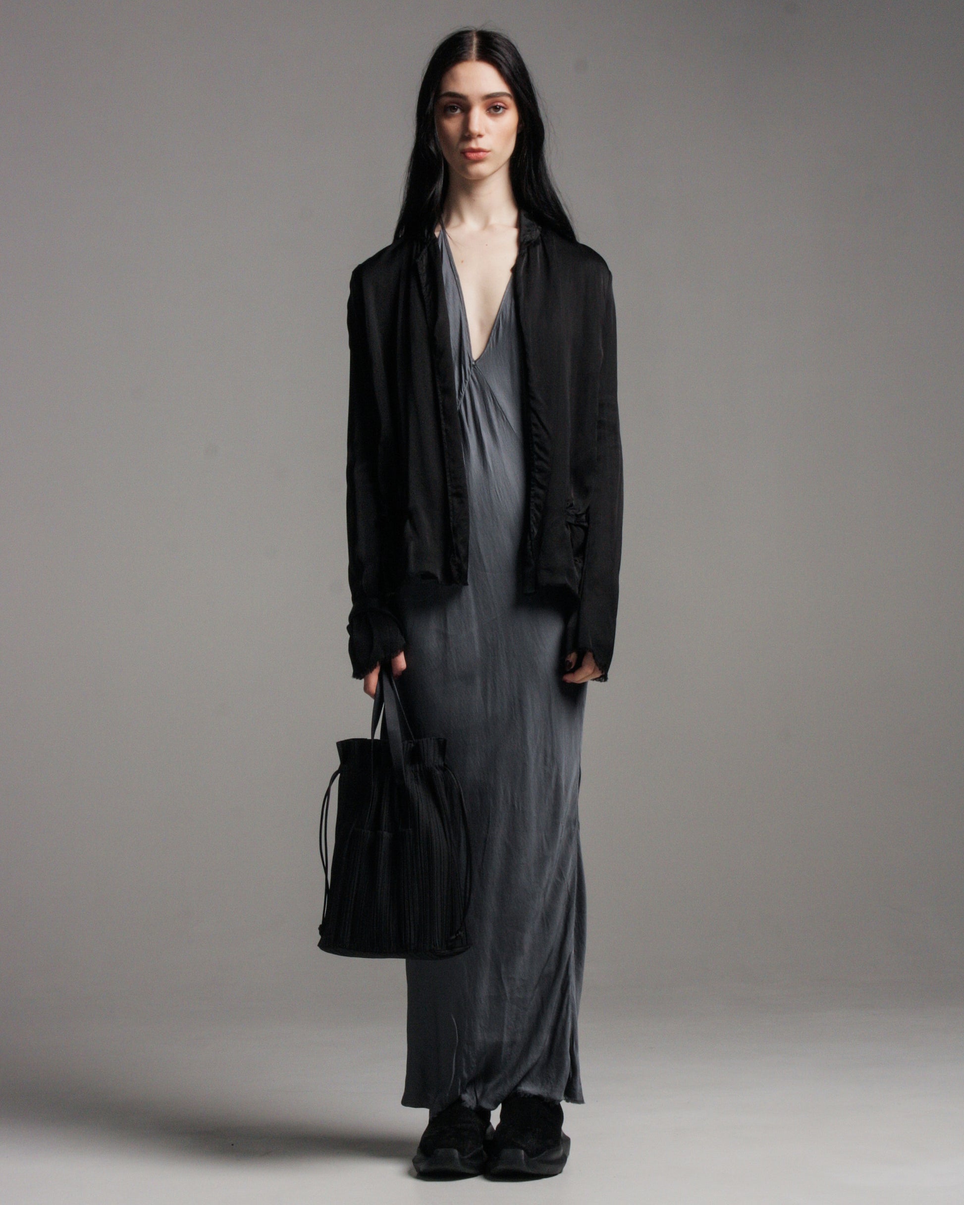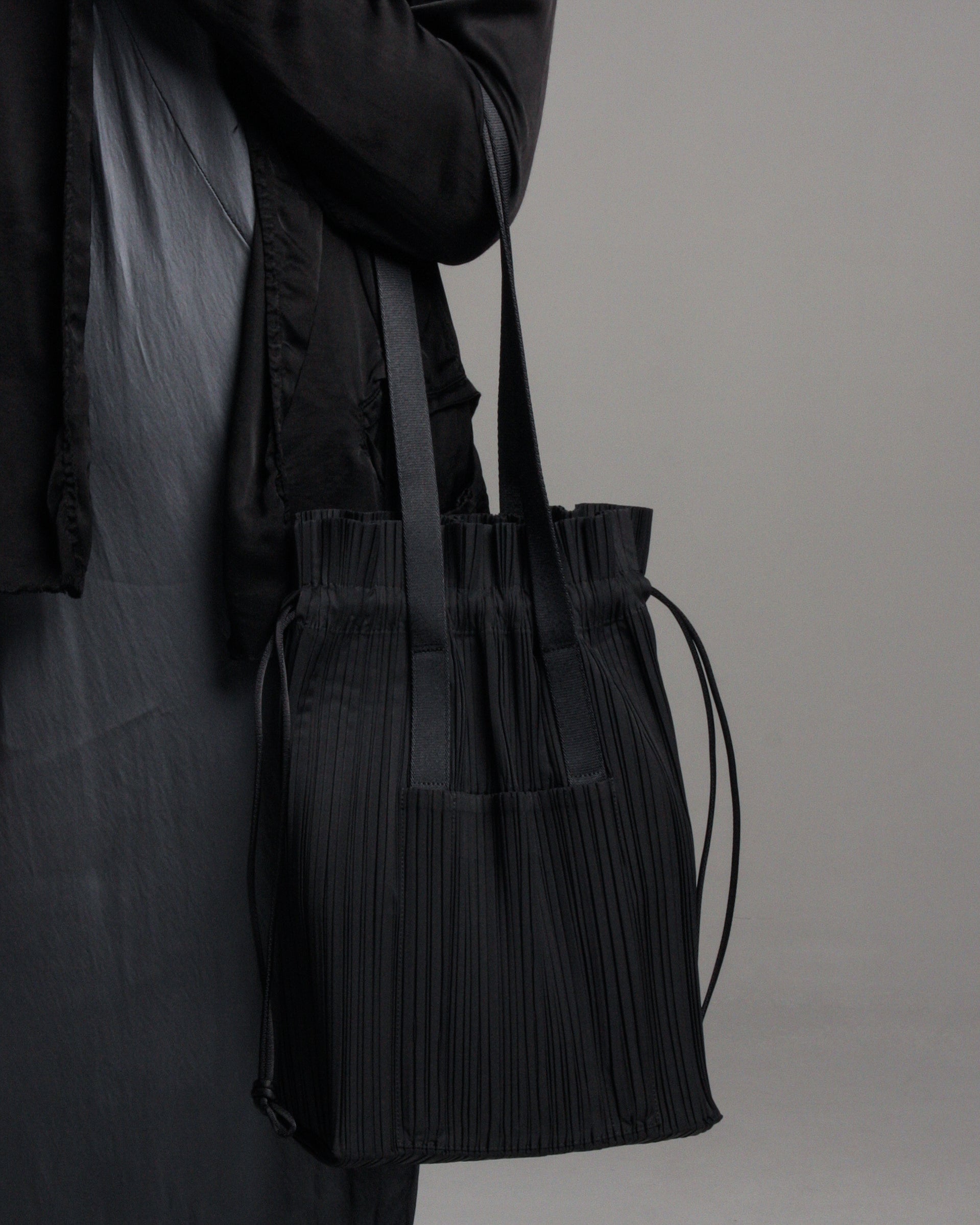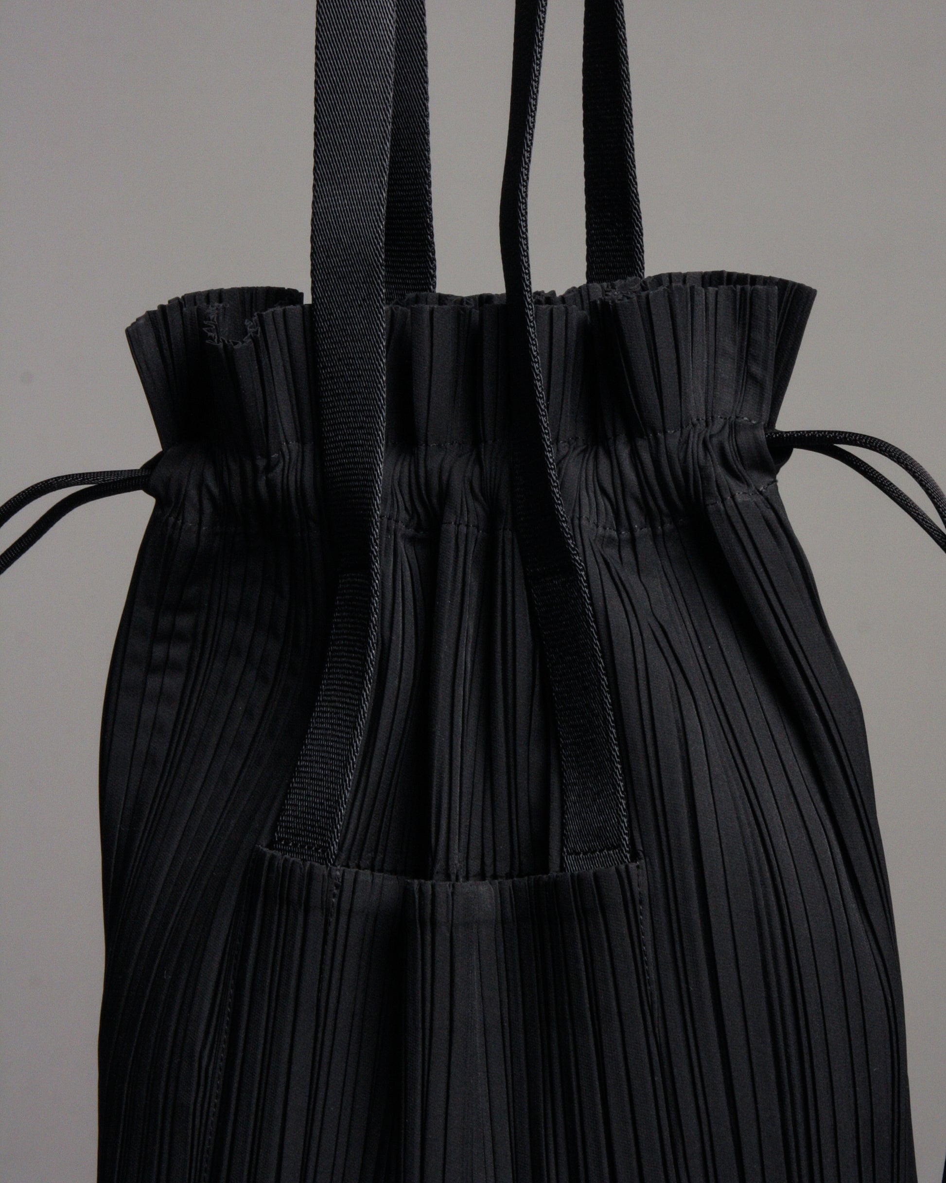 Pleated tote bag by Pleats Please Issey Miyake in black. Boxy tote bag crafted with thicker pleating. Features a sturdy gussetted base with patch pockets on both faces.