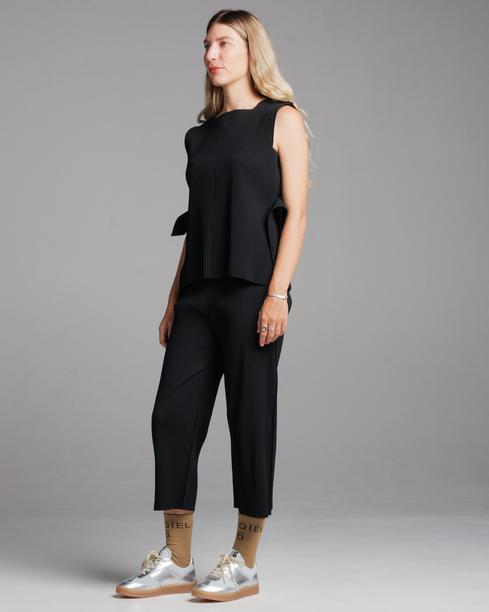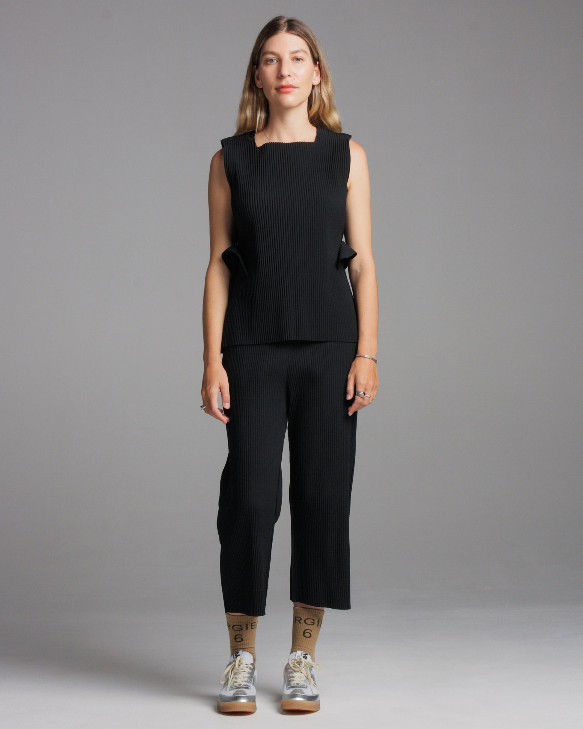 Step pleats tank top by Issey Miyake in black. Relaxed tank crafted with regular soft ribbed pleats. Elegant square neckline with extraneous side panels cut to drift away from the waist. Minimal, sleek and intriguing.