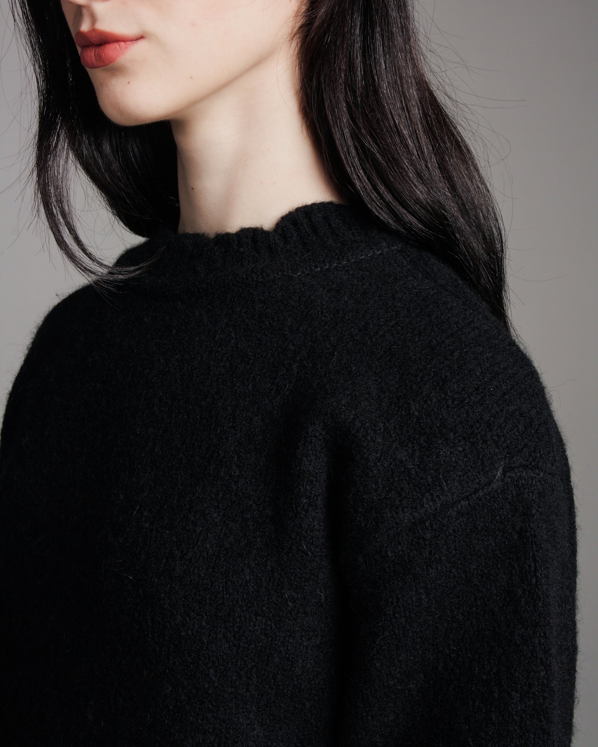 Wool sweater by Pas de Calais in black. Thick woolly knit woven with a blend of yak and alpaca fleece. Exceptionally plush, soft and comforting. Ribbed neckline and cuffs have an irregular, rugged finish. Subtly detailed with a loose weave mohair fringe along the hemline.
