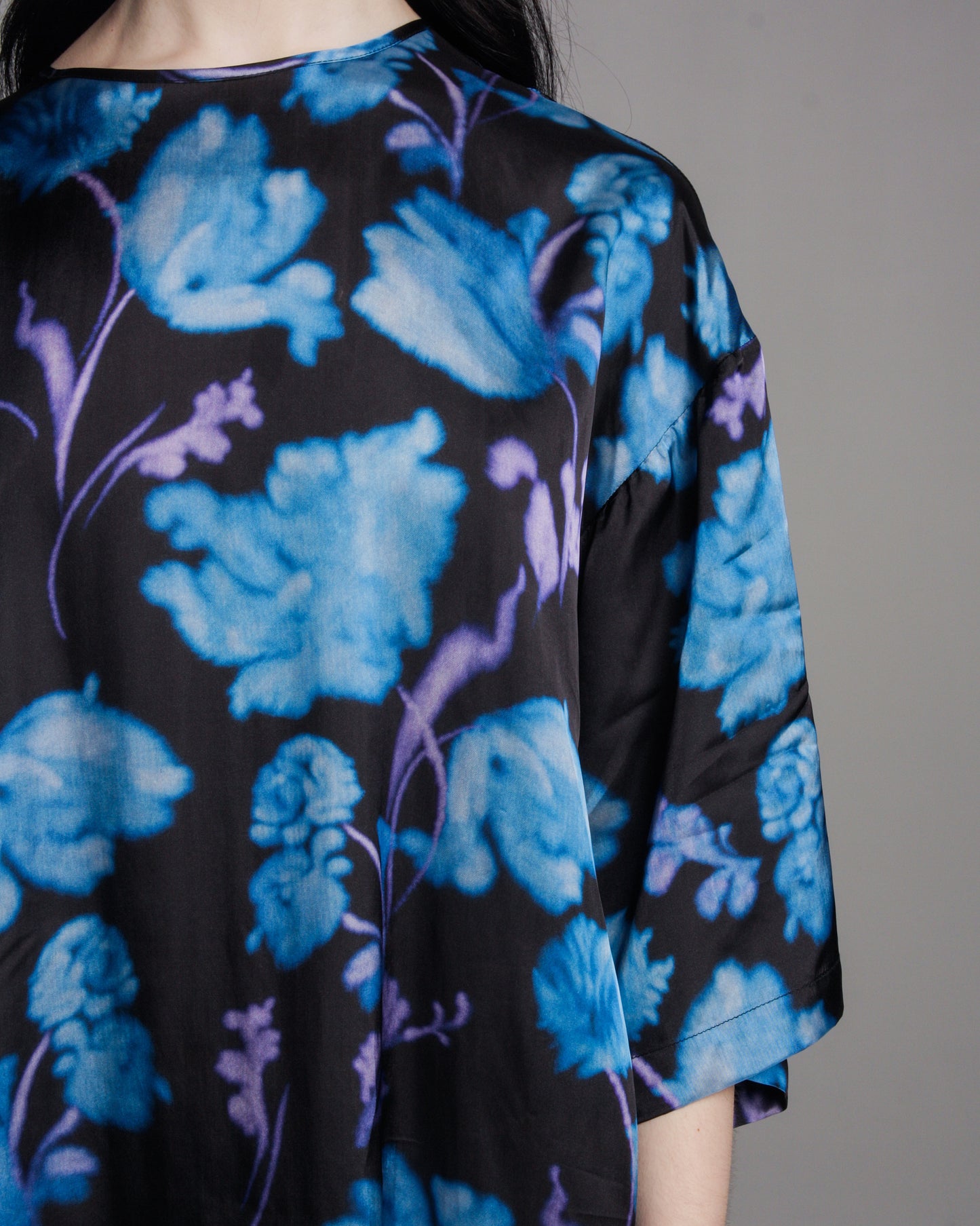 Darica dress by Christian Wijnants with blue peonies. Glossy viscose blend with vivifying peony print. One side enchants in a kaftan style opening while the other settles into a classic short sleeve. Dramatic and billowing relaxed fit with asymmetric hemline. Single button and loop fastening at the nape.