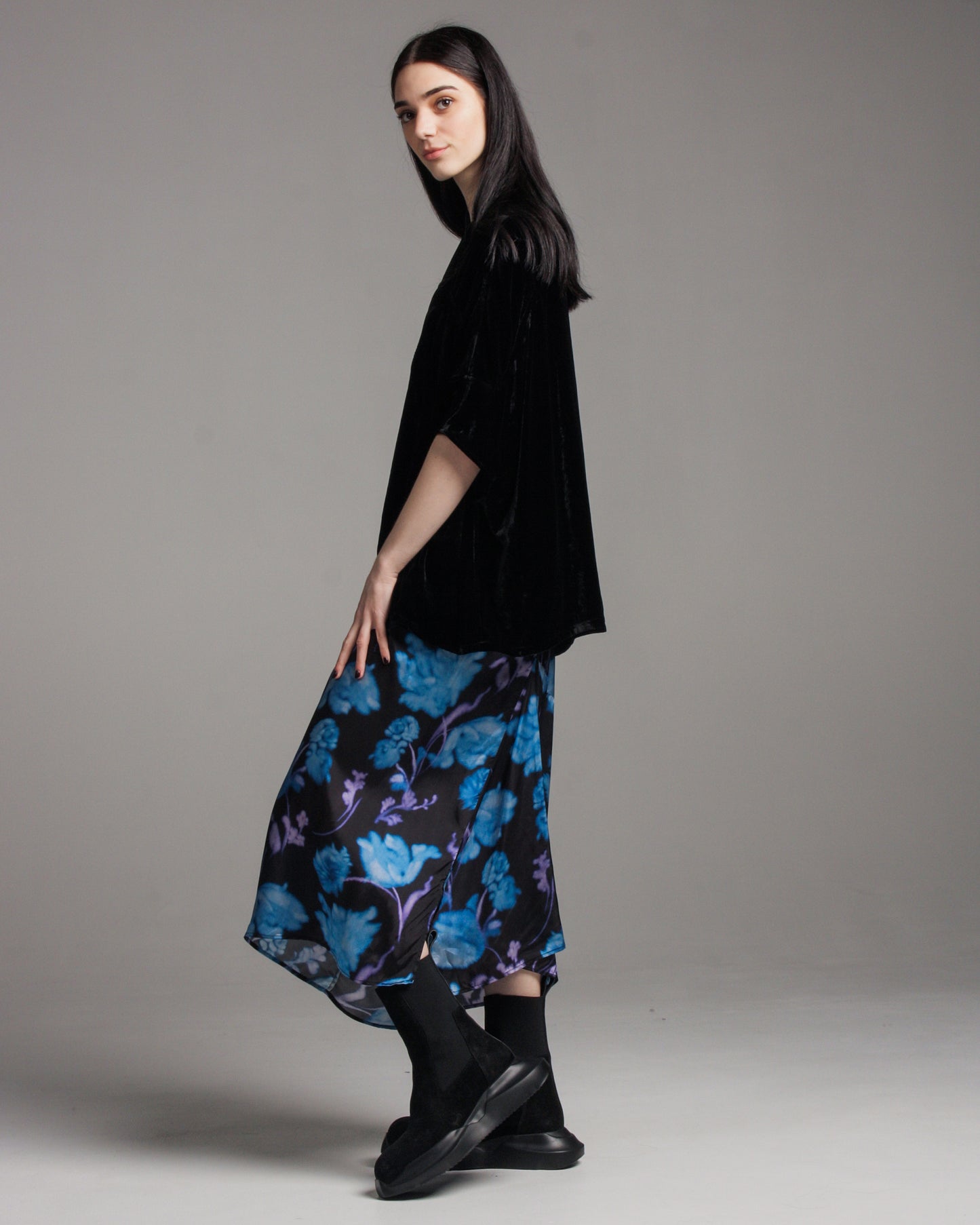 Sonam skirt by Christian Wijnants with blue peonies. Elegant mid length with elastic waist, featuring a rousing peony print set against black. Folded detail at the front falls to a wider hem, with asymmetric panelling at the rear creating a uniquely jagged hem. Lightweight, breezy and easy to wear.