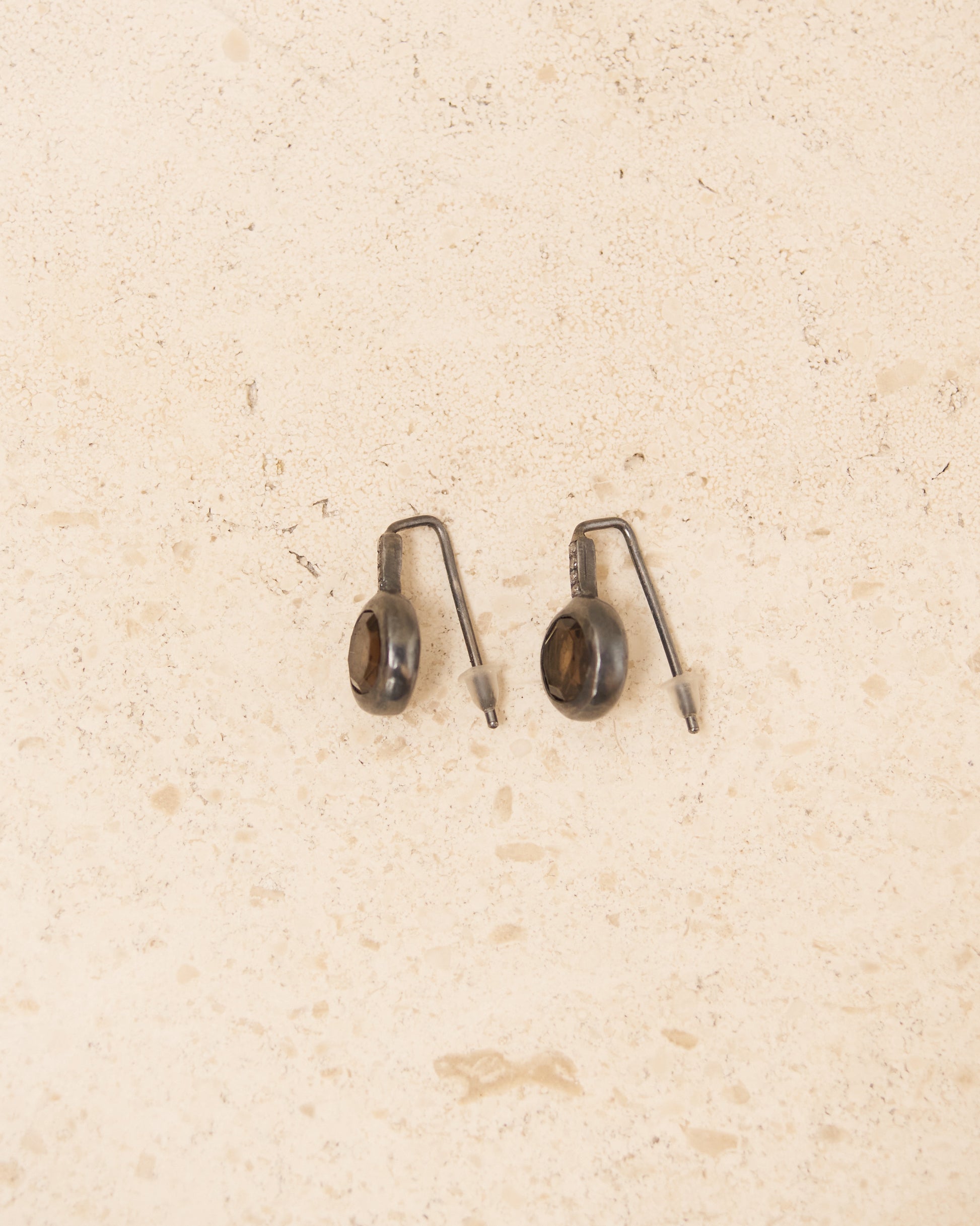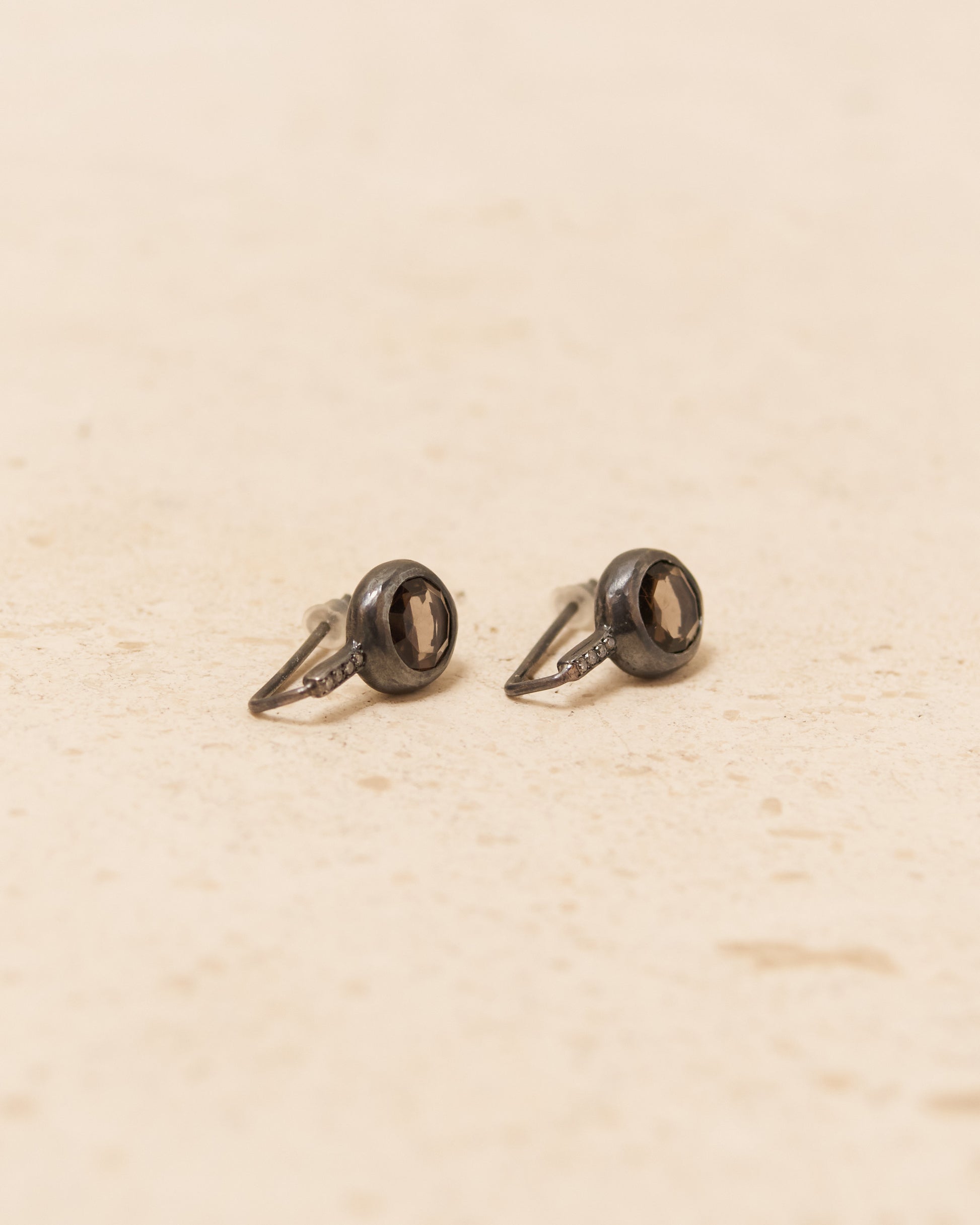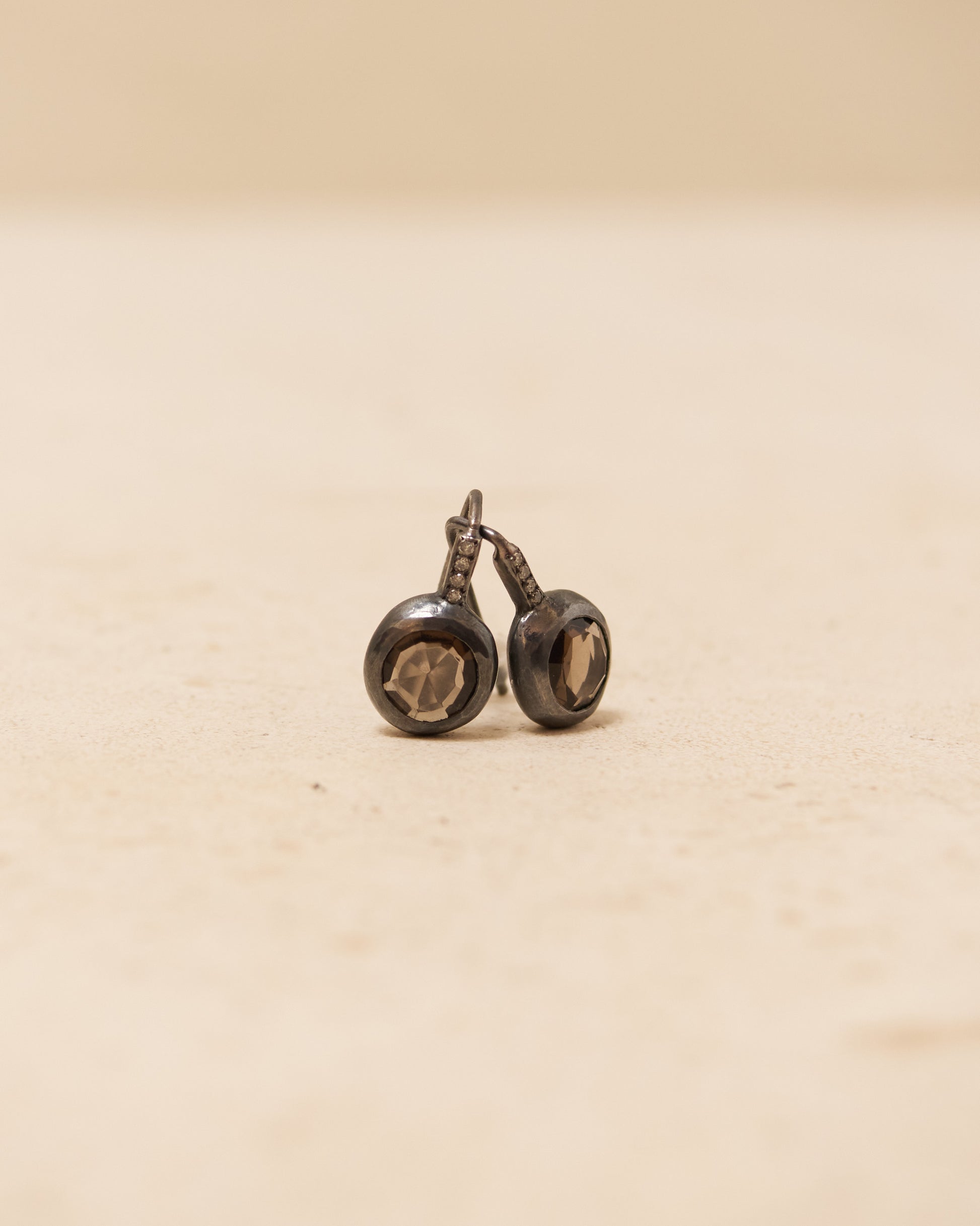 Beenu earrings by Rosa Maria with smoky quartz. Oxidised sterling silver drop earrings featuring large round-cut quartz stones in an enchanting shade of deep brown. Four icy grey diamonds line the post.