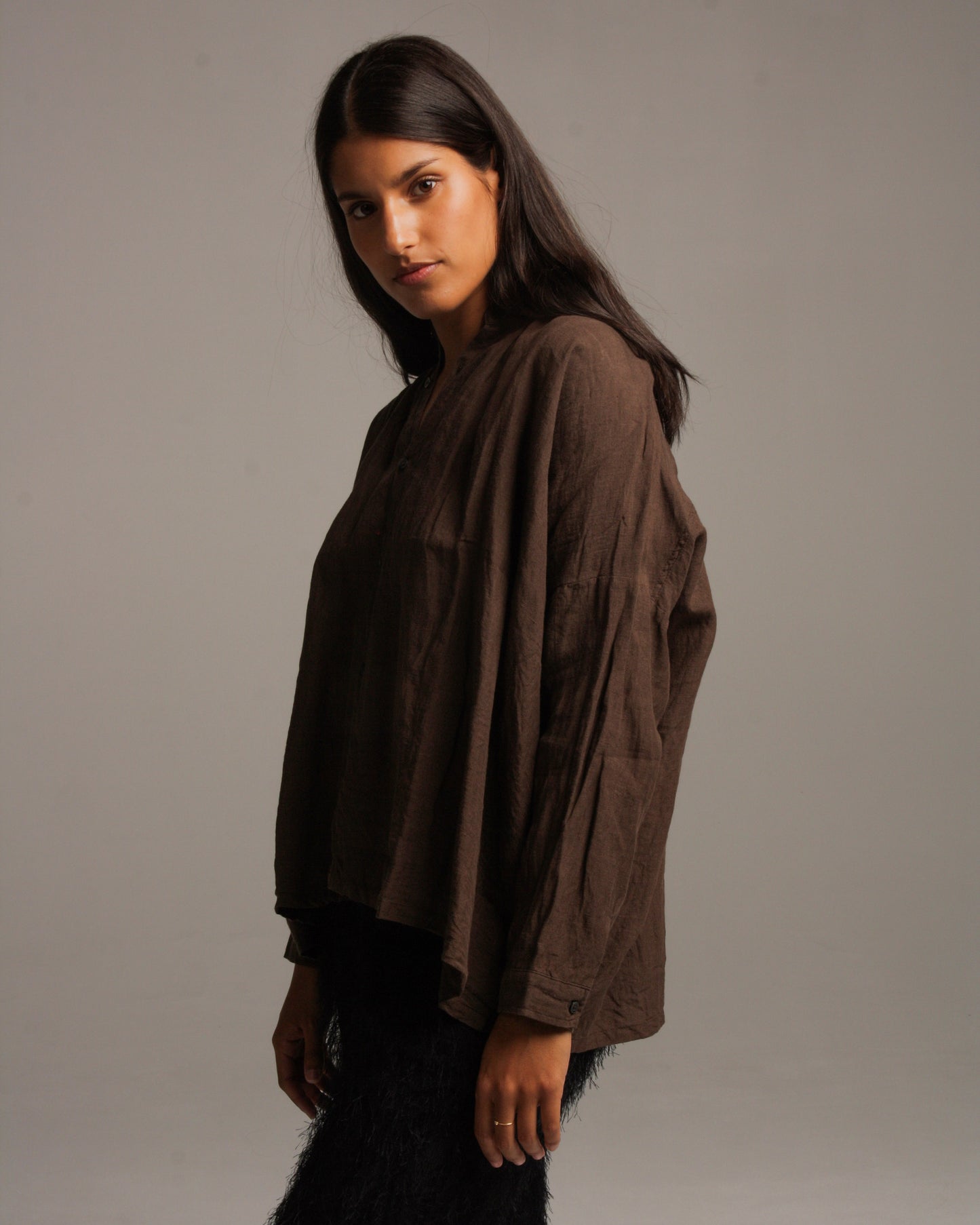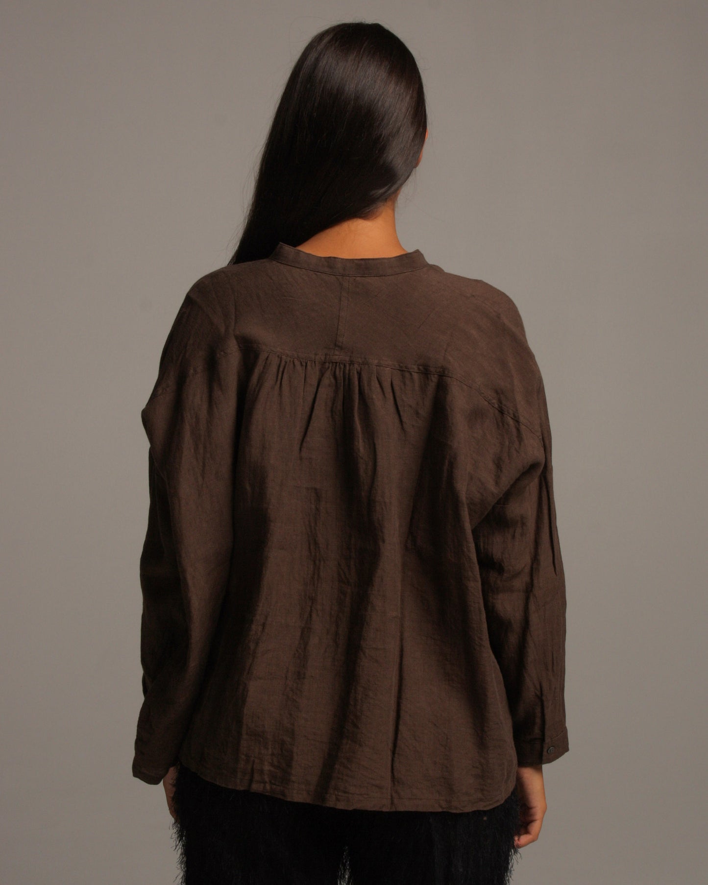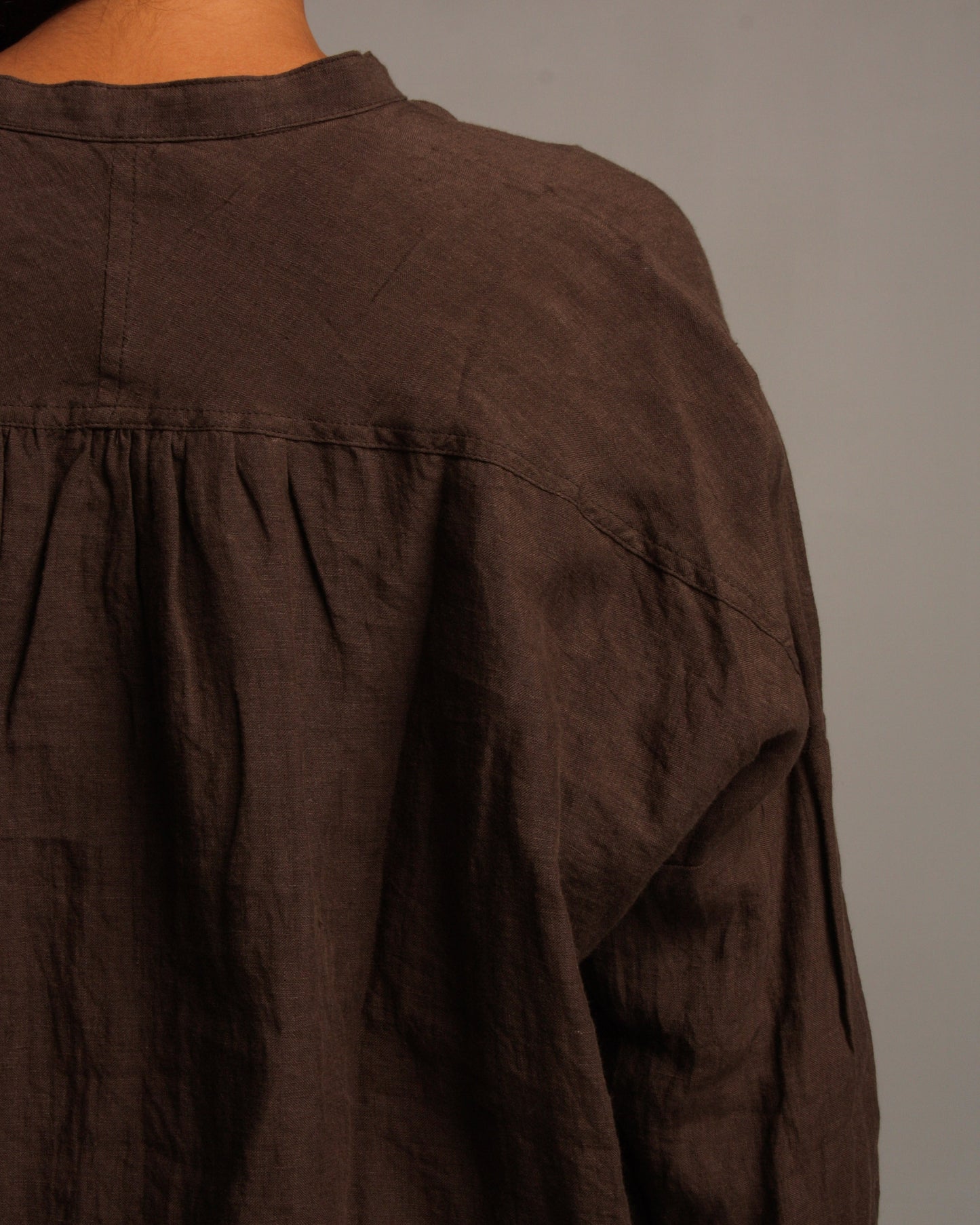 Linen shirt by Ichi Antiquités in brown. Band collar shirt with a flowing, relaxed silhouette. Dropped shoulders turn into wider fit sleeves. Simple and provincial dressing with comfort in mind.