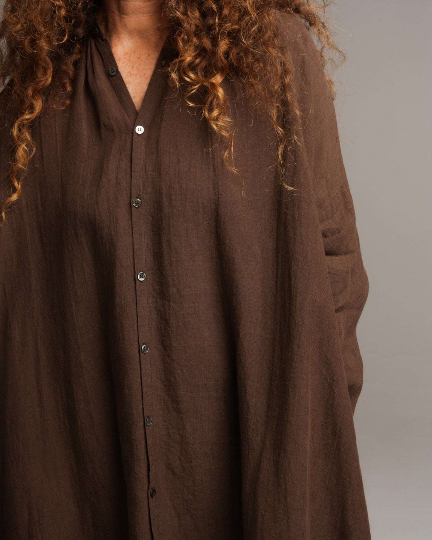 Linen shirt dress by Ichi Antiquités in brown. Relaxed fitting dress with slight gathering at a modest band collar and fully buttoned front. Dropped shoulders flow into mid length sleeves, finished with two side pockets and a wide silhouette. Rustic, charming and endlessly wearable.