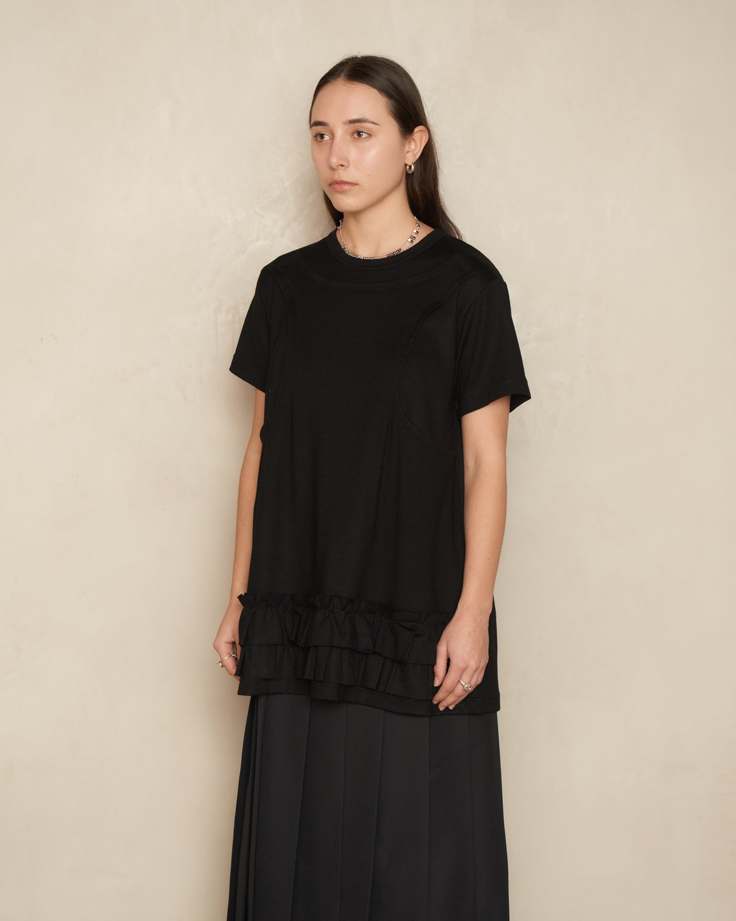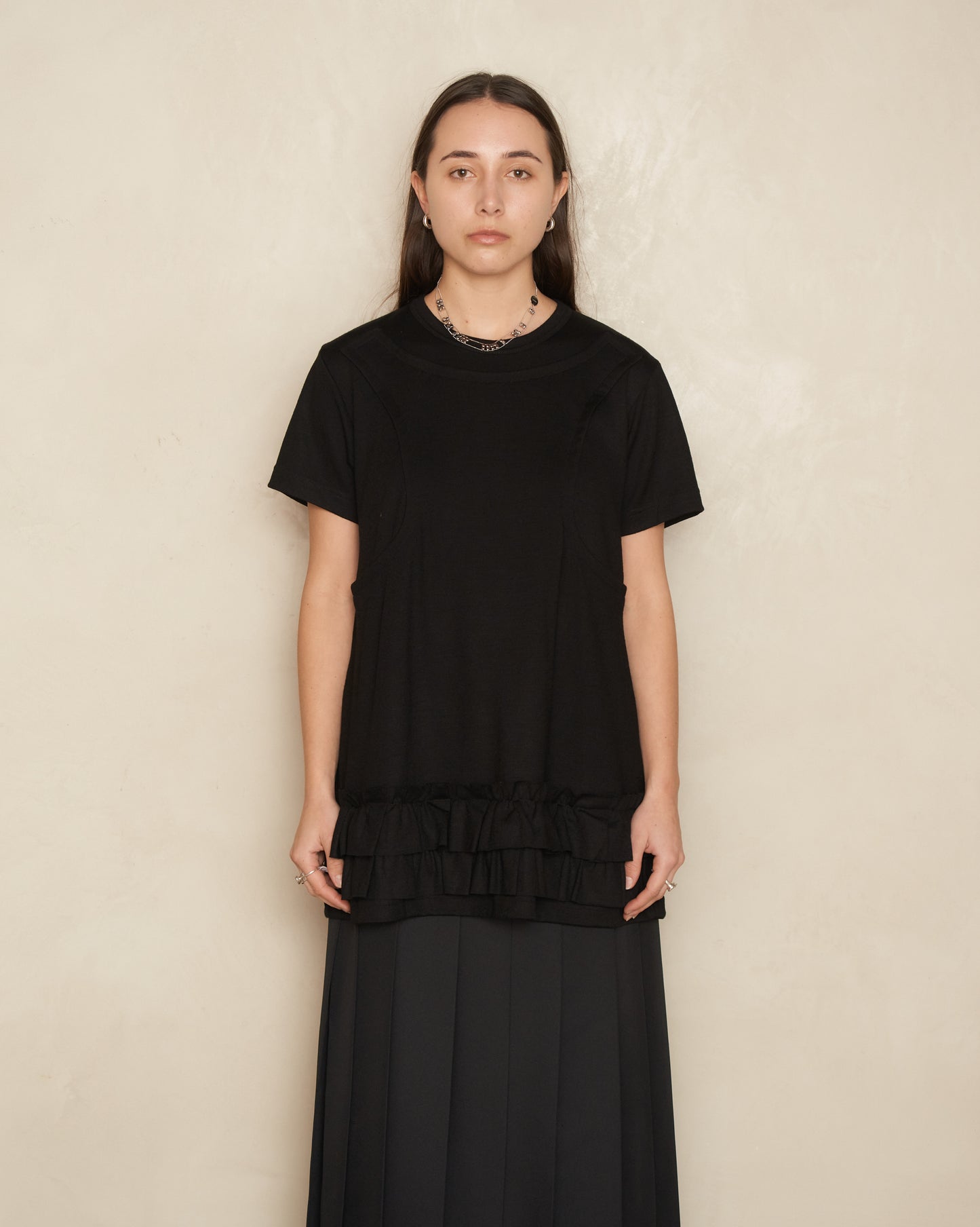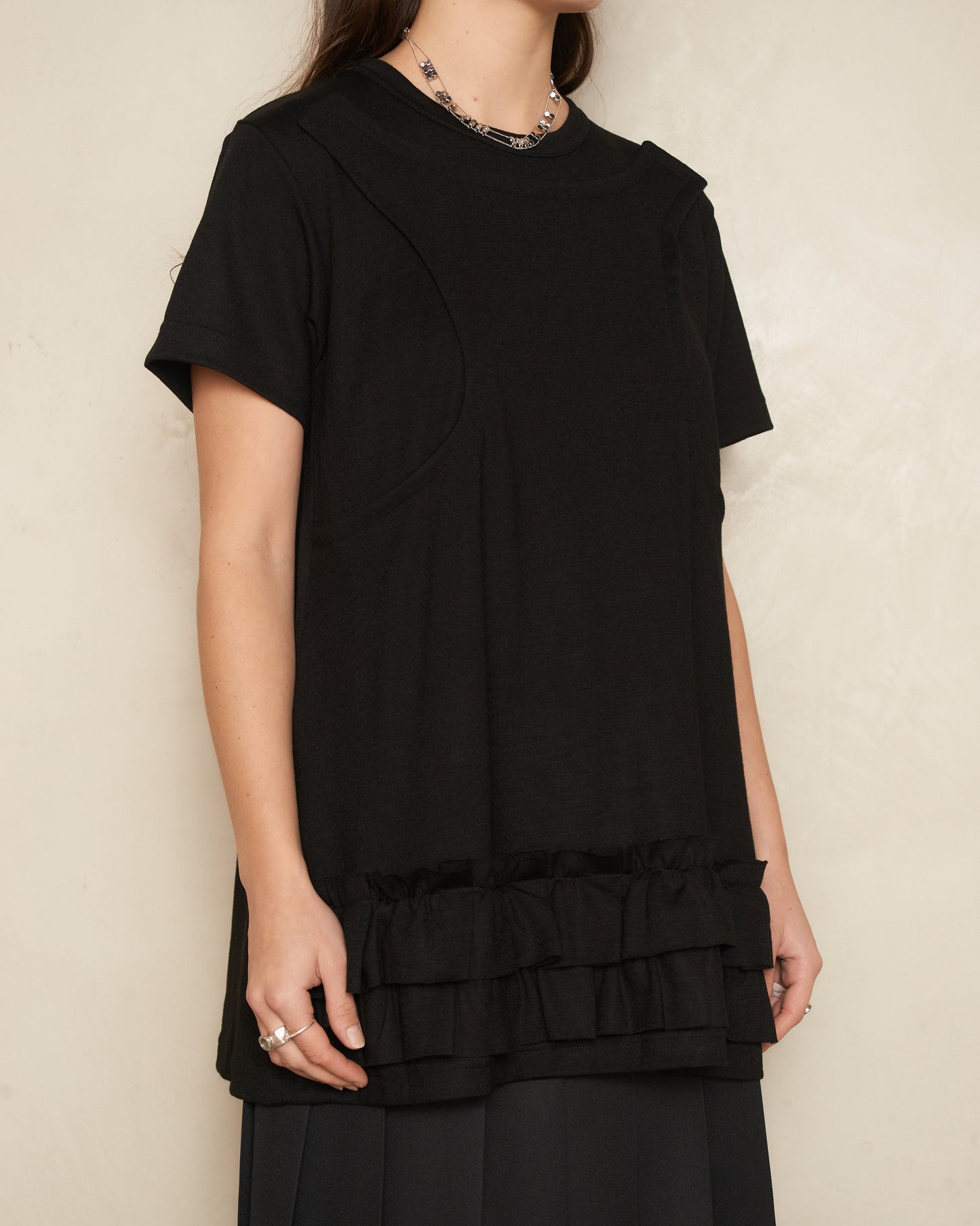 Panelled ruffle hem T-shirt by Comme des Garçons Comme des Garçons in black. Relaxed crewneck style crafted in delicately fine wool. A tank-style attachment subtly adorns the front, while ruched detailing at the hem make a more obvious textural statement.