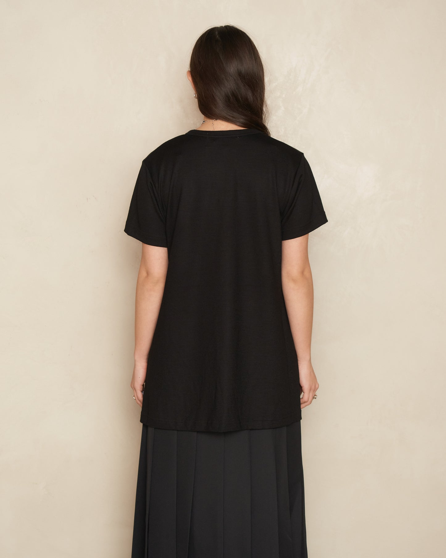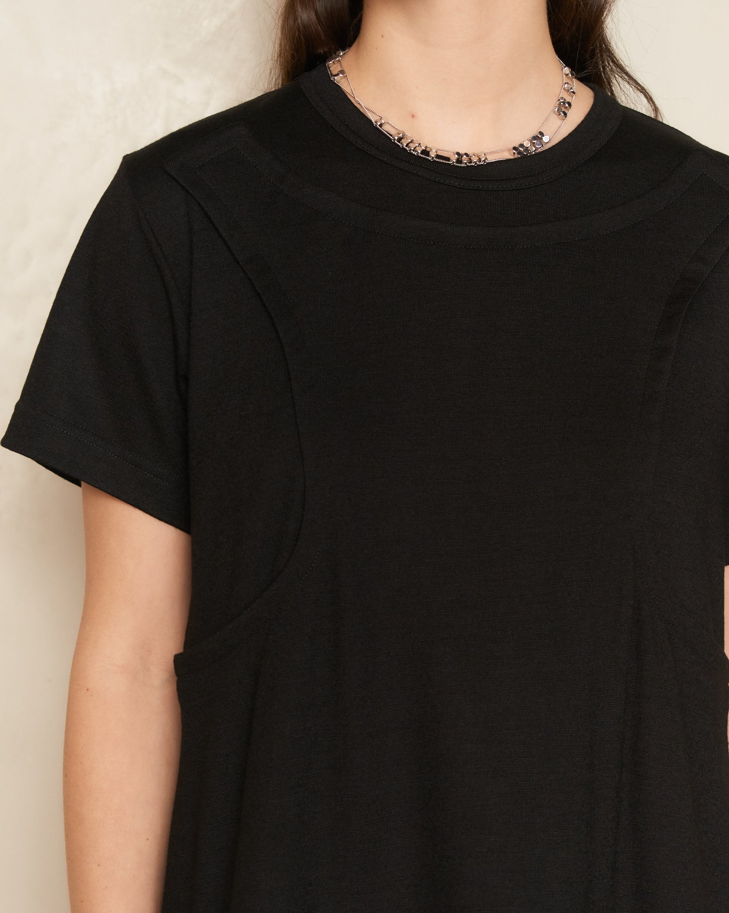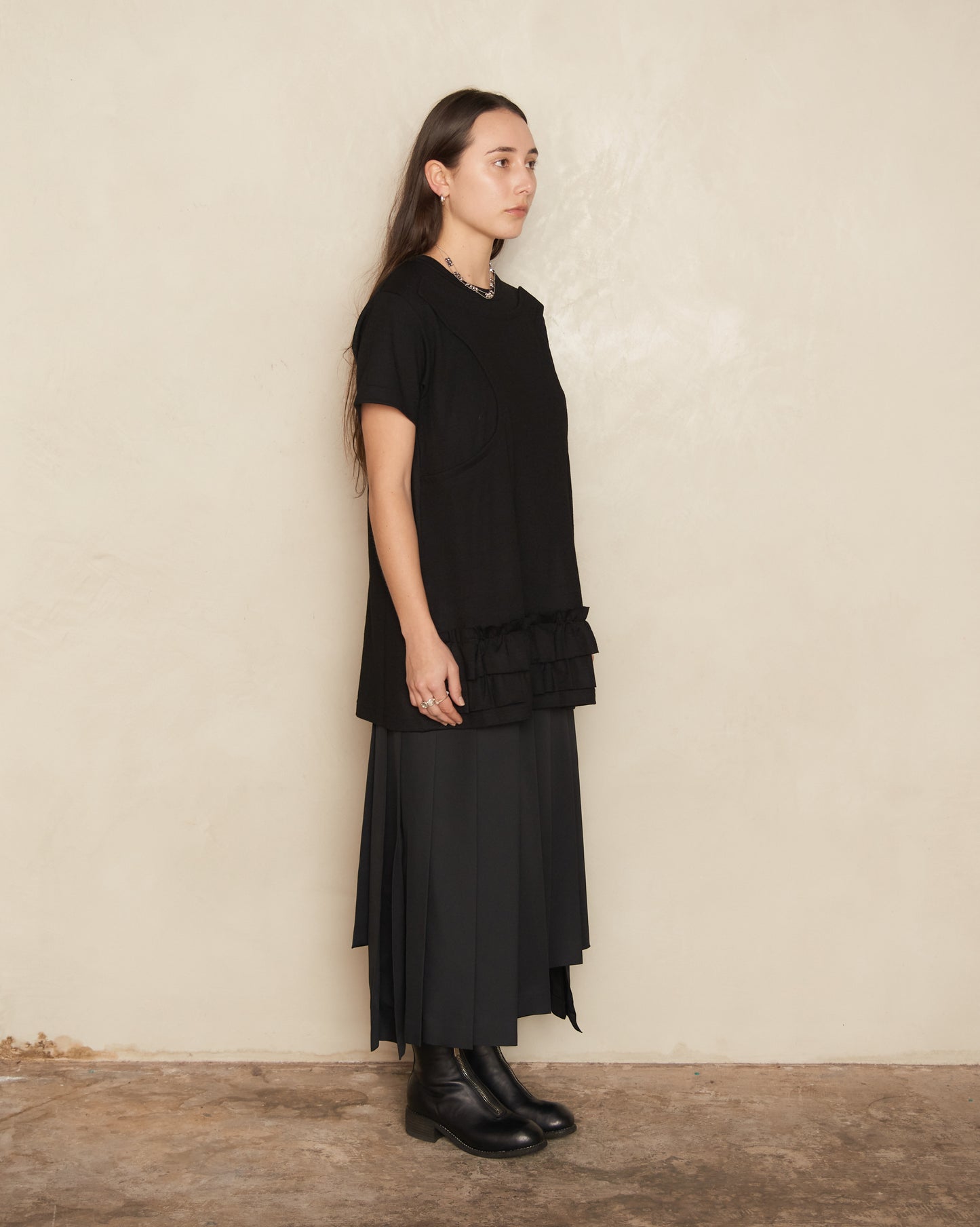 Panelled ruffle hem T-shirt by Comme des Garçons Comme des Garçons in black. Relaxed crewneck style crafted in delicately fine wool. A tank-style attachment subtly adorns the front, while ruched detailing at the hem make a more obvious textural statement.