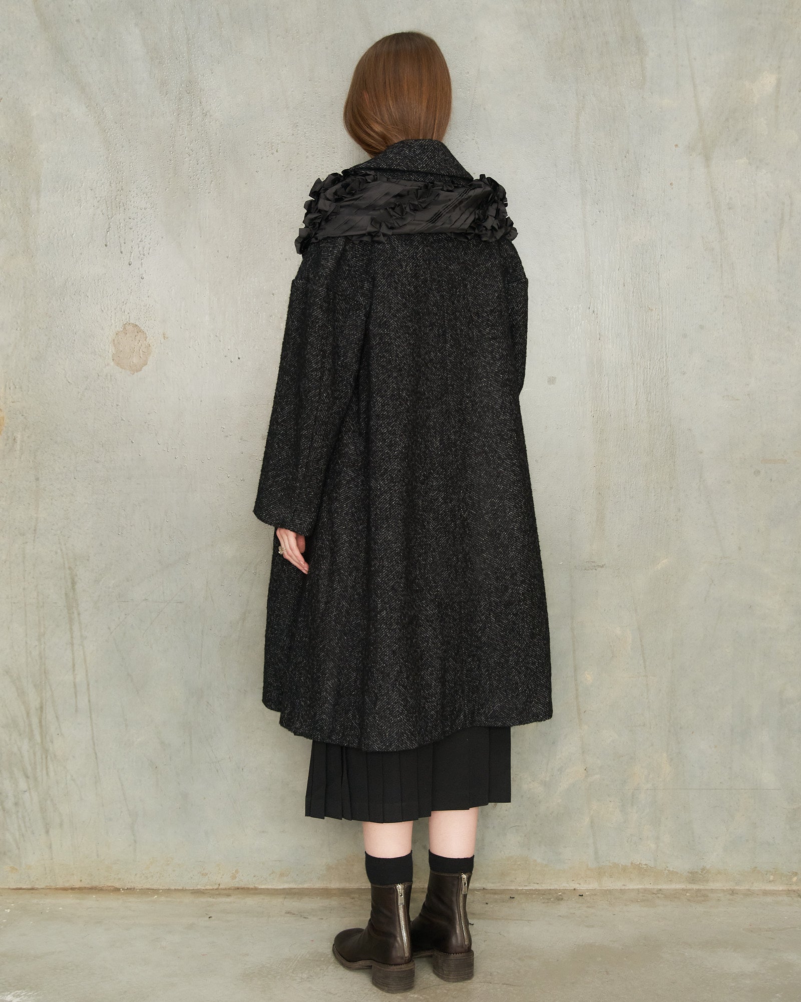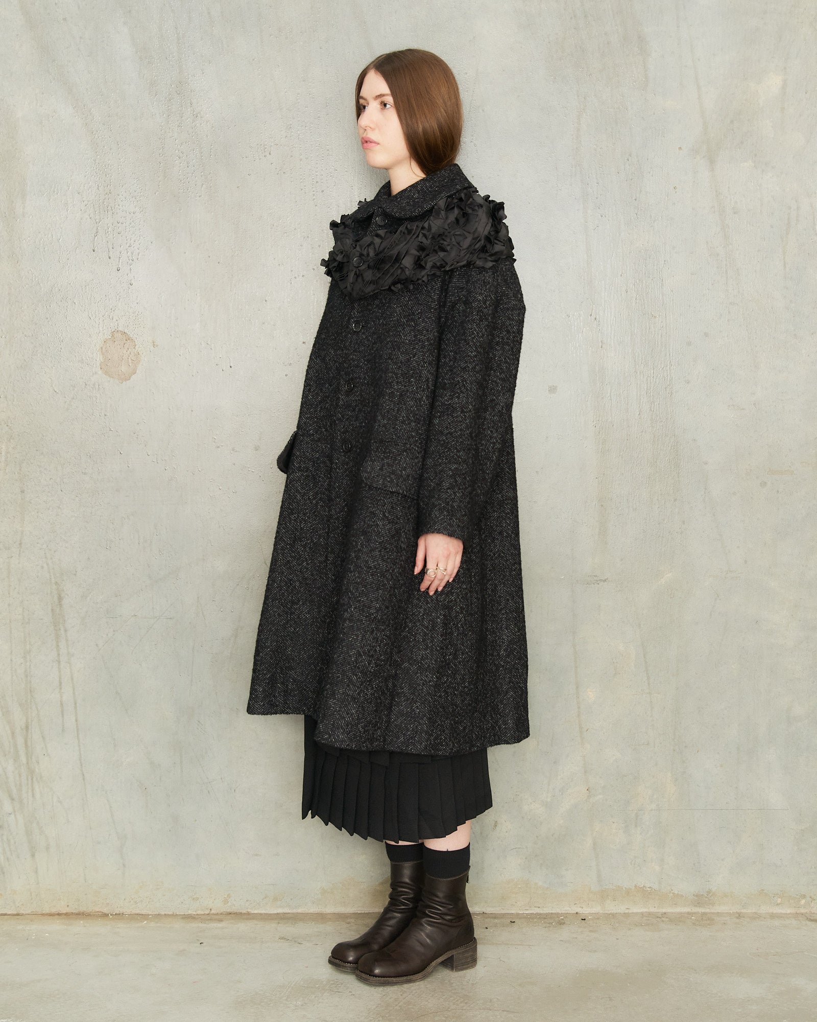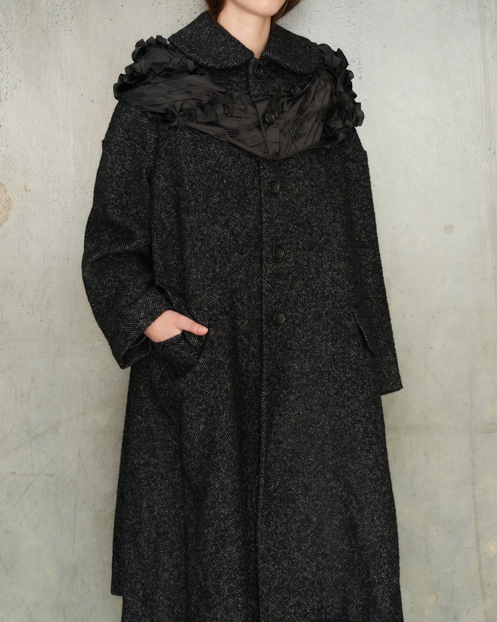 Hooded coat by Comme des Garçons Comme des Garçons in grey herringbone. An enveloping overcoat in dense herringbone wool, detailed with a full button fastening and rounded Peter Pan collar. A contrasting ruffled ring encircles the neckline, echoed by a matching hood that adds sculptural charm and function.