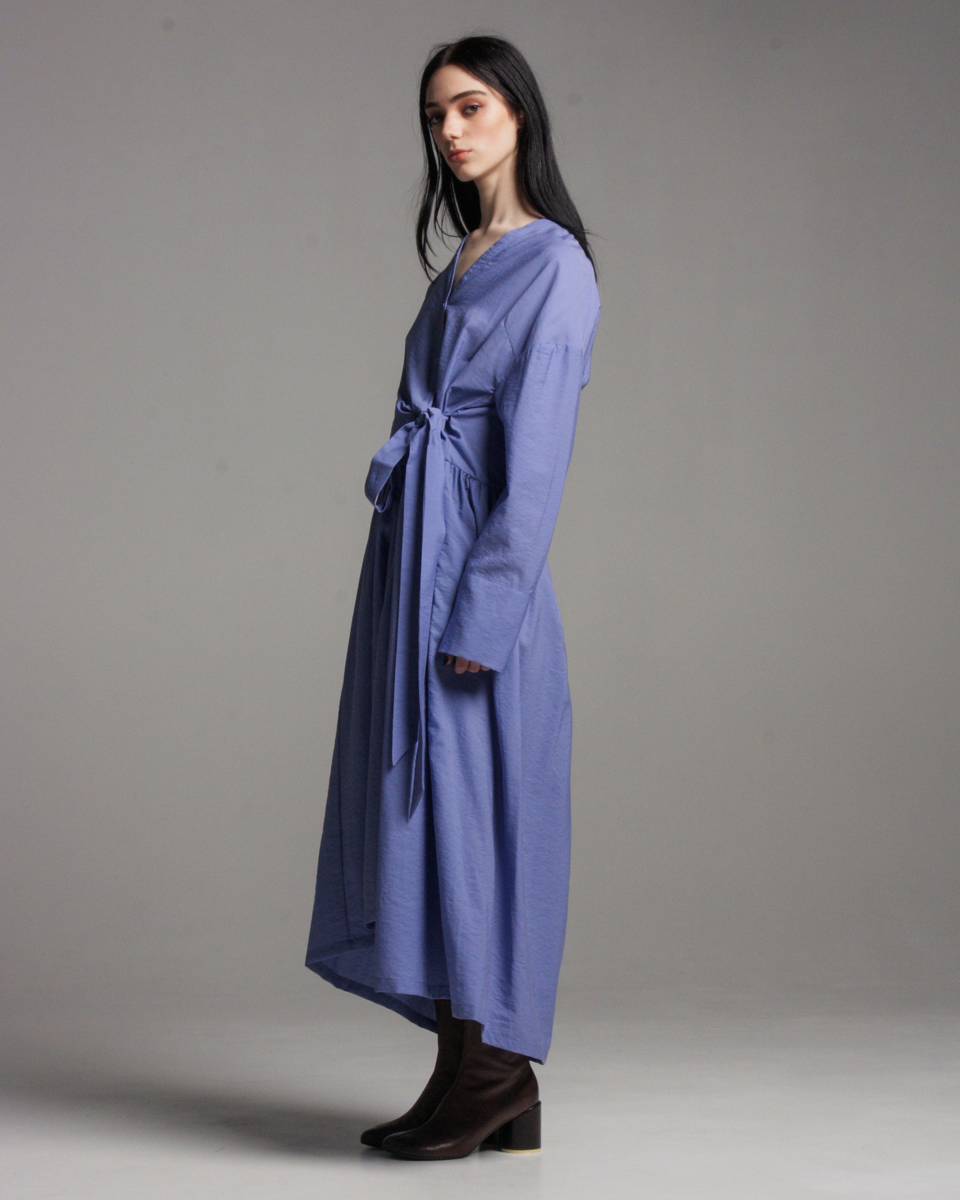 Dalla lavender shirtdress by Christian Wijnants. Fully buttoned V-neck dress in a svelte blend of virgin wool and nylon. Oversize styling with long ribbon acting to cinch the waist and add elegant embellishment. Gathered pleating and maxi length.