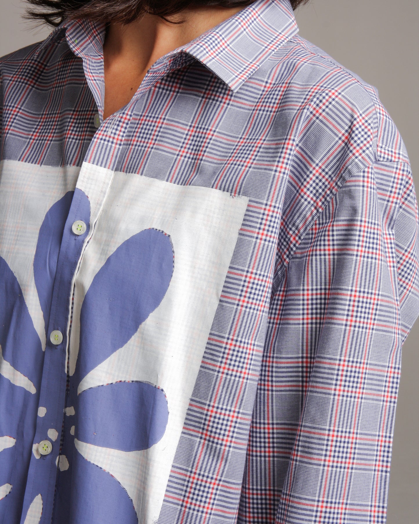 "Dante" shirt by Mariaan Pugh in red and blue check with white and blue flower screen print.
