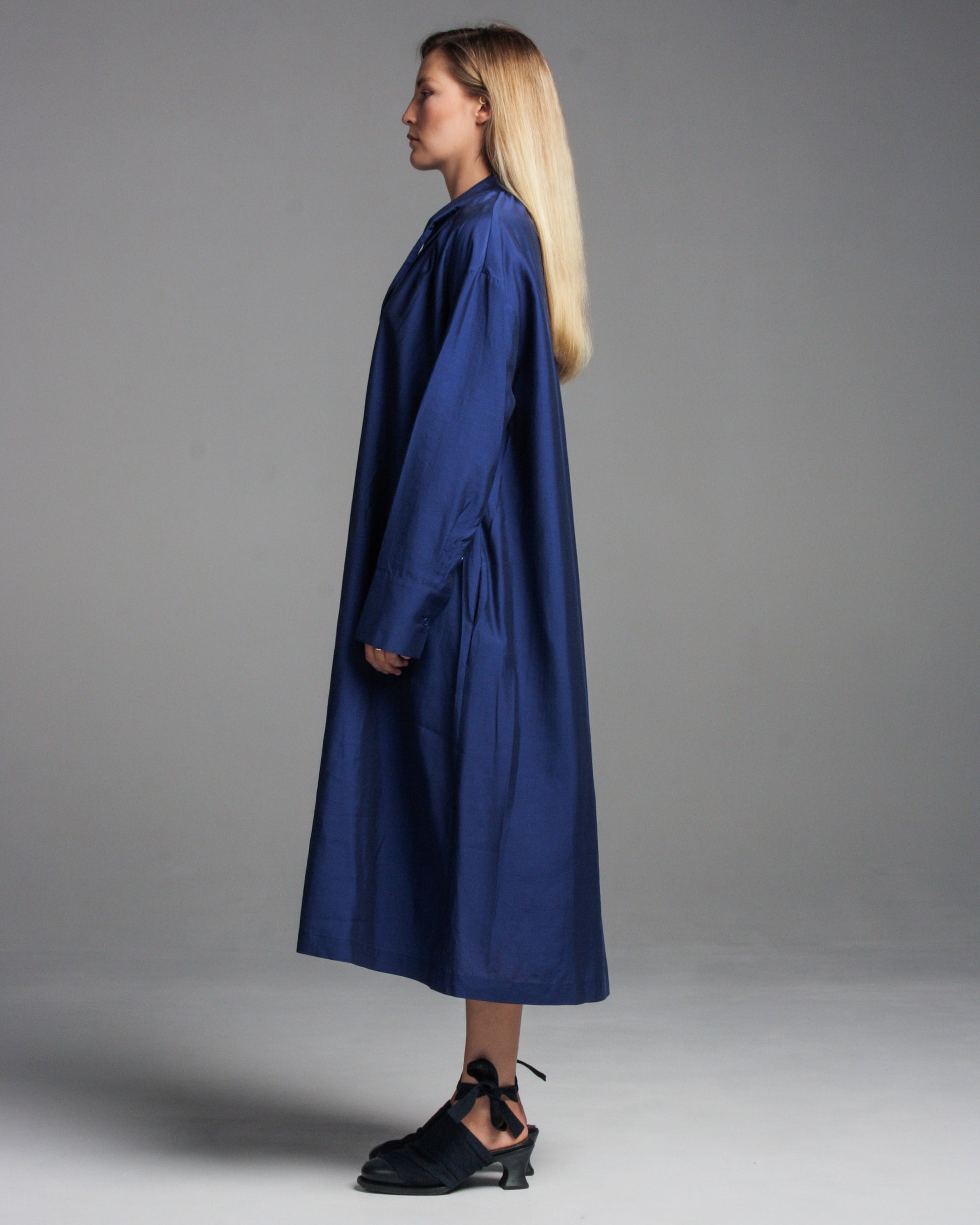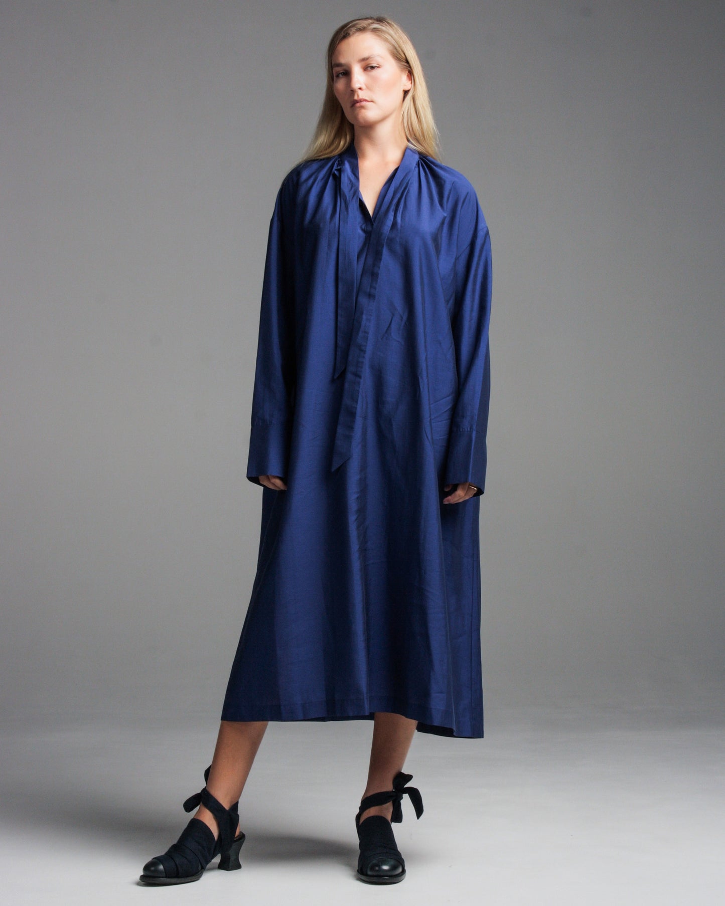 Dianas bow dress by Christian Wijnants. Long sleeve tunic style dress featuring a fanciful collar tie. Crafted from a lightweight lyocell blend with a dark sheen. Generous volume finished with a straight hemline.