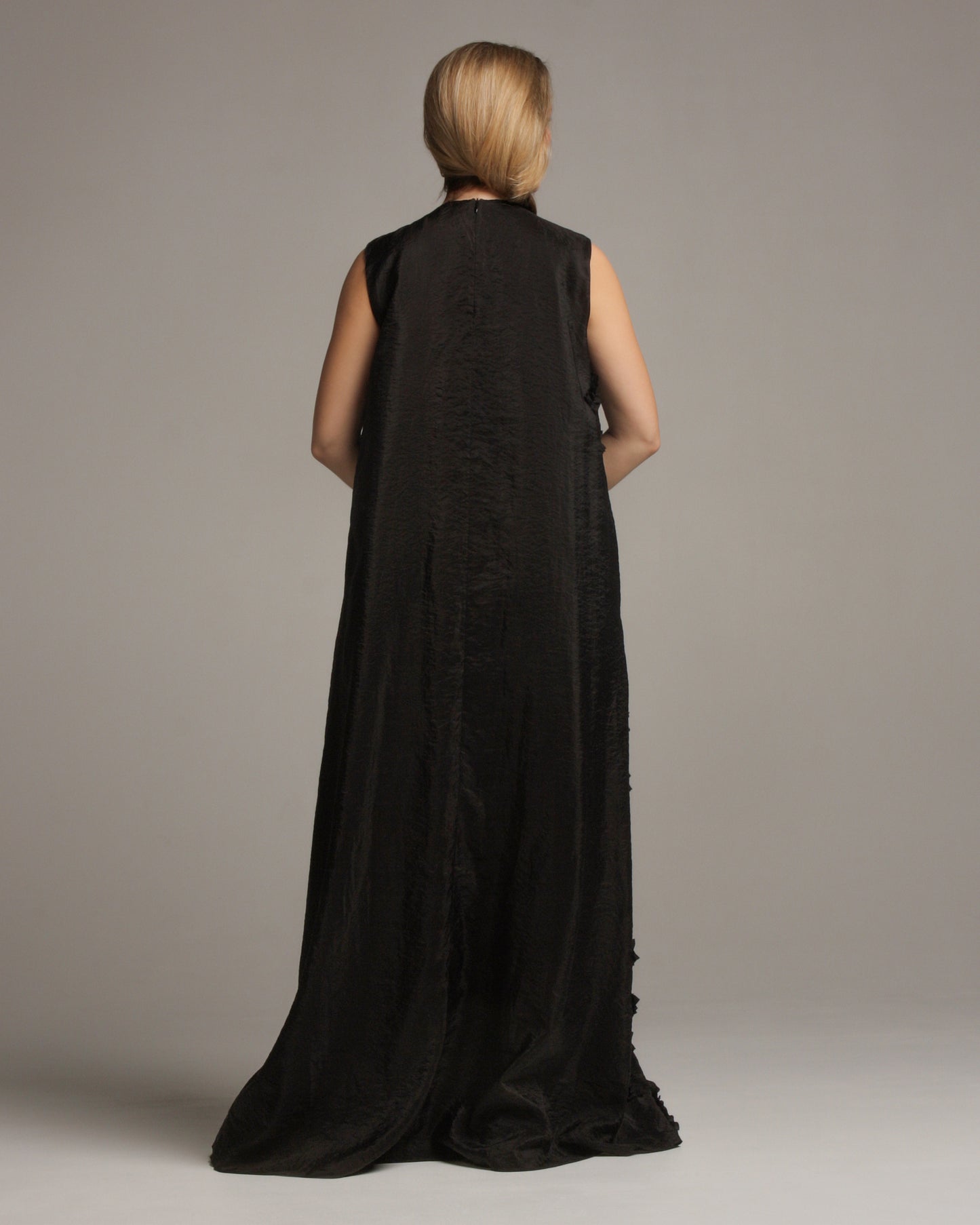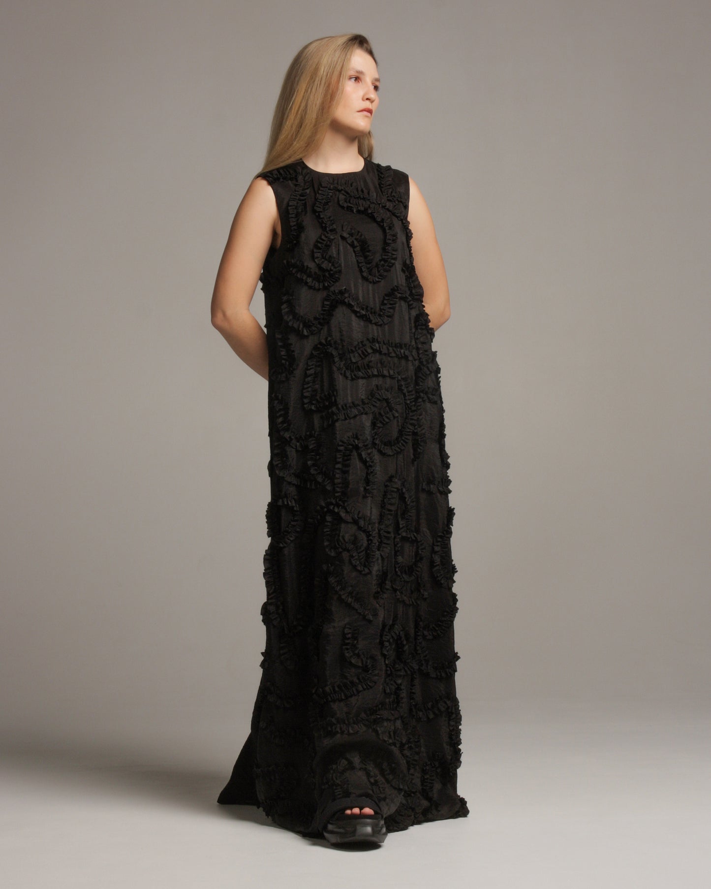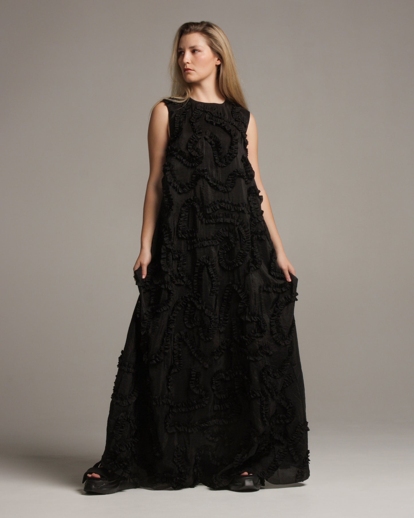 Dilania sleeveless dress by Christian Wijnants. An impressively bold dress finishing in a pronounced floor length for dramatic effect. Elaborated by frilled appliqué details spiralling organically across the entire front. Sleeveless tank style is fitted at the shoulders before opening up to a generous volume, with lightweight cupro blend construction offering a stunningly dark brilliance.