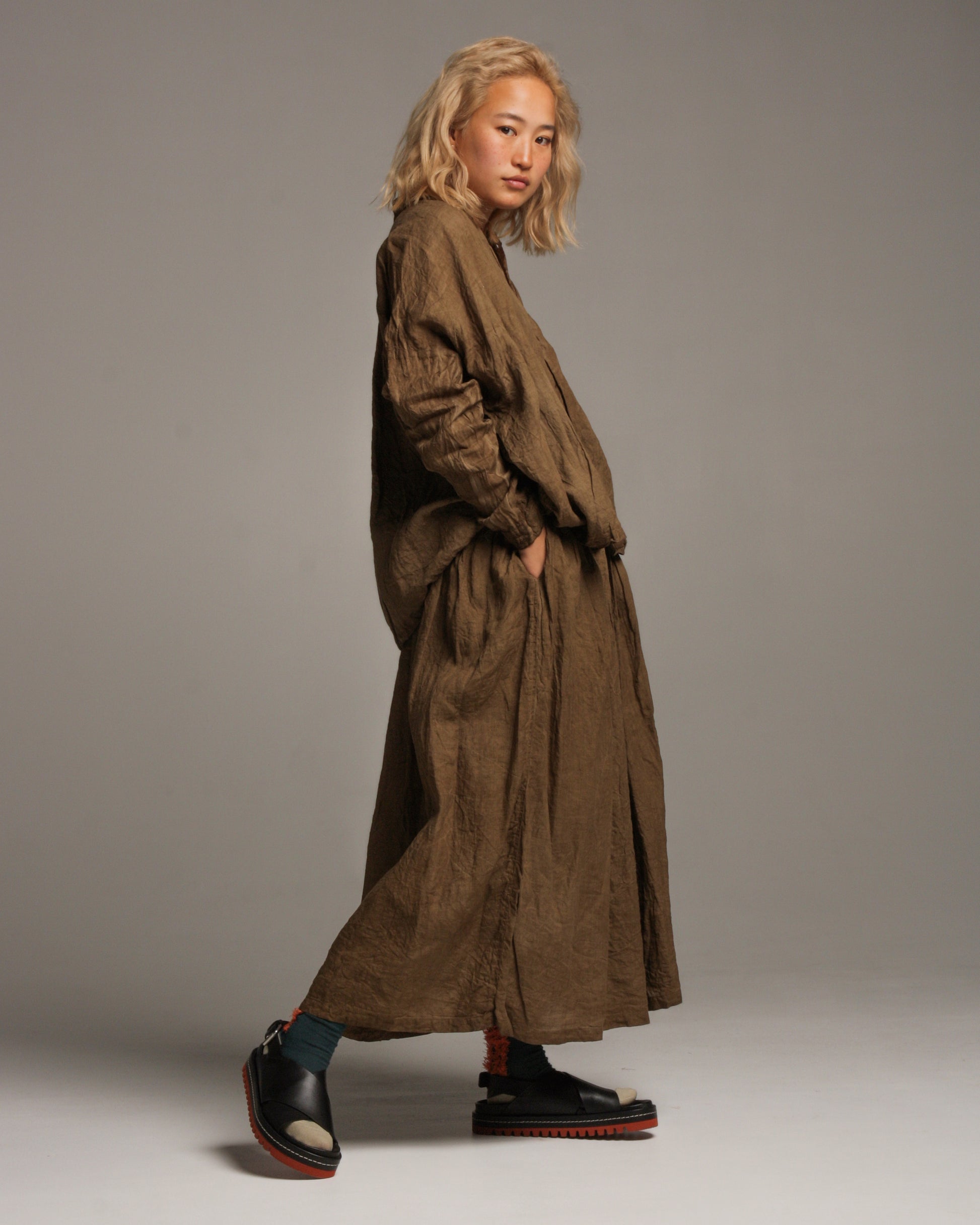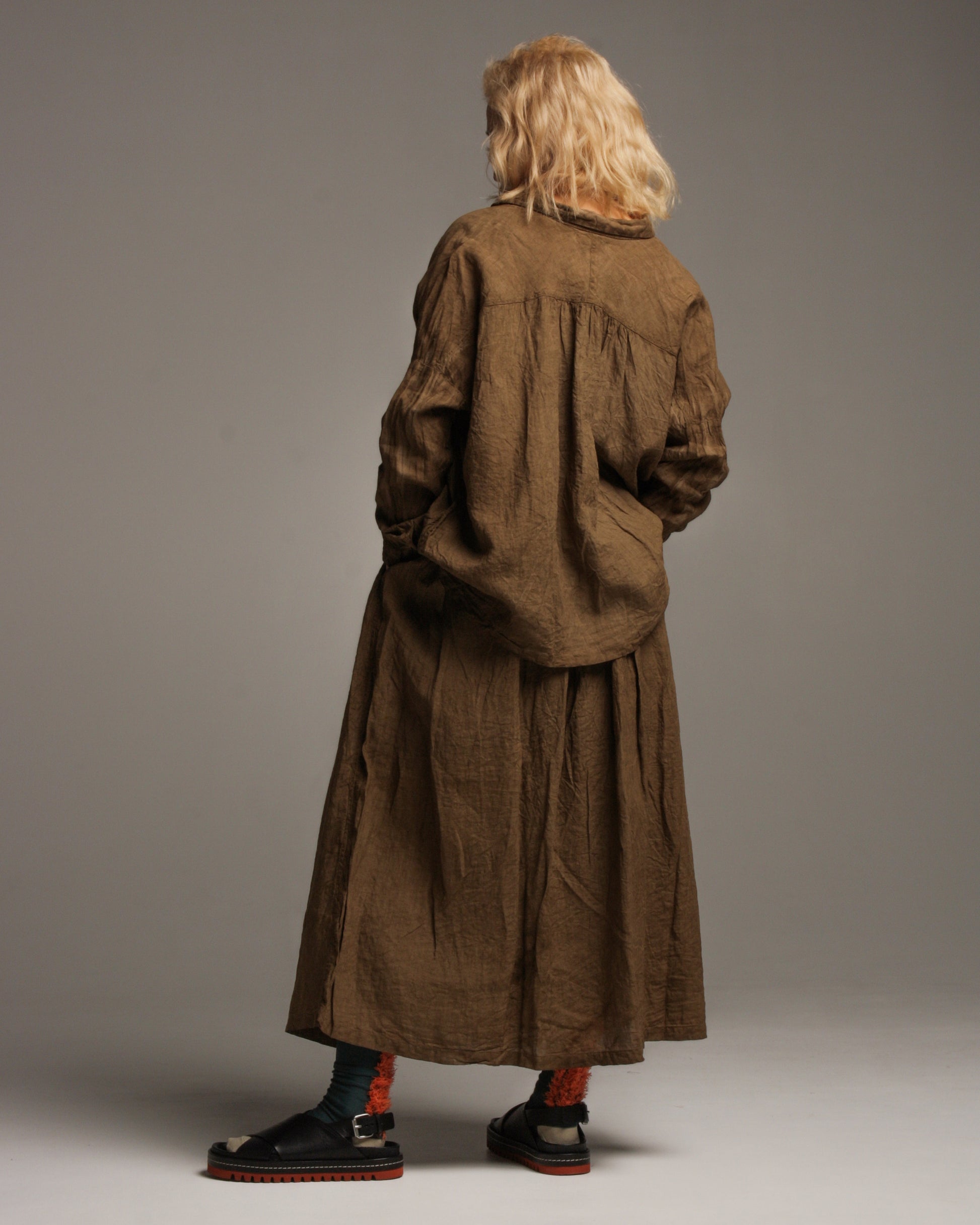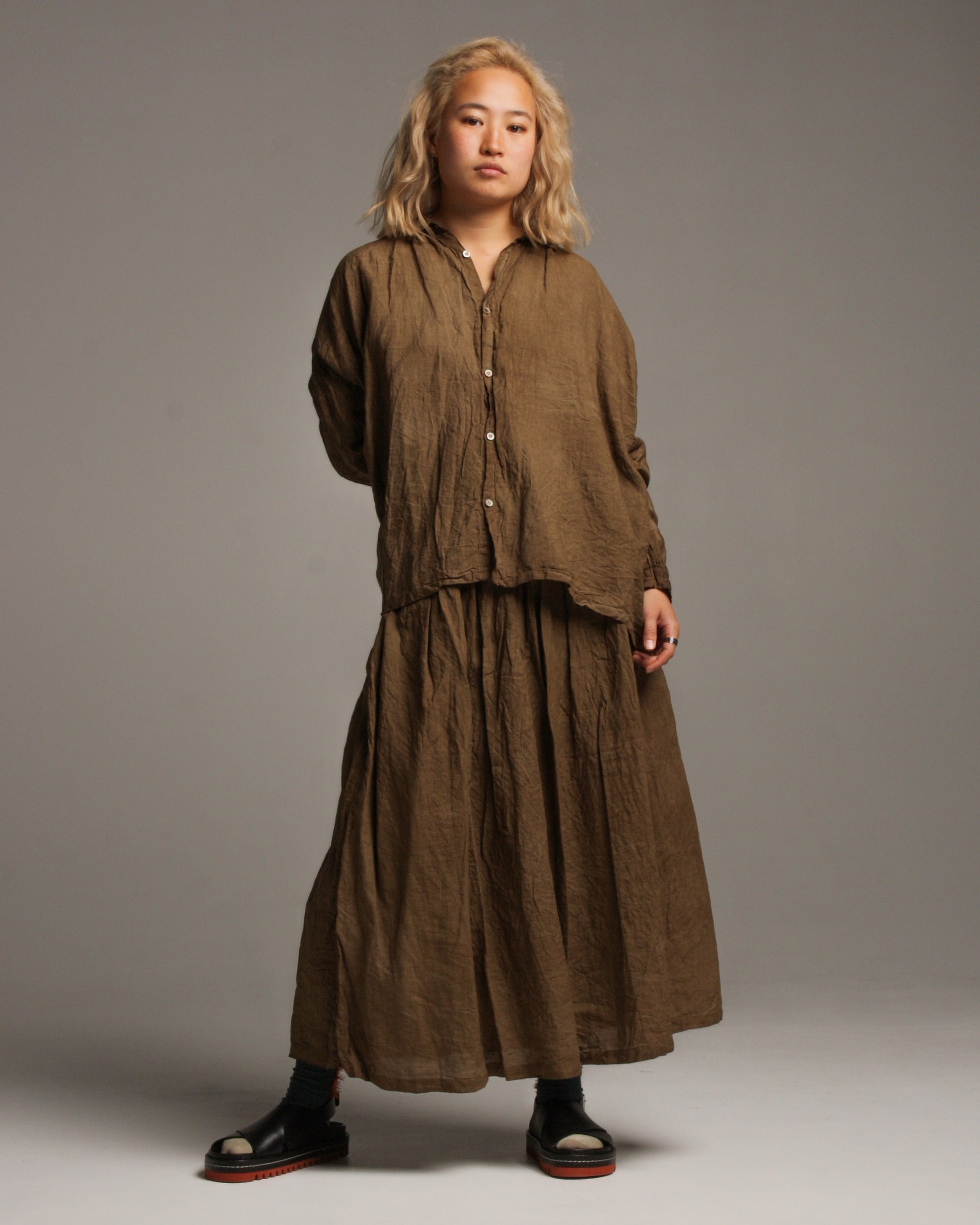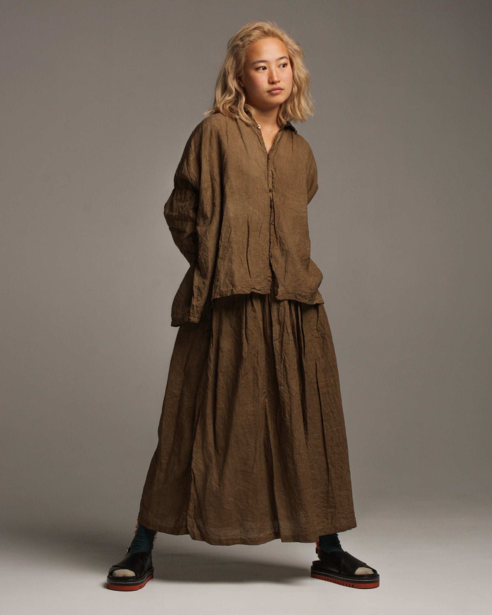 Doro hand dyed linen skirt by Ichi Antiquités in brown. Comfortable and effortlessly wearable skirt crafted from organically crinkled linen, rendered in a rustic hand-dyed shade of earthy brown. Gathering at the elastic drawstring waist swells out to a generous volume to create an enduring, nostalgic silhouette.