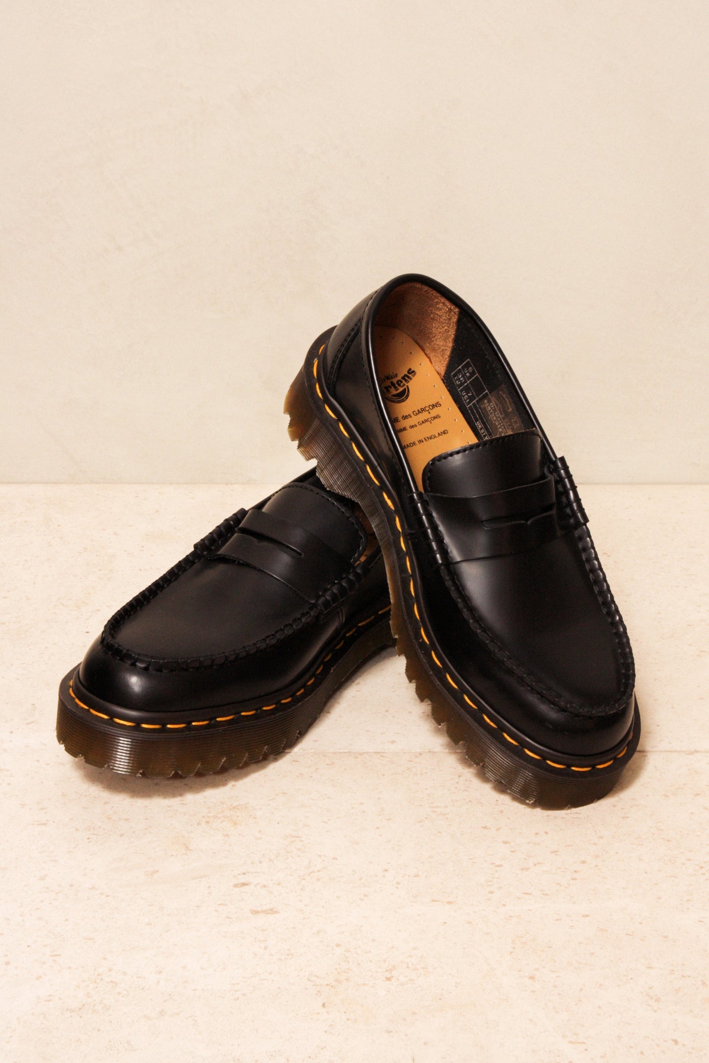 Comme Des Garçons loafers in collaboration with 90s cult favourite, Dr Martens. Feature rubber sole, leather upper in a sturdy platform loafer style, a timeless and classic shoe with a subtle punk aeshetic.