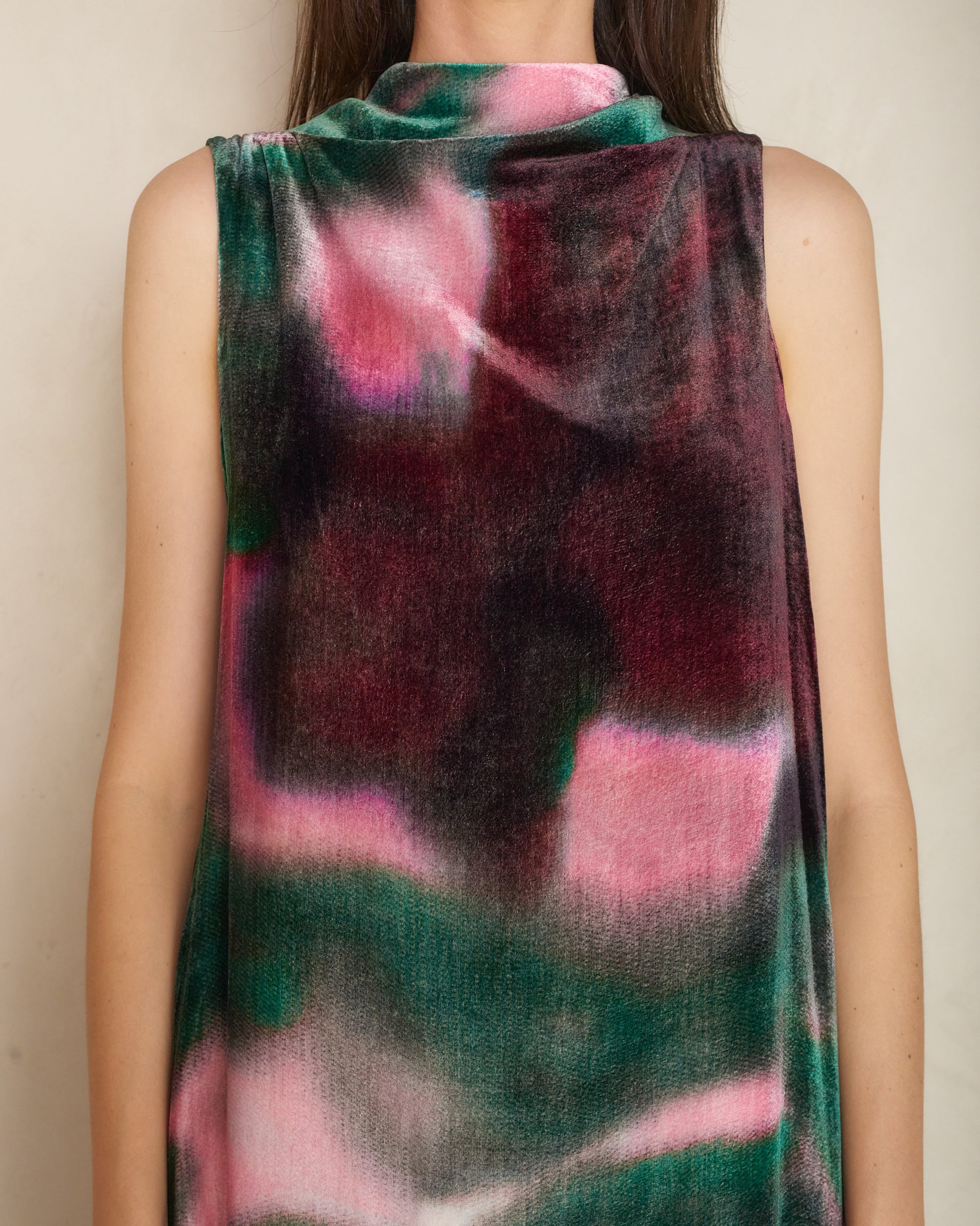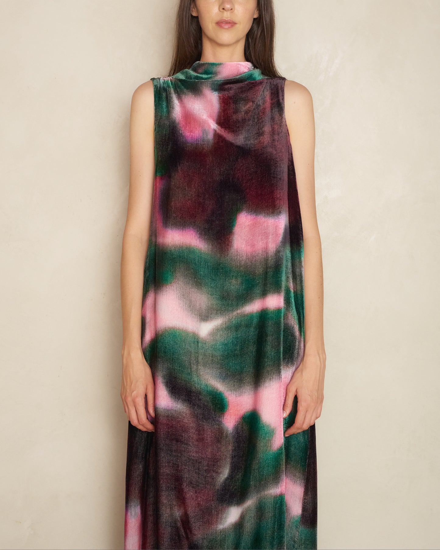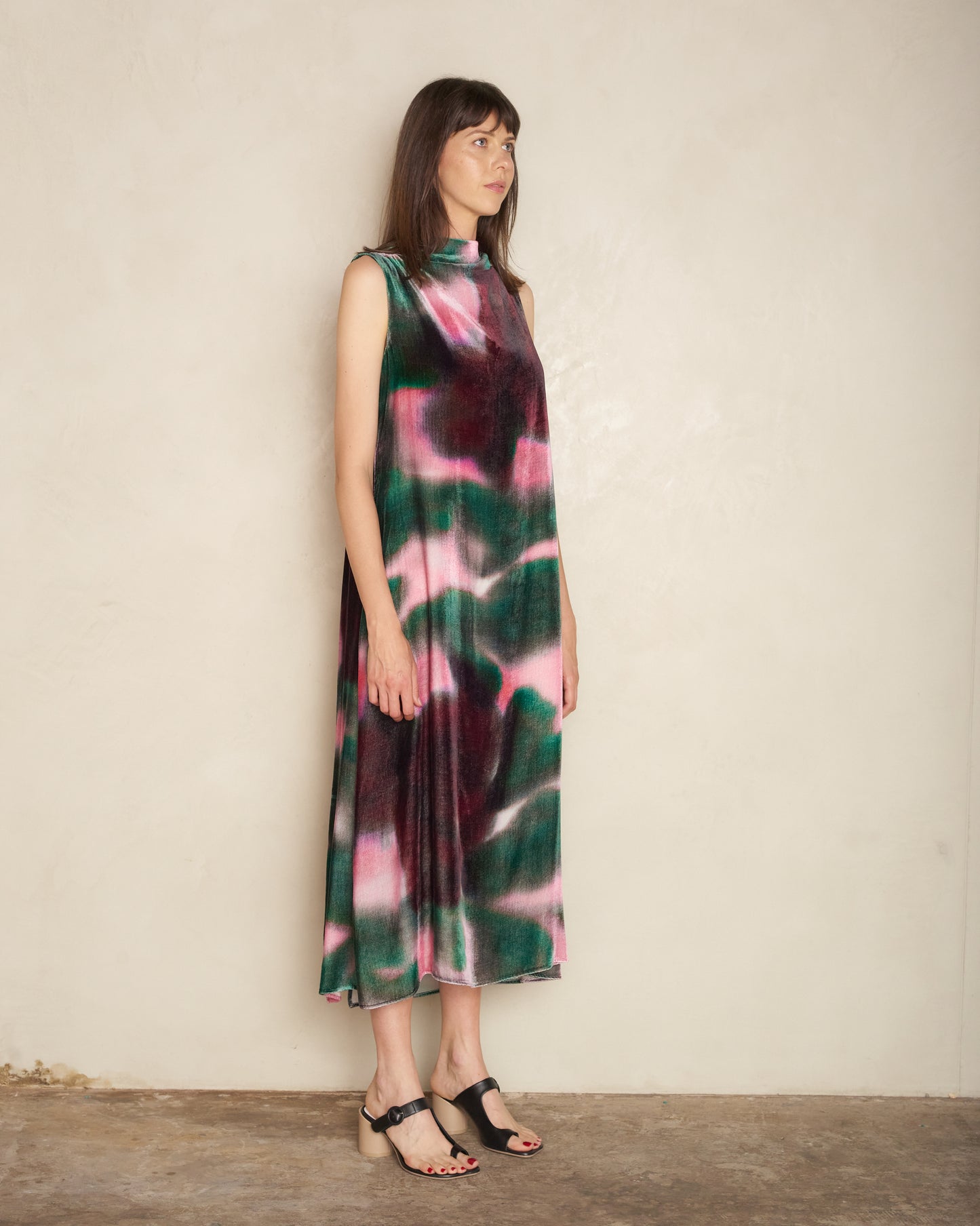 Landscape rouge sleeveless dress by Christian Wijnants. Sleeveless style with draped cowl neckline. Vibrantly abstract floral patterning staged on a languorous velvet silk blend. Zip fastening at the rear follows an extra draped panel to fall to an asymmetric slit and generous hem.