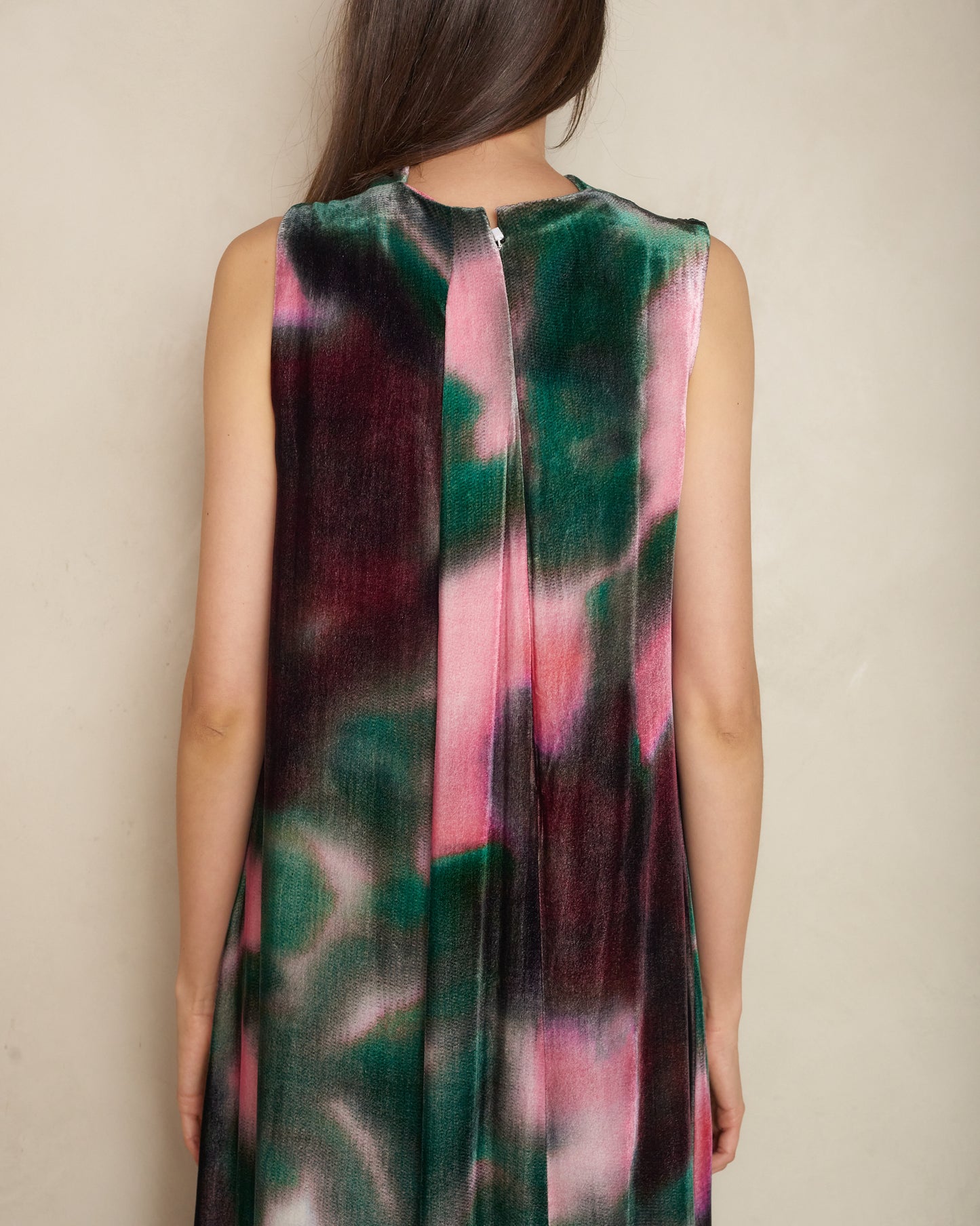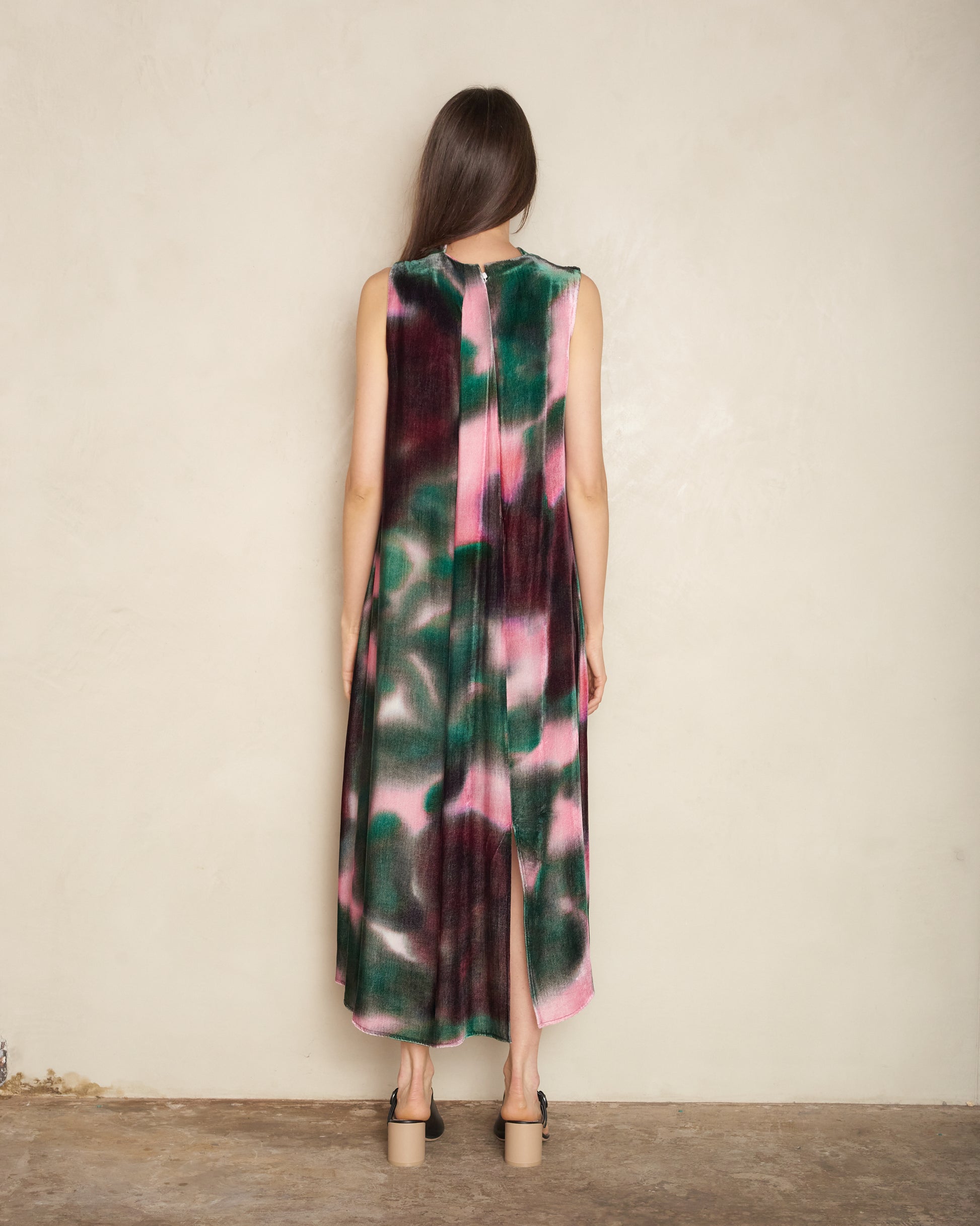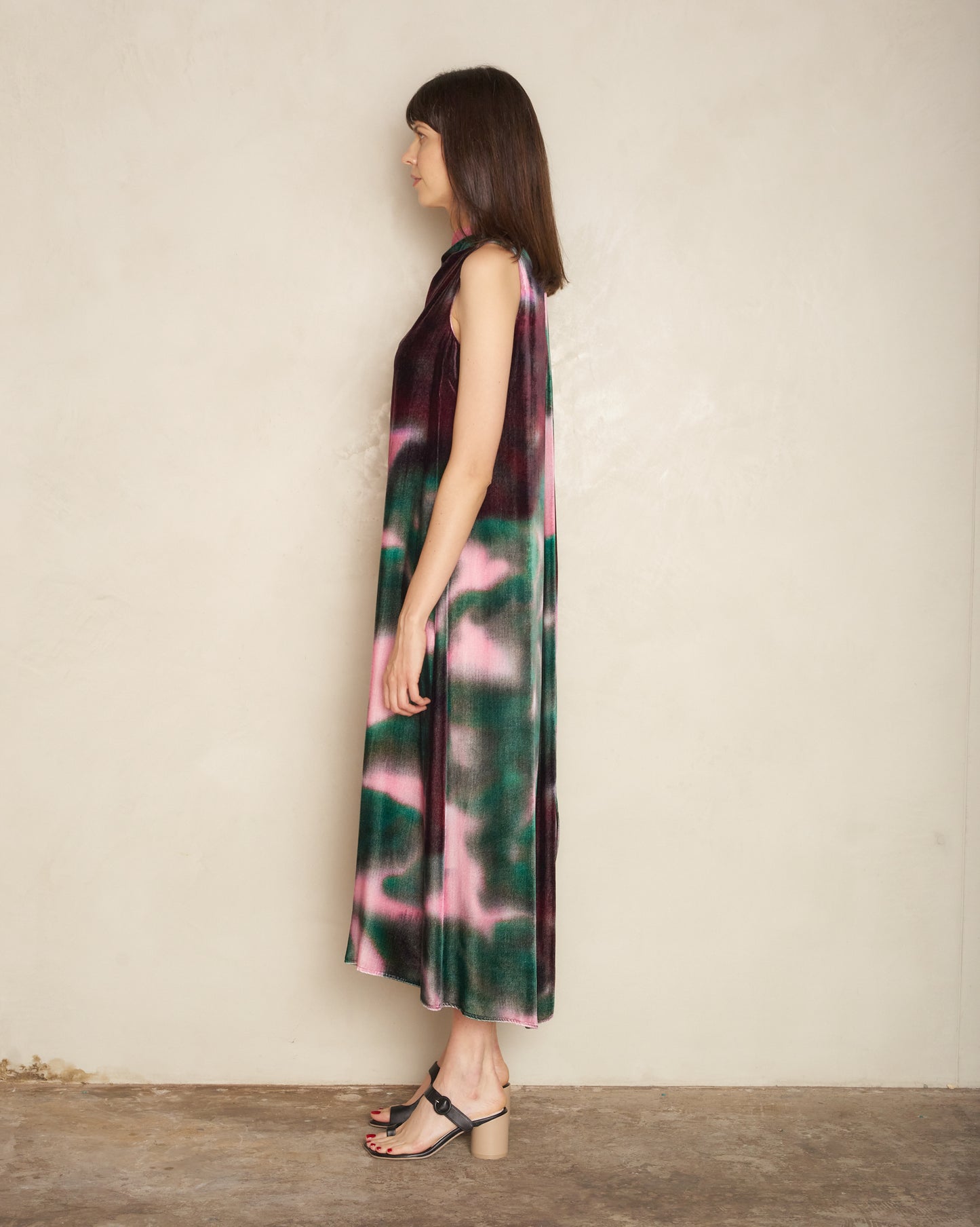 Landscape rouge sleeveless dress by Christian Wijnants. Sleeveless style with draped cowl neckline. Vibrantly abstract floral patterning staged on a languorous velvet silk blend. Zip fastening at the rear follows an extra draped panel to fall to an asymmetric slit and generous hem.