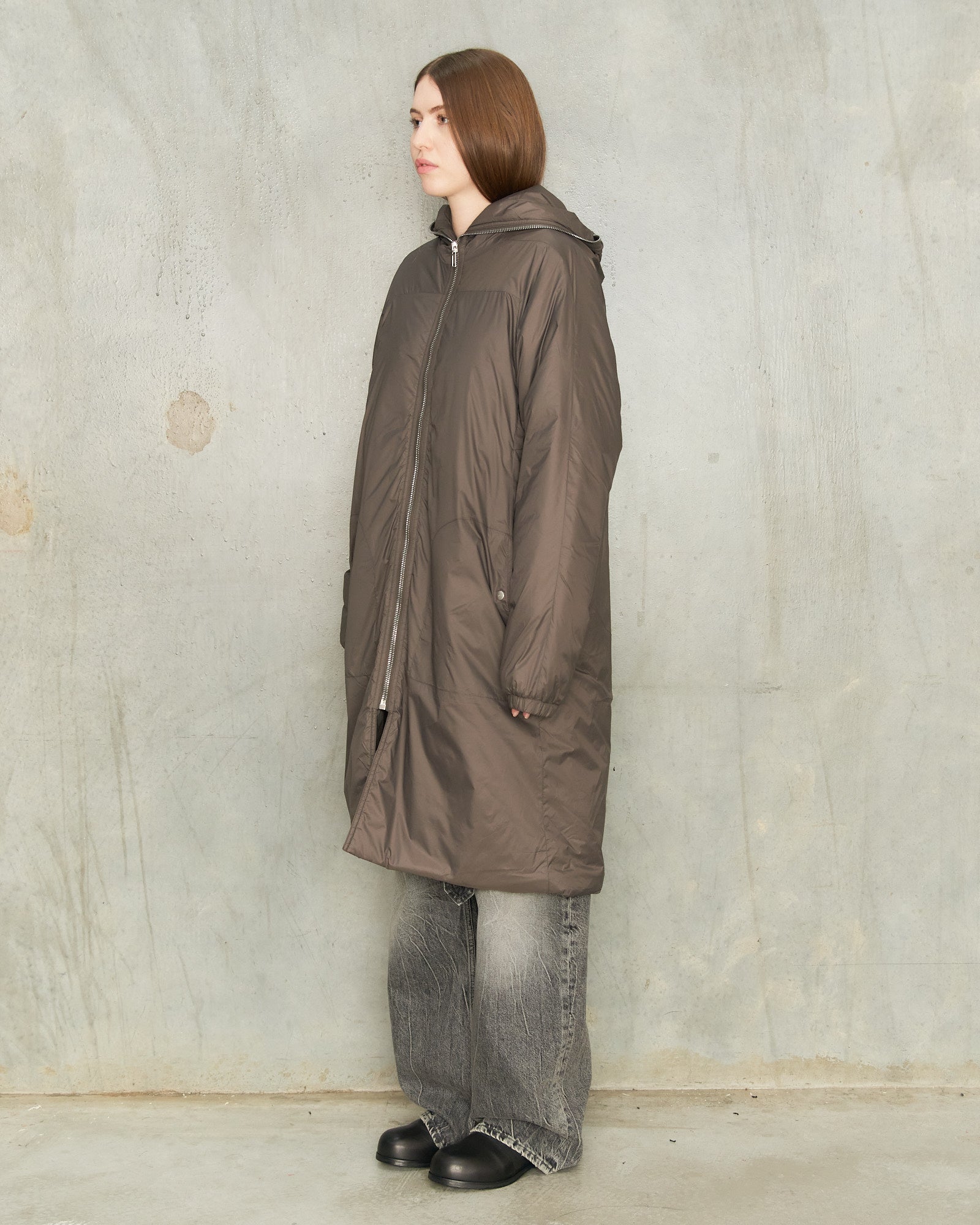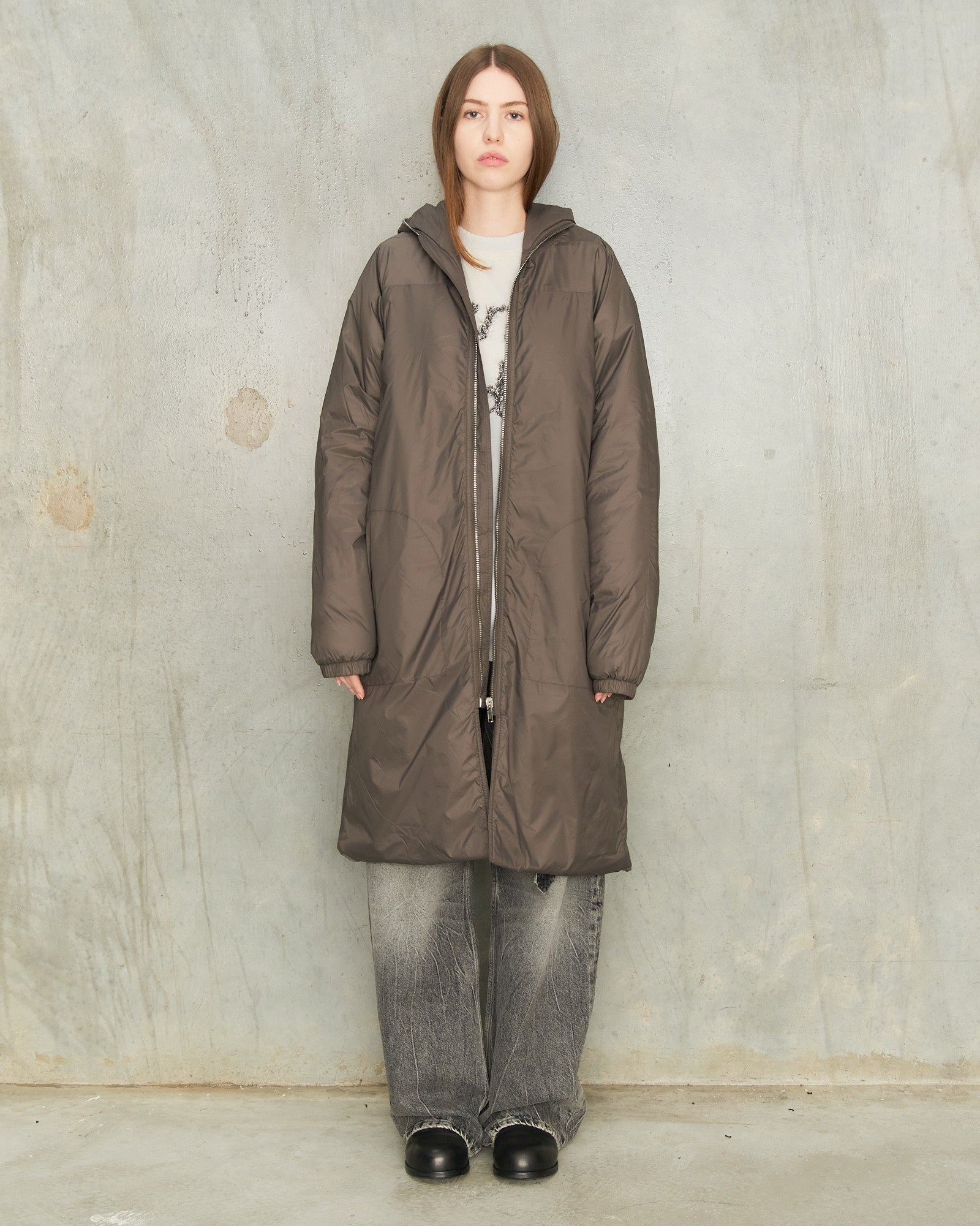 Windbreaker coat by Rick Owens DRKSHDW in bronze. Knee-length padded coat crafted from lightweight nylon for an airy, insulated feel. Designed with a hood and a full-length front zip that extends all the way to the top of the hood. Features both outer and inner pockets secured with metal press-stud closures.