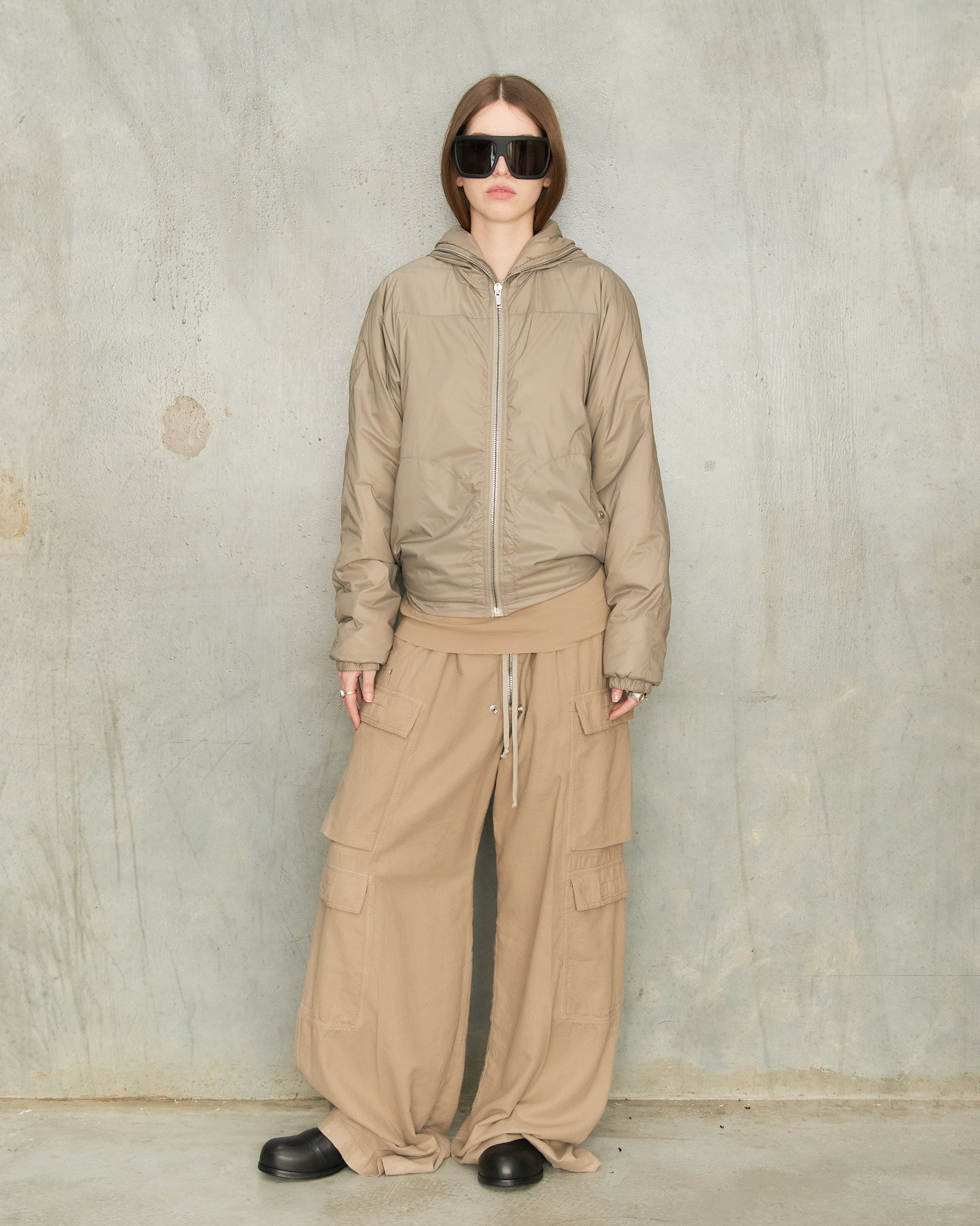 Padded windbreaker by Rick Owens DRKSHDW in dirty pearl. Lightweight nylon padded windbreaker designed for an airy, insulated feel. Finished with a hood and a full-length front zip that extends all the way to the top of the hood. Features both outer and inner pockets secured with metal press-stud closures, and an elasticated back hem for a comfortable, secure fit.