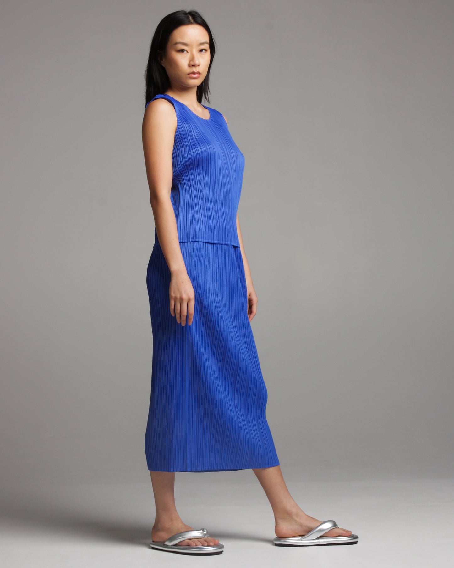 Pleated straight skirt by Pleats Please Issey Miyake in electric blue. Classic straight shape with signature pleating, emphasised by a brilliant blue. An easy to wear skirt to breathe sophisticated vitality into any outfit.