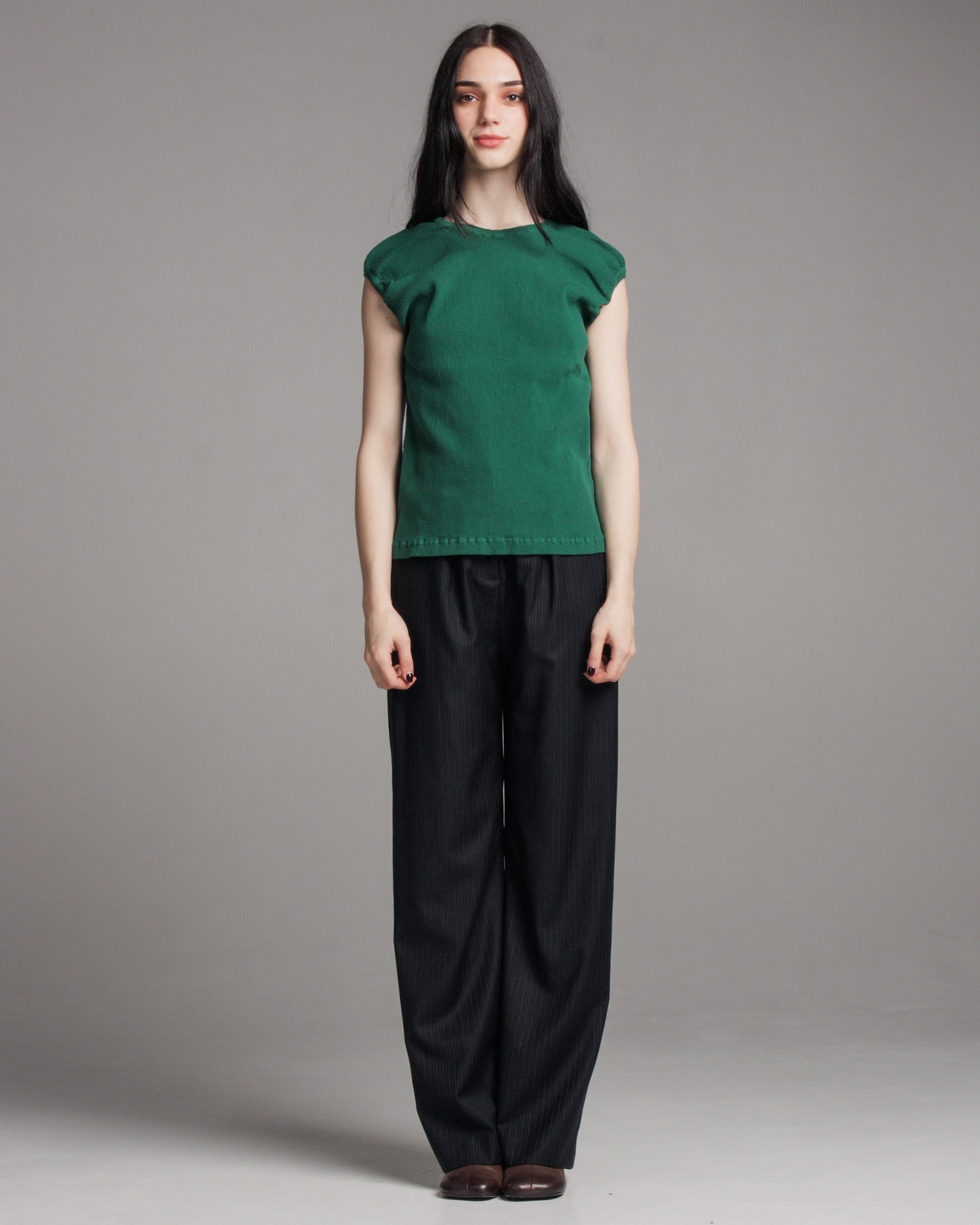 Sleeveless knit top by Issey Miyake ME in green. Round neck French sleeve shirt using jacquard techniques to create a knit-like three-dimensional effect. Crafted from a cotton blend with elasticity and featuring a softly rounded silhouette.