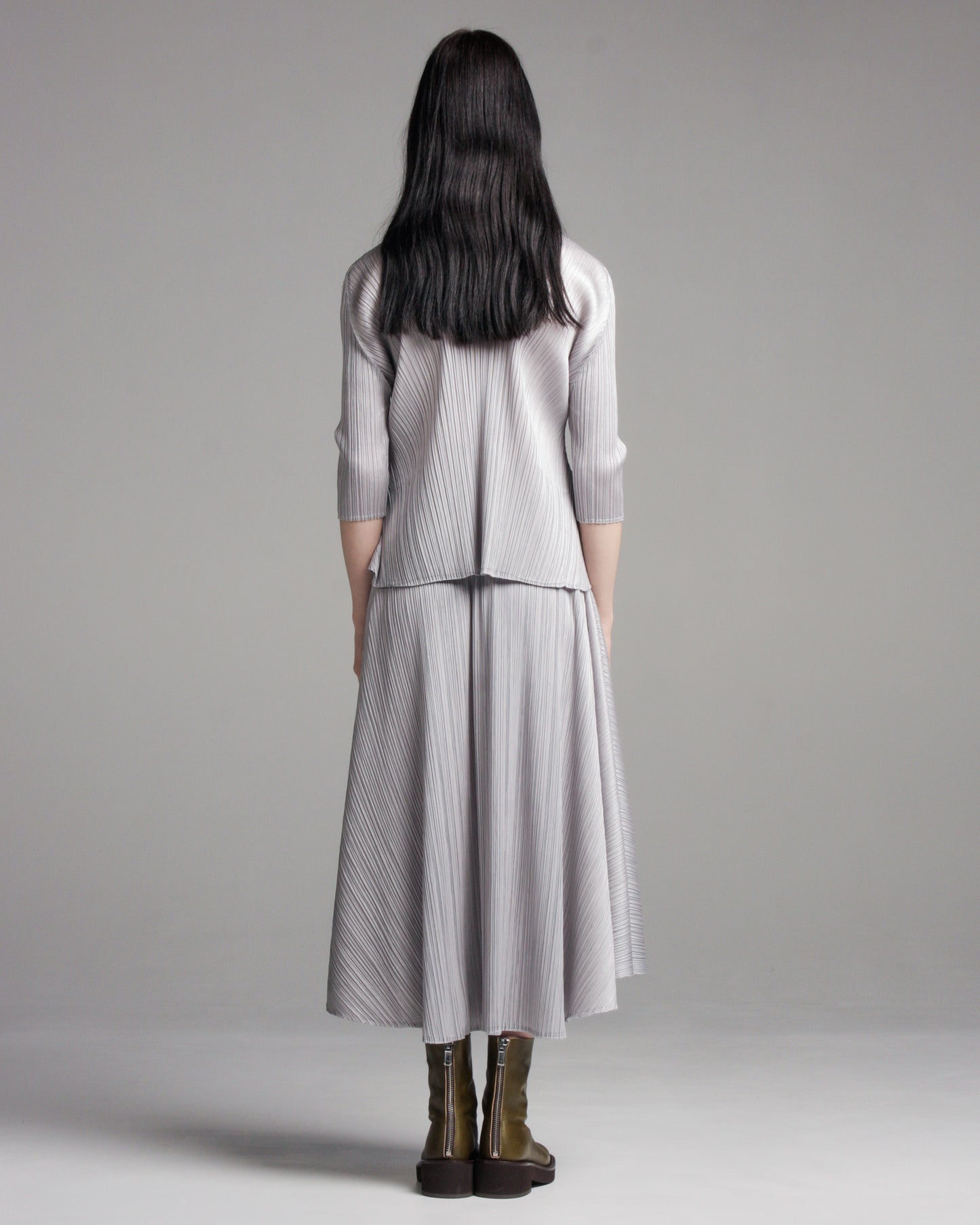 Full pleated skirt by Pleats Please Issey Miyake in grey. Voluminous full length in sleek silver vertical pleating. Expansive panels meet with inverted seams to drape extravagantly at each side.